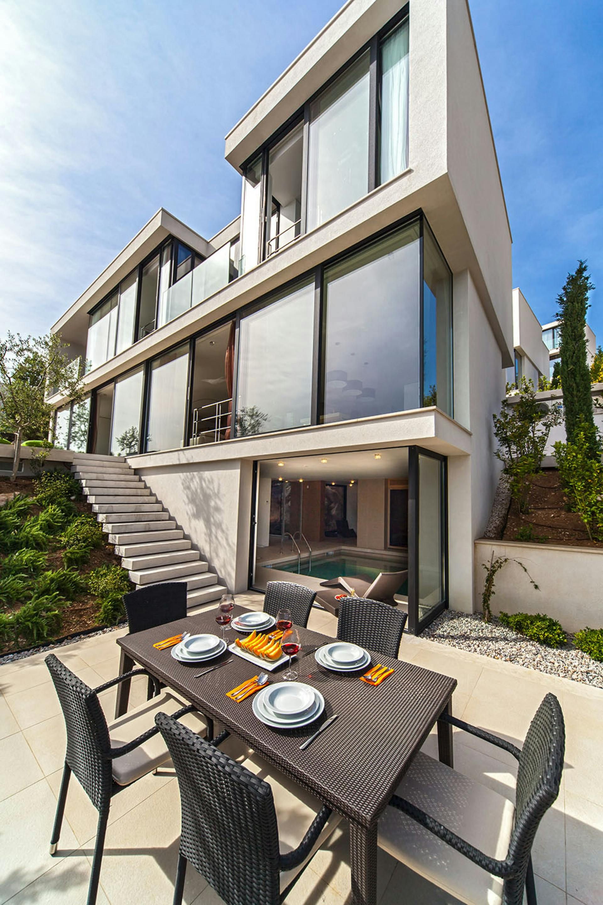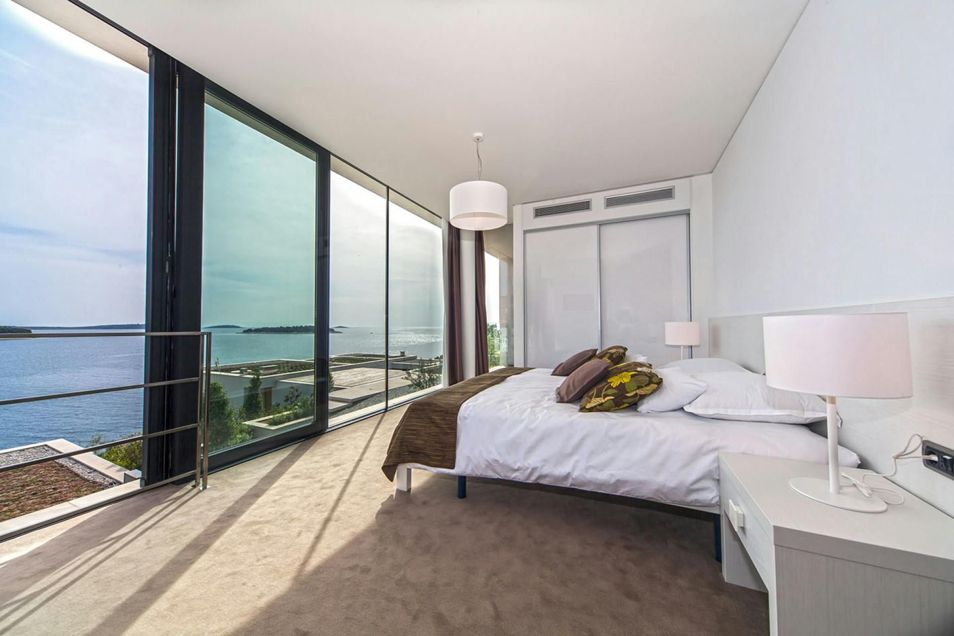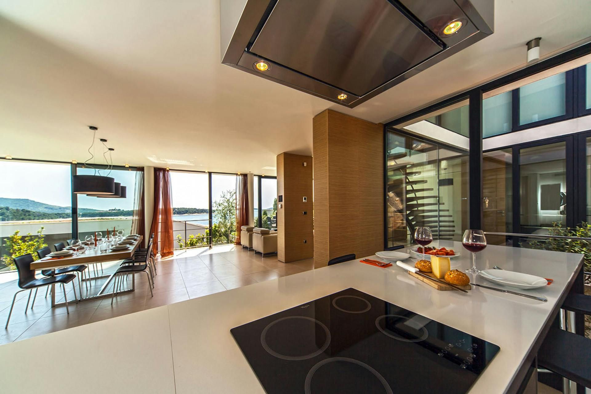 This luxurious sea-view villa is the perfect holiday spot for those seeking a high-end getaway. It boasts a swimming pool and loungers under the open sky. Guests can also enjoy the view from the glass terrace on the upper floor while grilling on the barbecue. The interior is an architectural eye-catcher with stylish and high-quality design. The living areas are light-flooded and feature beautifully designed furniture. The villa has three elegantly appointed bedrooms with exquisite en-suite bathrooms. The upper hallway opens to a glass terrace with magnificent sea views. There's also a sauna with a shower and an indoor bike for fitness enthusiasts. The resort property is fenced and video monitored and offers various service offers such as an airport transfer, cleaning or breakfast service, bike rental or great excursion offers. The villa's location is ideal for those who want to enjoy luxury in a relaxing environment while still having access to nearby destinations like Trogir, Split, Šibenik, national parks Paklenica, Krka, Kornati, and Zadar.