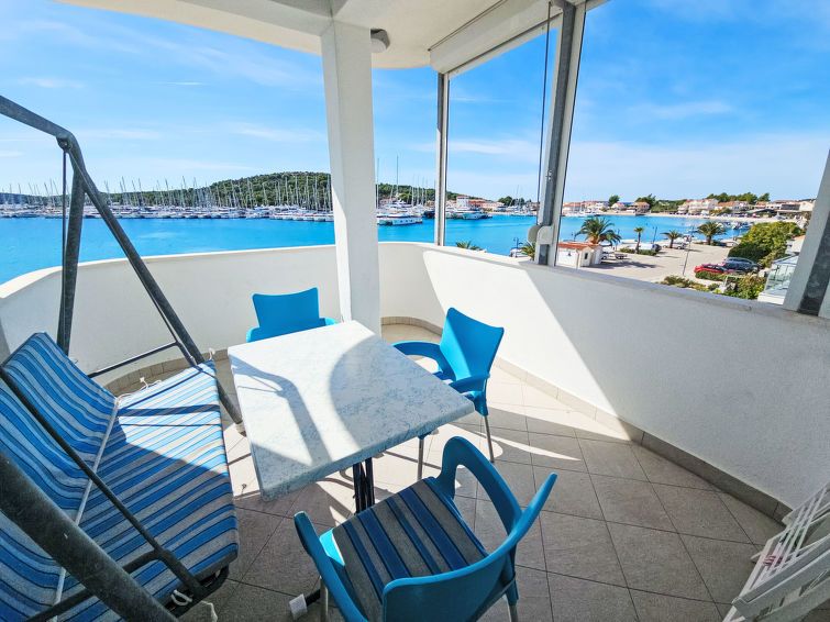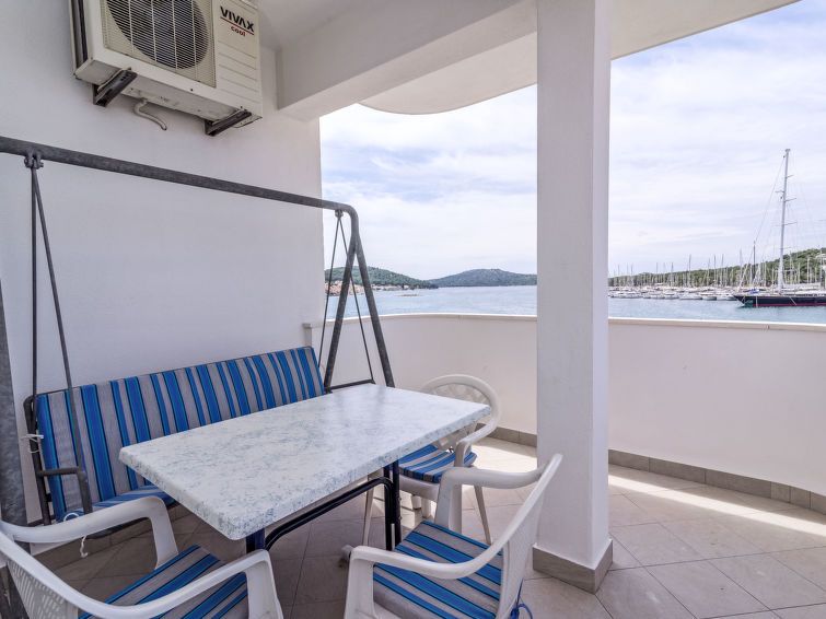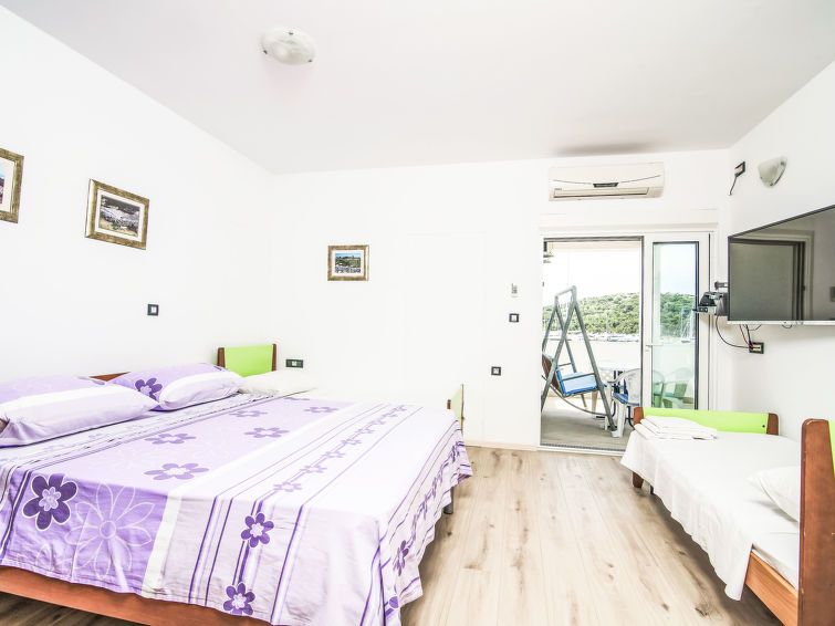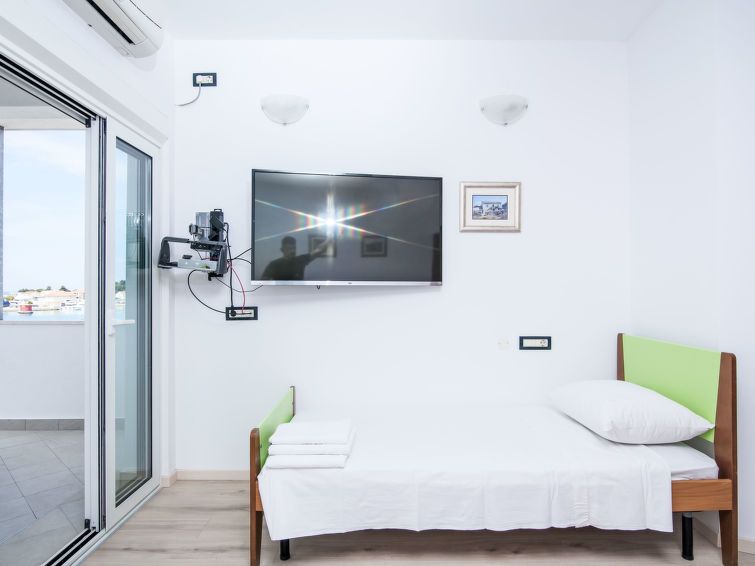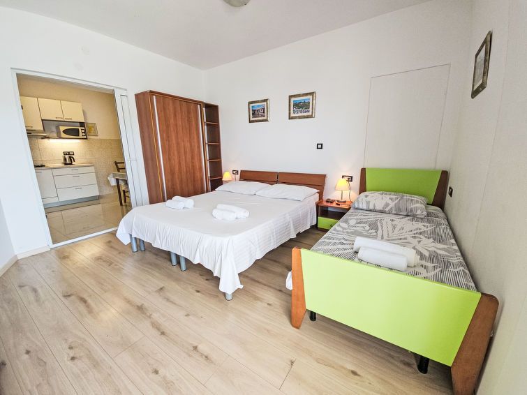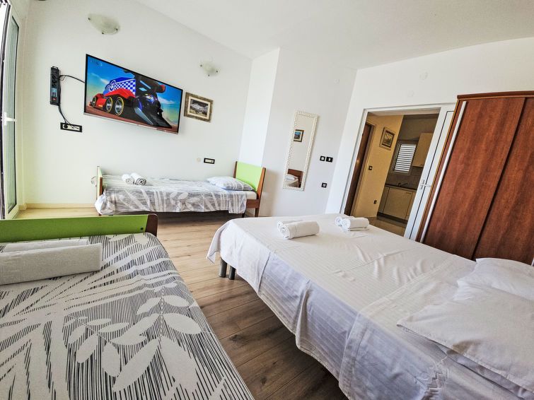 "A5", 2-room apartment 40 m2 on 3rd floor, south facing position. 1 room with 2 beds (80 cm, length 200 cm), 1 double bed (2 x 80 cm, length 200 cm), satellite TV (flat screen), air conditioning. Exit to the terrace. Kitchen (4 hot plates, kettle, microwave, freezer). Exit to the terrace.