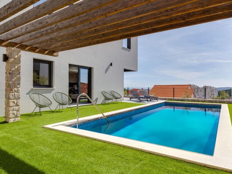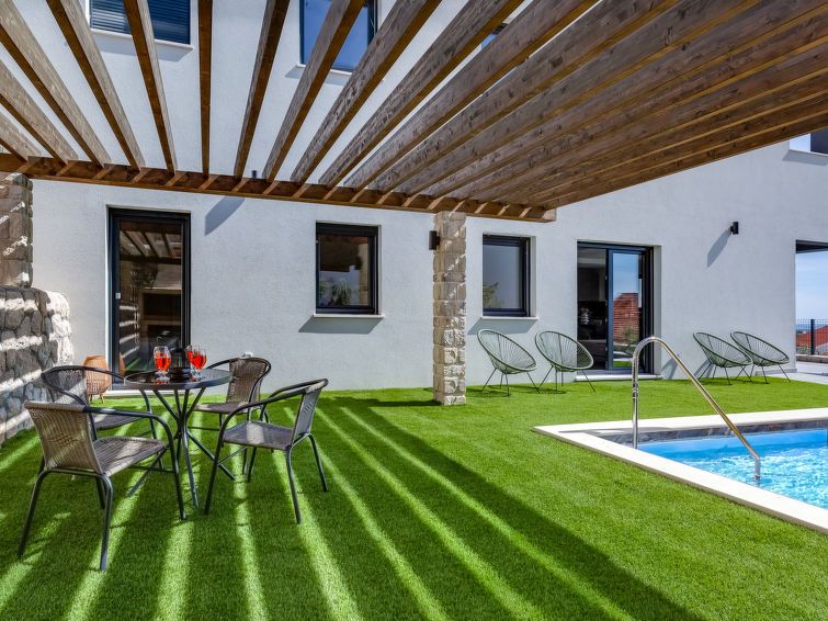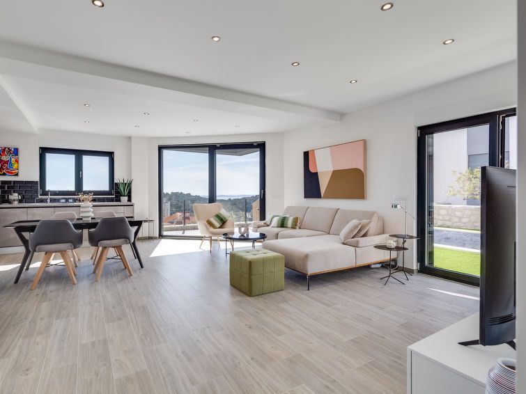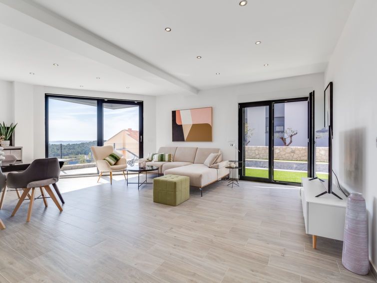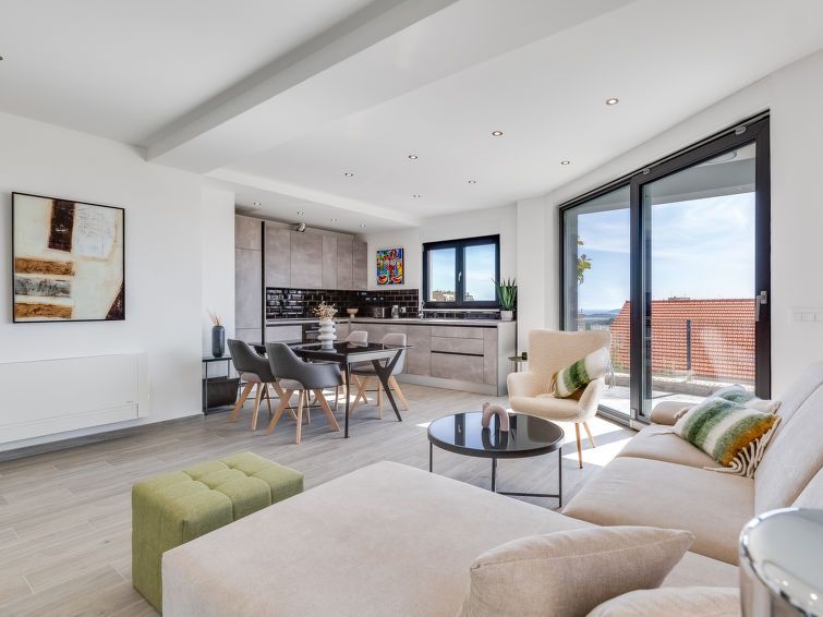 4-room apartment 88 m2, on the ground floor, north-west facing position. Living/dining room with satellite TV (flat screen), air conditioning and electric shutters. Exit to the terrace. 1 room with 1 french bed (160 cm, length 200 cm), air conditioning and electric shutters. Exit to the swimming pool.