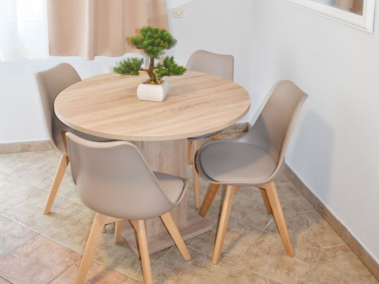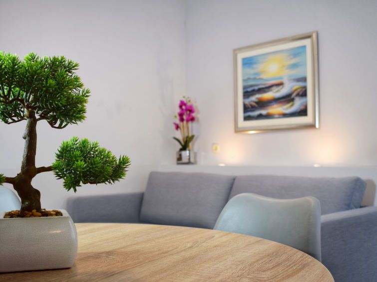 2-room apartment 36 m2 on 1st floor. Living/dining room with satellite TV and air conditioning. 1 room with 1 double bed (2 x 80 cm, length 200 cm). Exit to the balcony. Open kitchen (2 hot plates, oven, kettle, electric coffee machine). Shower/WC. No heating option. Balcony 6 m2.