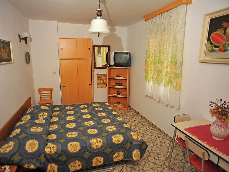 1-room apartment 32 m2, on the ground floor, south facing position. Studio with 1 double bed (2 x 90 cm, length 200 cm), satellite TV. Exit to the terrace. Open kitchen (4 hot plates, oven, freezer) with dining table. Shower/WC. Terrace 30 m2. Terrace furniture. Facilities: Internet (WiFi, free).