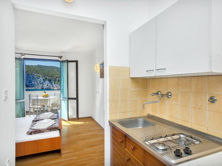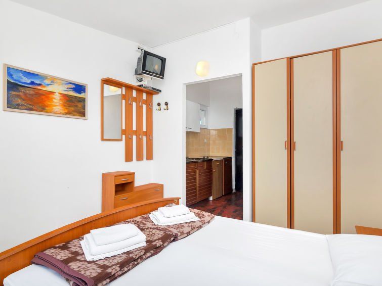 1-room apartment 16 m2 on 3rd floor, west facing position. Studio with 1 french bed (150 cm, length 200 cm), dining table, satellite TV and air conditioning. Exit to the balcony. Open kitchen (2 hot plates). Shower/WC. Air-conditioning (extra). Balcony 5 m2. Balcony furniture. Marvellous view of the sea.