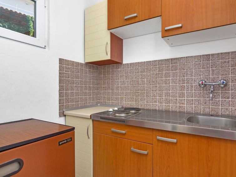 1-room apartment 22 m2 on 2nd floor, east facing position. Studio with 1 double bed (2 x 80 cm, length 200 cm), dining table, satellite TV and air conditioning. Exit to the balcony. Open kitchen (2 hot plates). Shower/WC. Air-conditioning (extra). Balcony 6 m2. Balcony furniture. View of the garden.