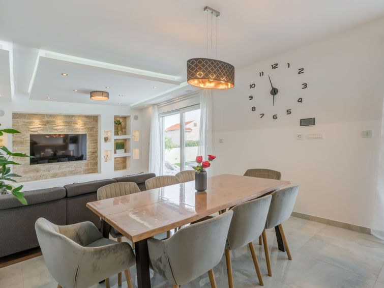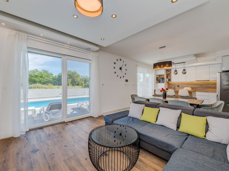5-room villa 164 m2. Living/dining room with satellite TV and air conditioning. Exit to the terrace. 1 room with 1 french bed (160 cm, length 200 cm), satellite TV and air conditioning. Open kitchen (oven, dishwasher, 4 induction hot plates, toaster, microwave, freezer, electric coffee machine).