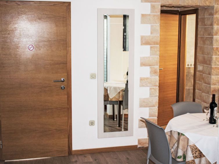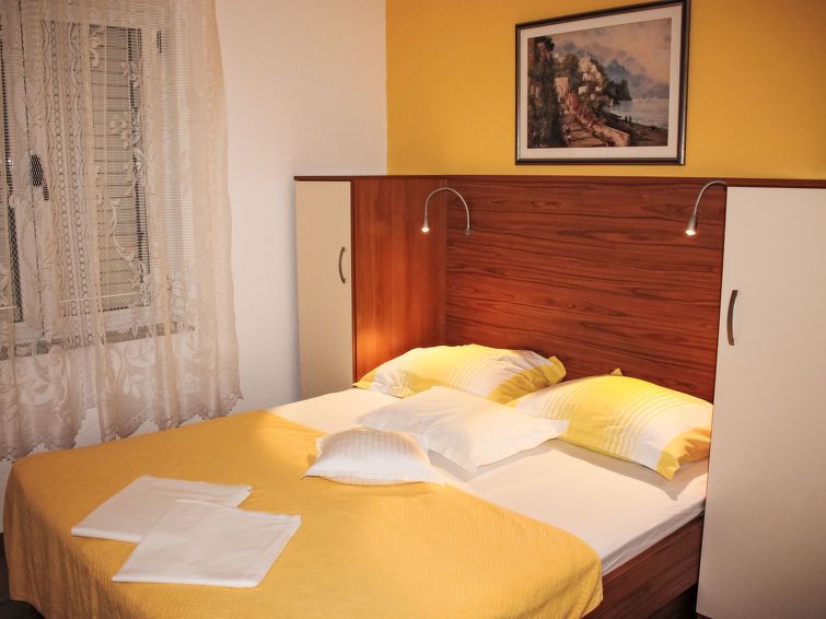 2-room apartment 45 m2 on 1st floor. Living/sleeping room with 1 bed (90 cm, length 200 cm), satellite TV and air conditioning. Exit to the balcony. 1 room with 1 french bed (160 cm, length 200 cm). Open kitchen (2 ceramic glass hob hotplates, kettle, freezer, electric coffee machine) with dining table.