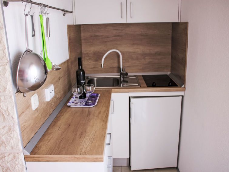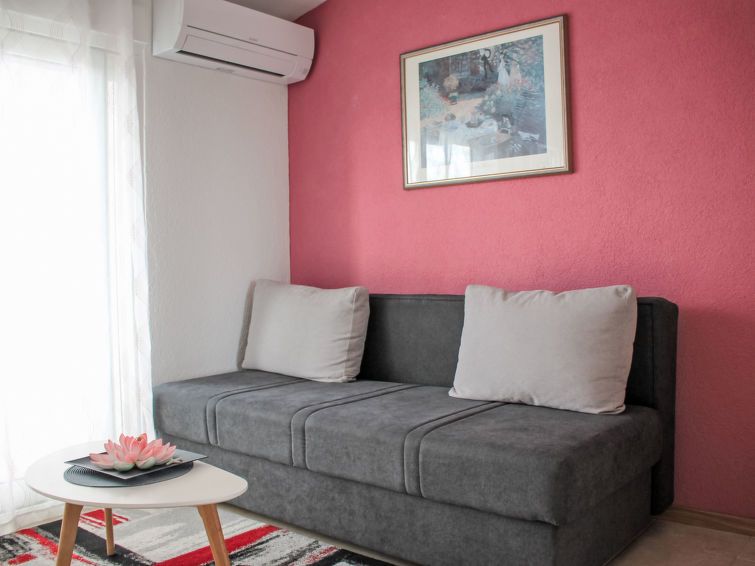 2-room apartment 30 m2 on 2nd floor. Living/dining room with satellite TV and air conditioning. Exit to the balcony. 1 room with 1 french bed (180 cm, length 200 cm). Open kitchen (2 ceramic glass hob hotplates, kettle, freezer, electric coffee machine) with dining table. Shower/WC.
