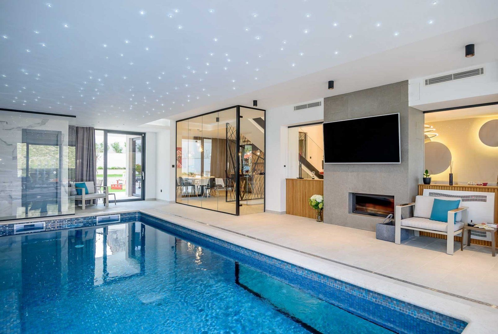 It's luxurious to the max, with striking interiors, superb outdoor space and views to die for. Set over three floors, there's all the living space you could need, with the comfy sofa area divided from the dining and kitchen by the sleek, glass staircase that runs through the centre of the house. And just through some glass doors in the living room, you'll find your indoor pool – making for a practical and unique place to swim at any time of the day or night (or year, for that matter). The basement level is home to a really well-equipped gym and a relaxing sauna, and there's even a games room with a pool table, darts, table football and a PS4. And for smaller children, the garden has a play area and flat lawns to run about on.