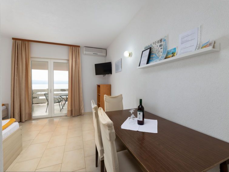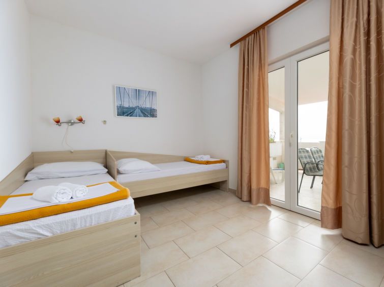 "A1", 2-room apartment 39 m2 on 1st floor, south facing position. Living/sleeping room with 2 beds (90 cm, length 200 cm), satellite TV (flat screen), air conditioning. Exit to the terrace. 1 room with 1 french bed (180 cm, length 200 cm). Open kitchen (4 hot plates, microwave, freezer).