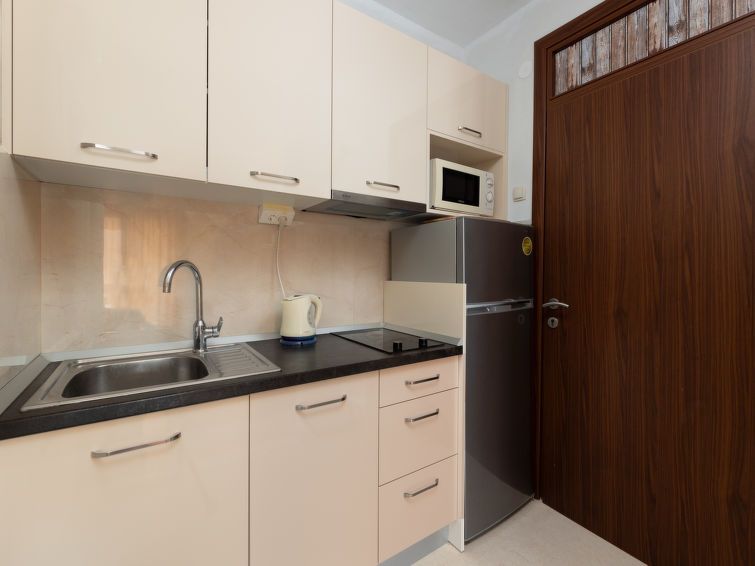 "A2 studio", 1-room studio 22 m2 on 1st floor, south facing position. Living/sleeping room with 1 sofabed (100 cm, length 190 cm), 1 french bed (180 cm, length 200 cm), satellite TV (flat screen), air conditioning. Exit to the terrace. Open kitchen (2 ceramic glass hob hotplates, kettle, microwave, freezer).