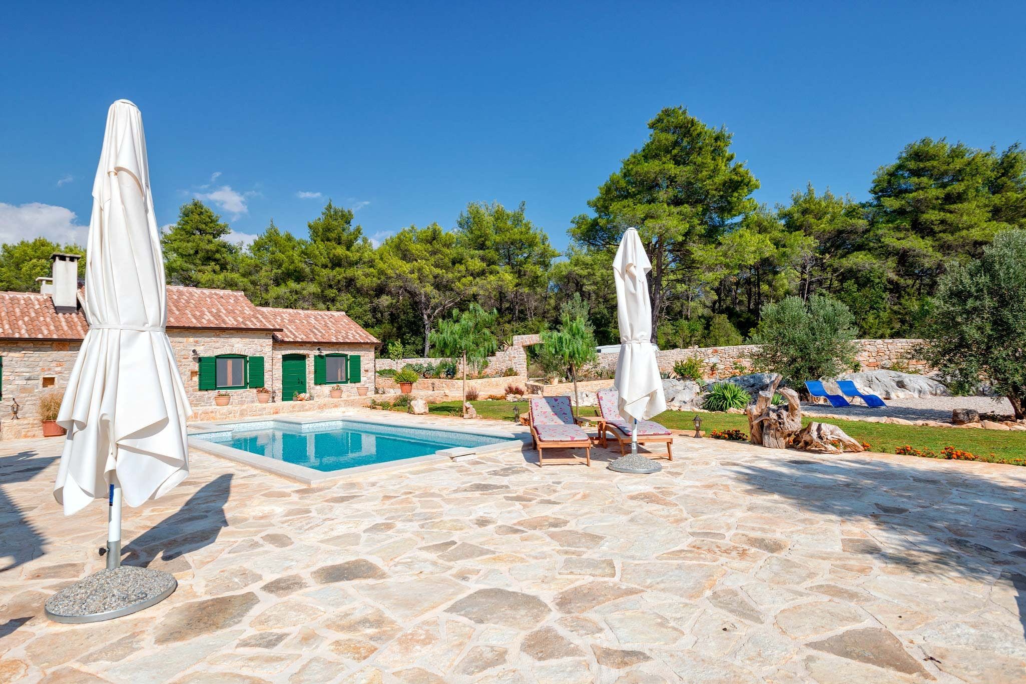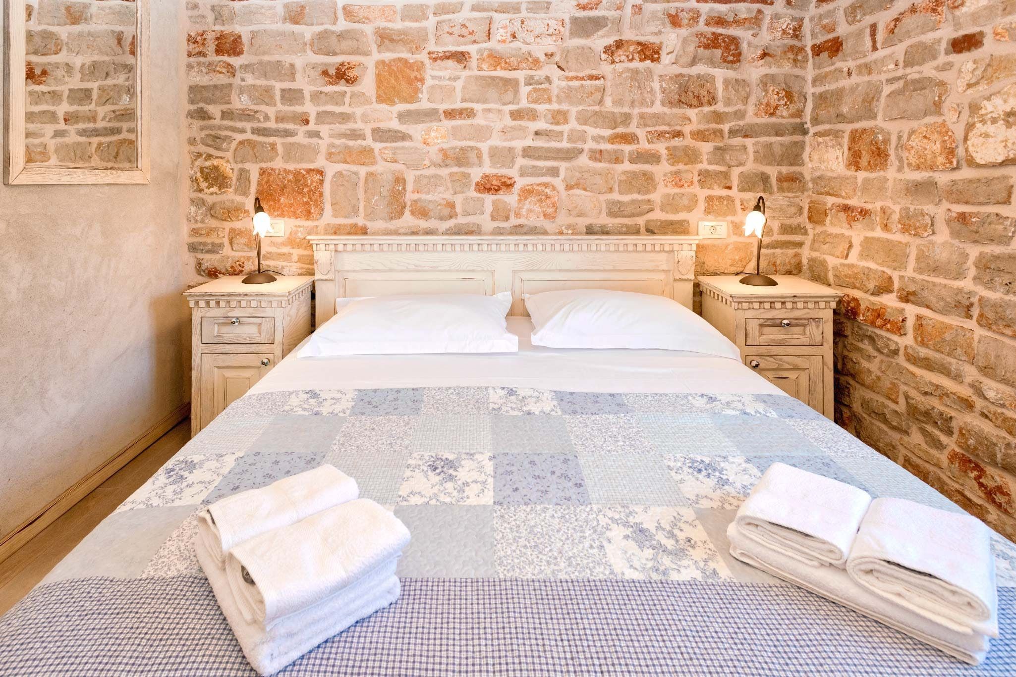 Spread across a main villa and guesthouse with its own kitchen and living room, this country spot radiates Croatian rusticana. Wooden ceilings and weathered cabinets in the kitchens add to that ancient farmhouse aesthetic and the bedrooms are encased in exposed stone walls, keeping things cool at night. There are modern touches just where you need them – the huge fridge in the kitchen, state-of-the-art coffee-making equipment and rainfall showers. But none of it interferes with the beautiful, away-from-it-all feel of this place.