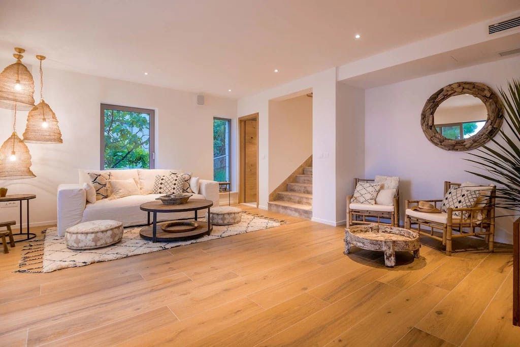 The home itself is a vision of boho-chic with artefacts from across the globe adorning raw wood shelves, cacti and straw lampshades. We can’t decide if our favourite piece is the hand-carved wooden dining table that feels as though it was acquired in a Balinese market, or the azulejo tiles in the master bathroom. The original stone features of the home have been restored too, like the rope-lined staircase and balustraded balconies. The only difficult choice here is which beautifully decorated bedroom you want to bag for your own.