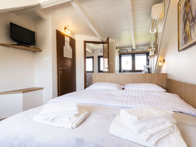 1-room apartment 20 m2 on 3rd floor. Studio with 1 french bed (160 cm, length 200 cm), dining table and satellite TV (flat screen), air conditioning. Open kitchen (2 hot plates, electric coffee machine). Shower/WC. Facilities: Internet (WiFi, free).