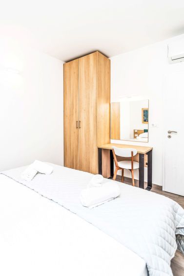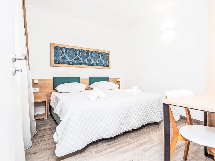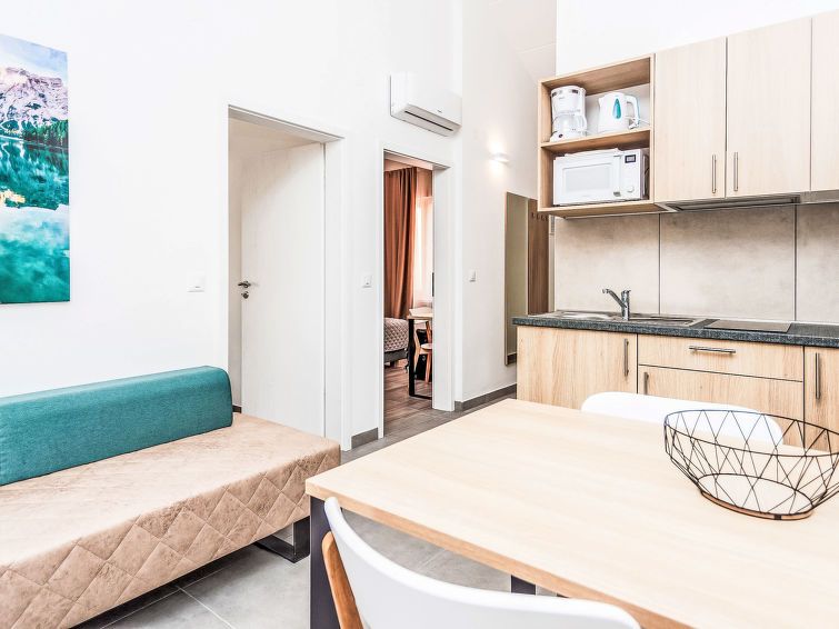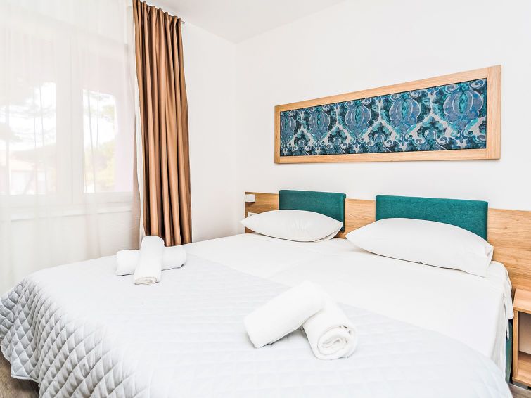 2-room apartment 42 m2, on the ground floor, south facing position. Living/dining room with 1 double sofabed (160 cm, length 200 cm), satellite TV (flat screen), air conditioning. Exit to the terrace. 1 room with 2 beds (90 cm, length 200 cm), air conditioning. Open kitchen (2 ceramic glass hob hotplates, microwave, electric coffee machine).
