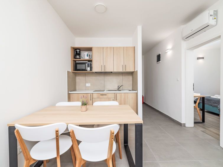 2-room apartment 42 m2, on the ground floor, south facing position. Living/dining room with 1 double sofabed (160 cm, length 200 cm), satellite TV (flat screen), air conditioning. Exit to the terrace. 1 room with 2 beds (90 cm, length 200 cm), air conditioning. Open kitchen (2 ceramic glass hob hotplates, microwave, electric coffee machine).