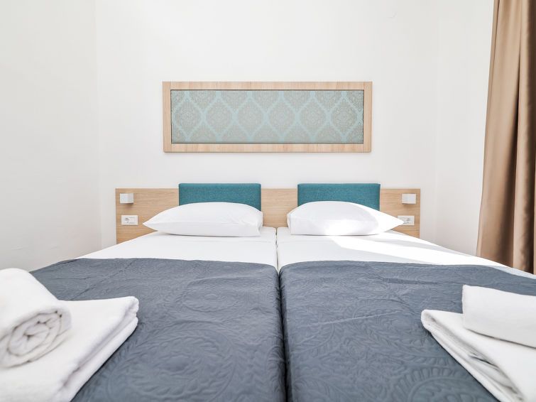 3-room apartment 46 m2 on 1st floor, south facing position. Living/dining room with 1 sofabed (80 cm, length 180 cm), satellite TV (flat screen), air conditioning. Exit to the terrace. 2 rooms, each room with 2 beds (90 cm, length 200 cm). Open kitchen (2 ceramic glass hob hotplates, microwave, electric coffee machine).