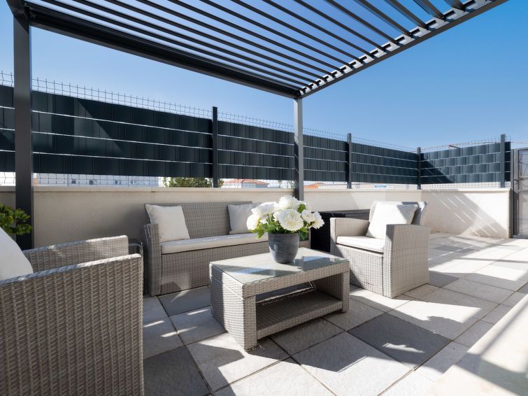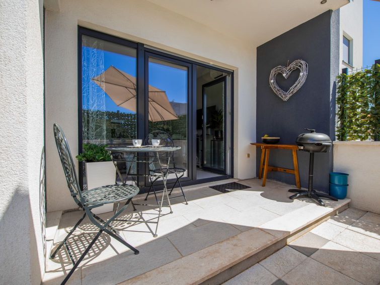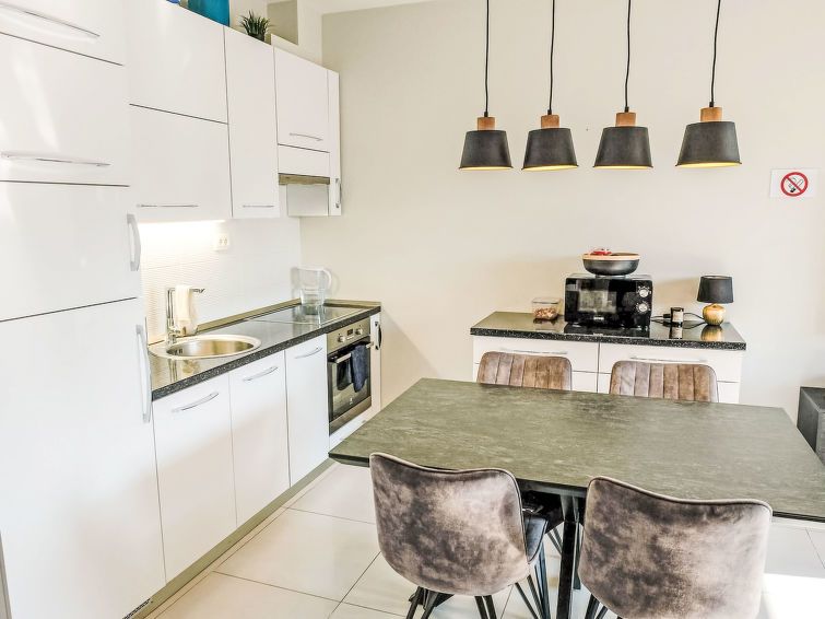 "Niki", 3-room apartment 50 m2, on the ground floor, south facing position. Renovated in 2023: living/dining room with satellite TV (flat screen), air conditioning. Exit to the terrace. 1 room with 1 french bed (160 cm, length 200 cm). 1 room with 1 french bed (180 cm, length 200 cm), satellite TV (flat screen).
