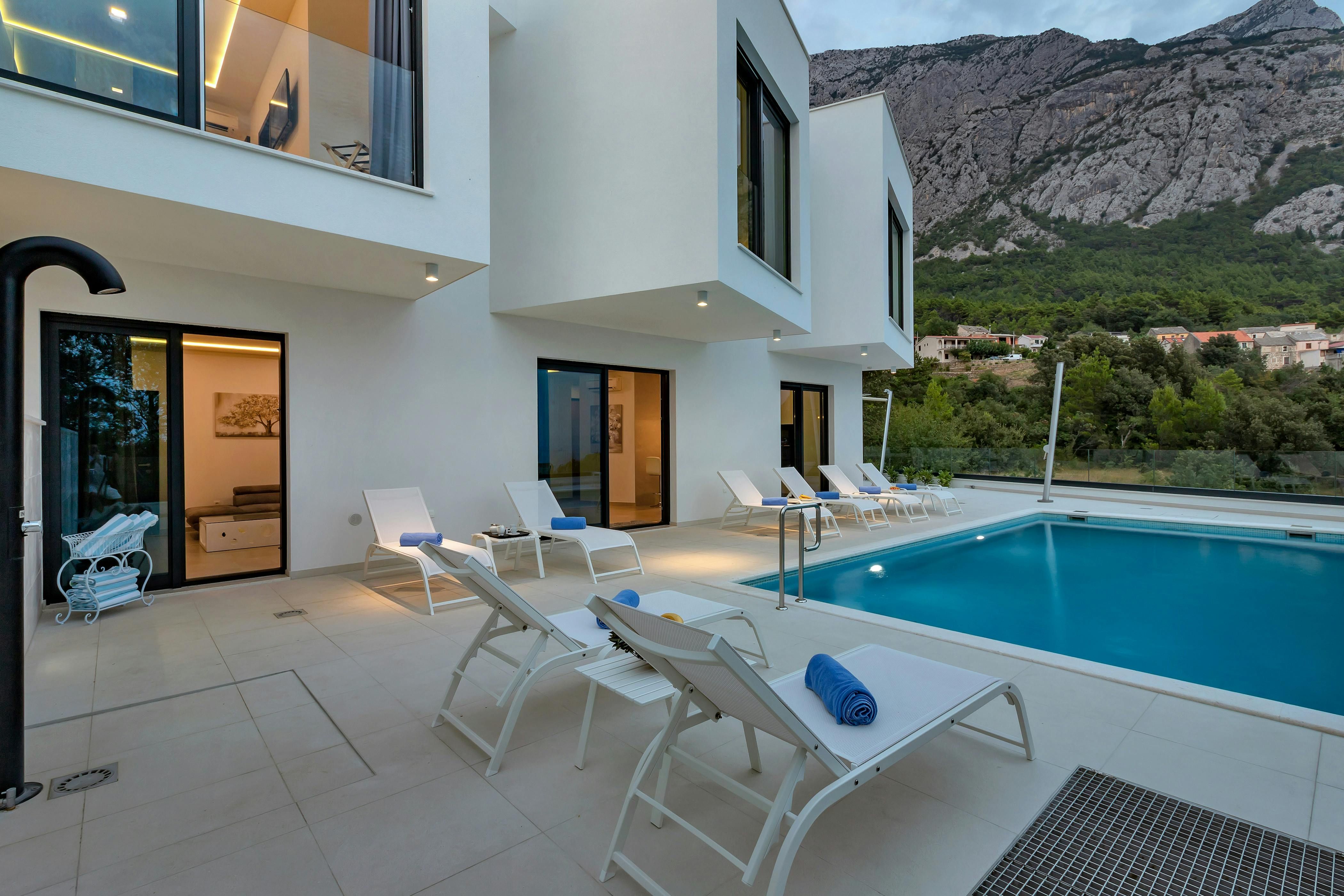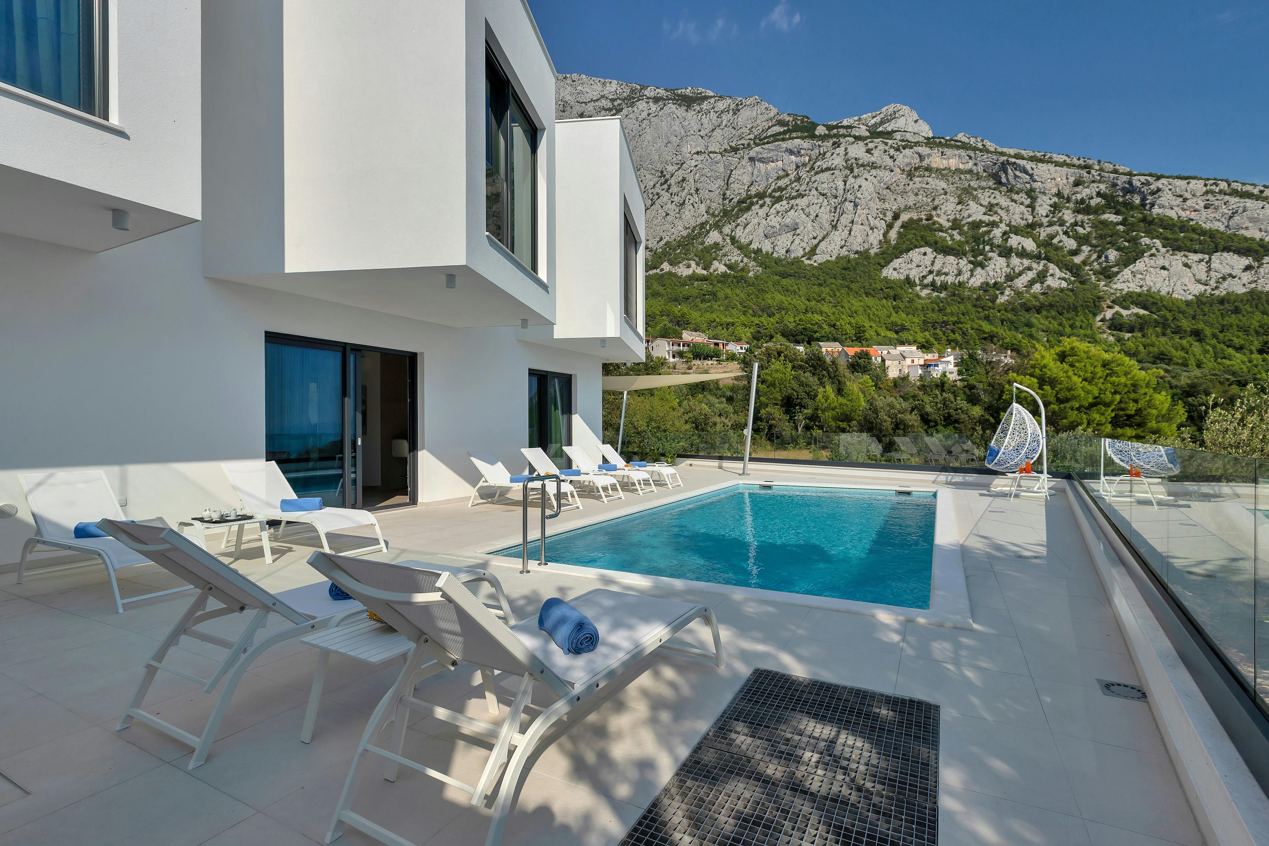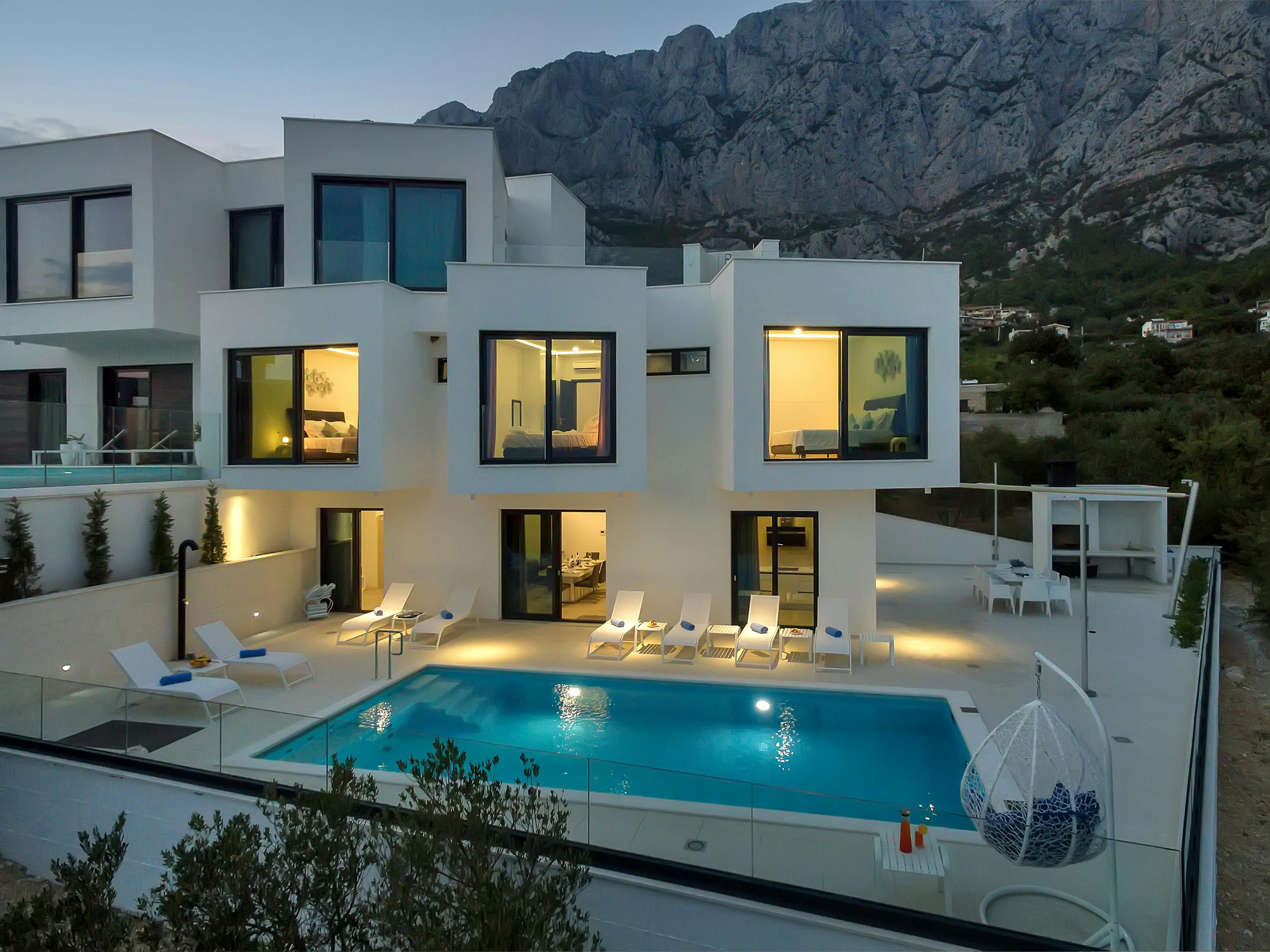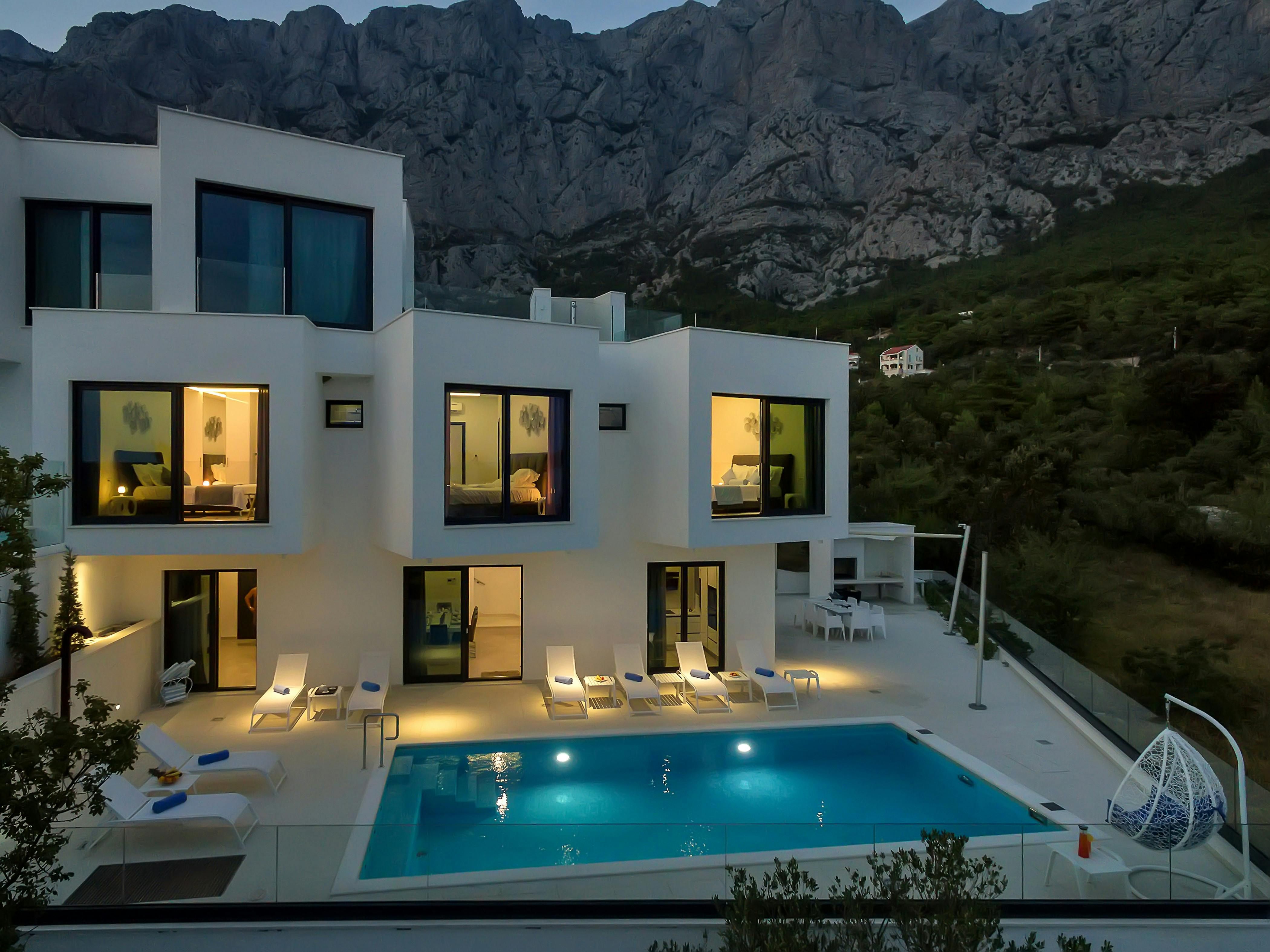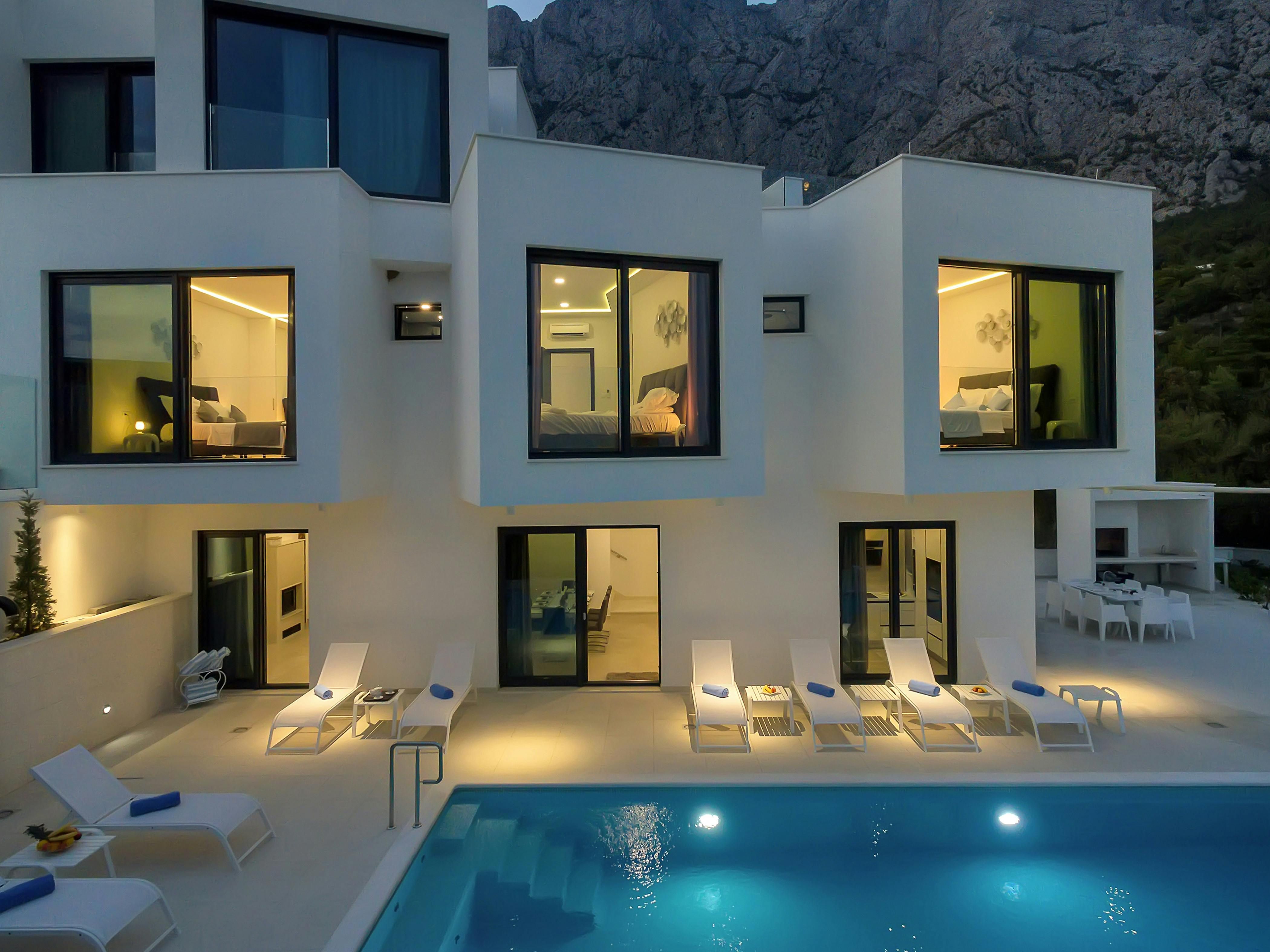 This stunning, architecturally sophisticated villa is nestled against the rugged gray mountain slopes of Makarska, boasting breathtaking sea views. The open-air setting invites guests to enjoy the 1,000-square-meter outdoor world, with a heated 40 m² pool featuring a counter-current system and hydro-massage for ultimate relaxation. In addition to comfortable loungers, guests can enjoy evening barbecues on the adjacent brick charcoal grill while taking in the Mediterranean breeze. Inside, the elegant design combines modernity and coziness, with large floor tiles and white walls providing a harmonious backdrop for the furniture. The open-plan living and dining area features a fireplace for added comfort on cooler days while the integrated kitchen boasts a high-gloss look and comprehensive equipment. Upstairs, three stylish bedrooms await with breathtaking views from floor-to-ceiling windows, all air-conditioned and equipped with their own TV and en suite bathroom for maximum privacy.