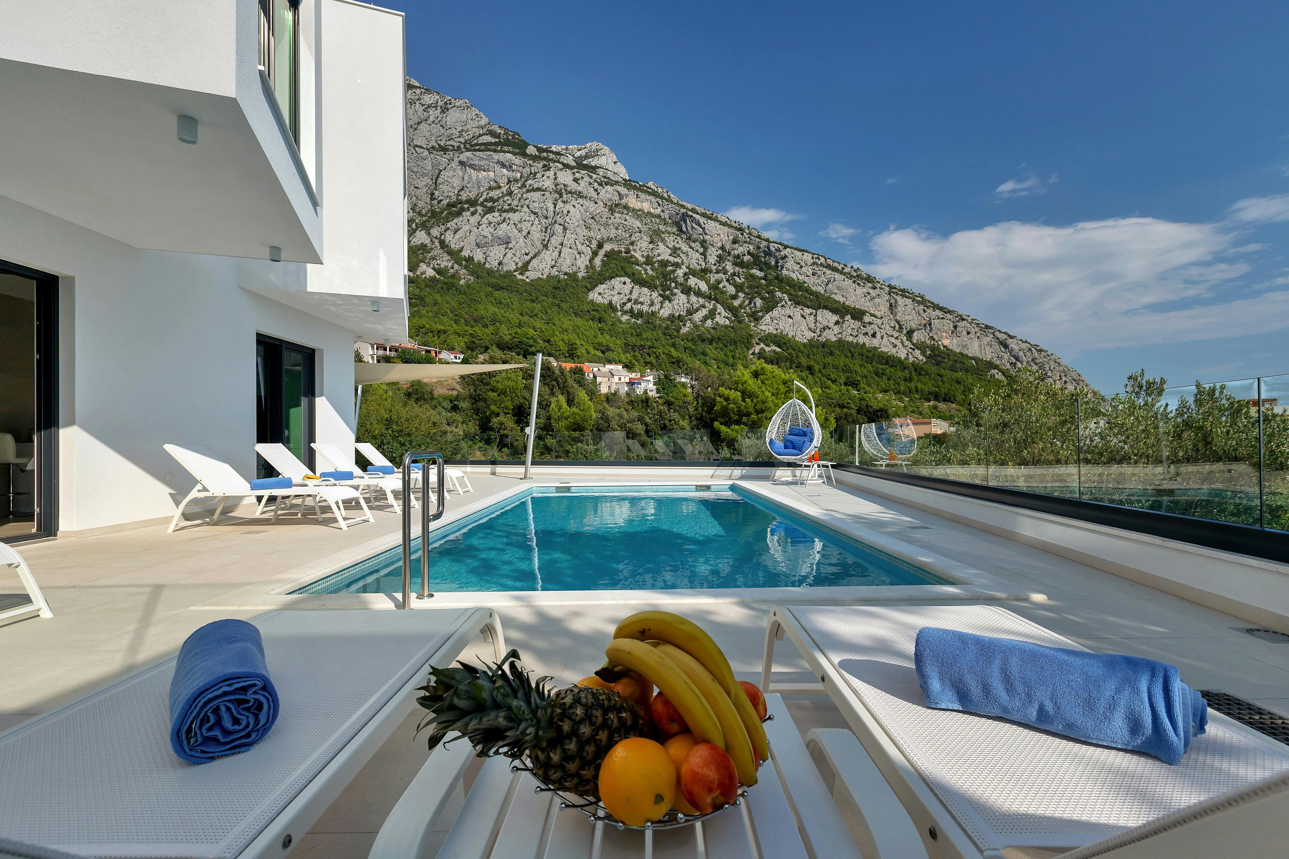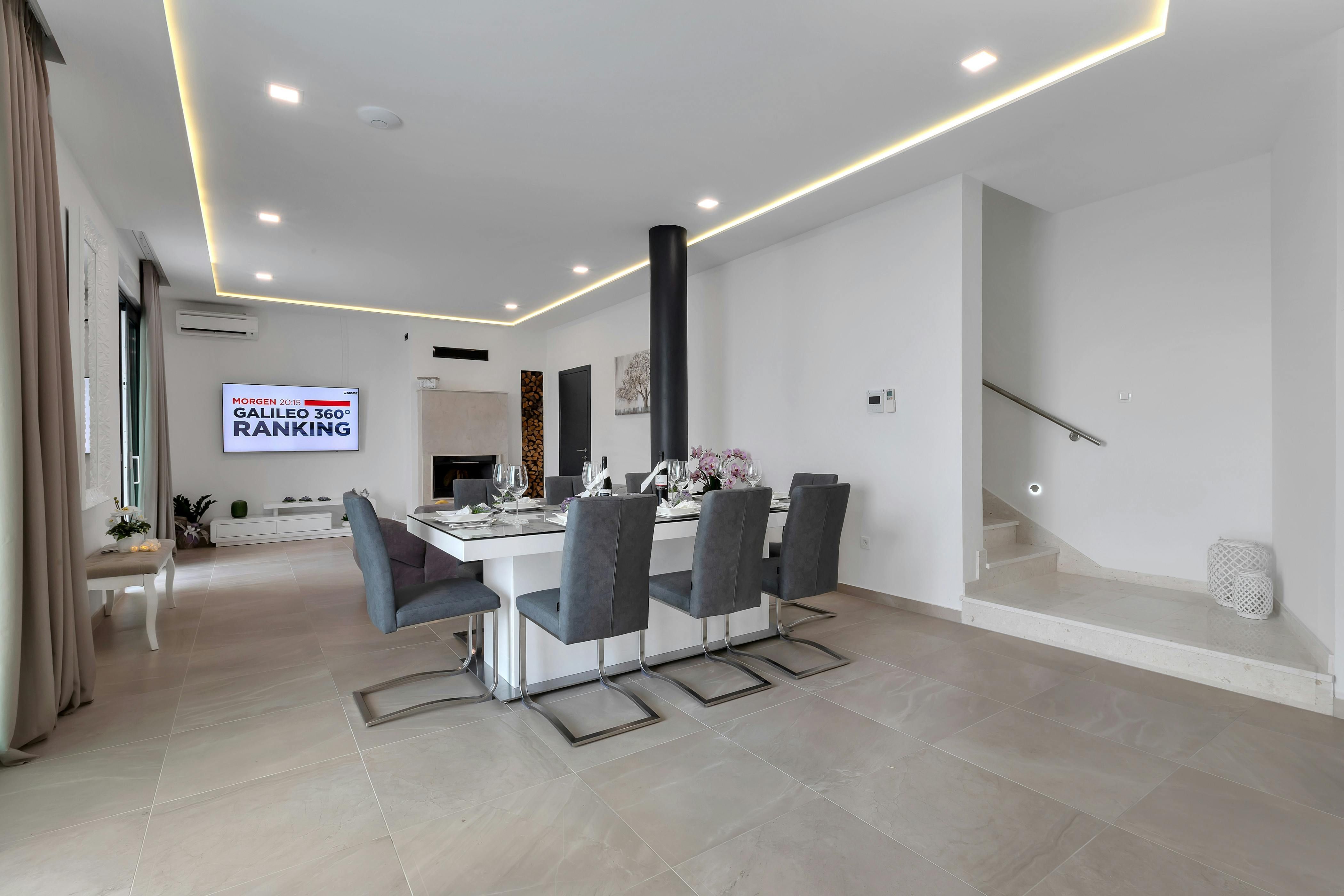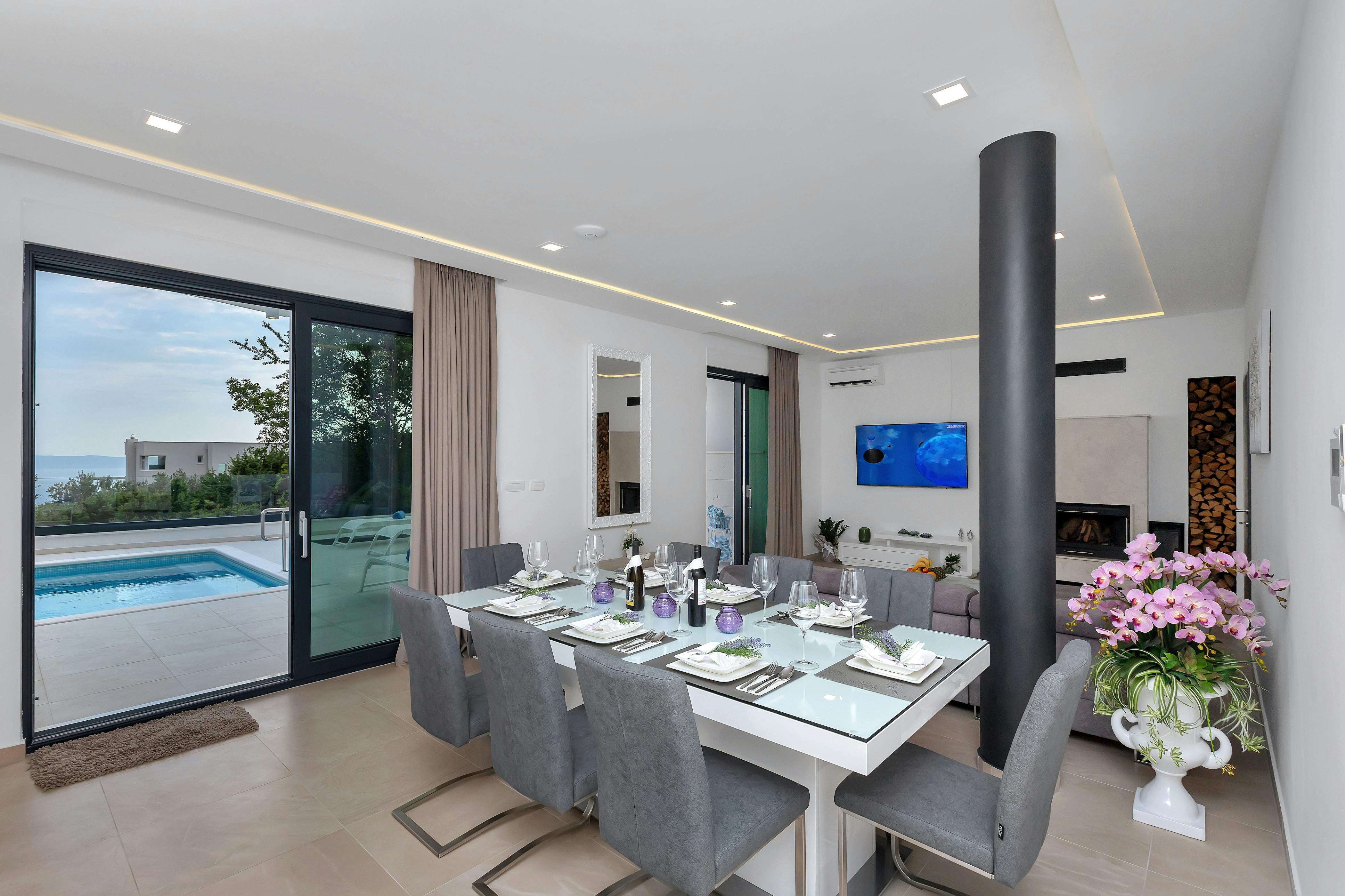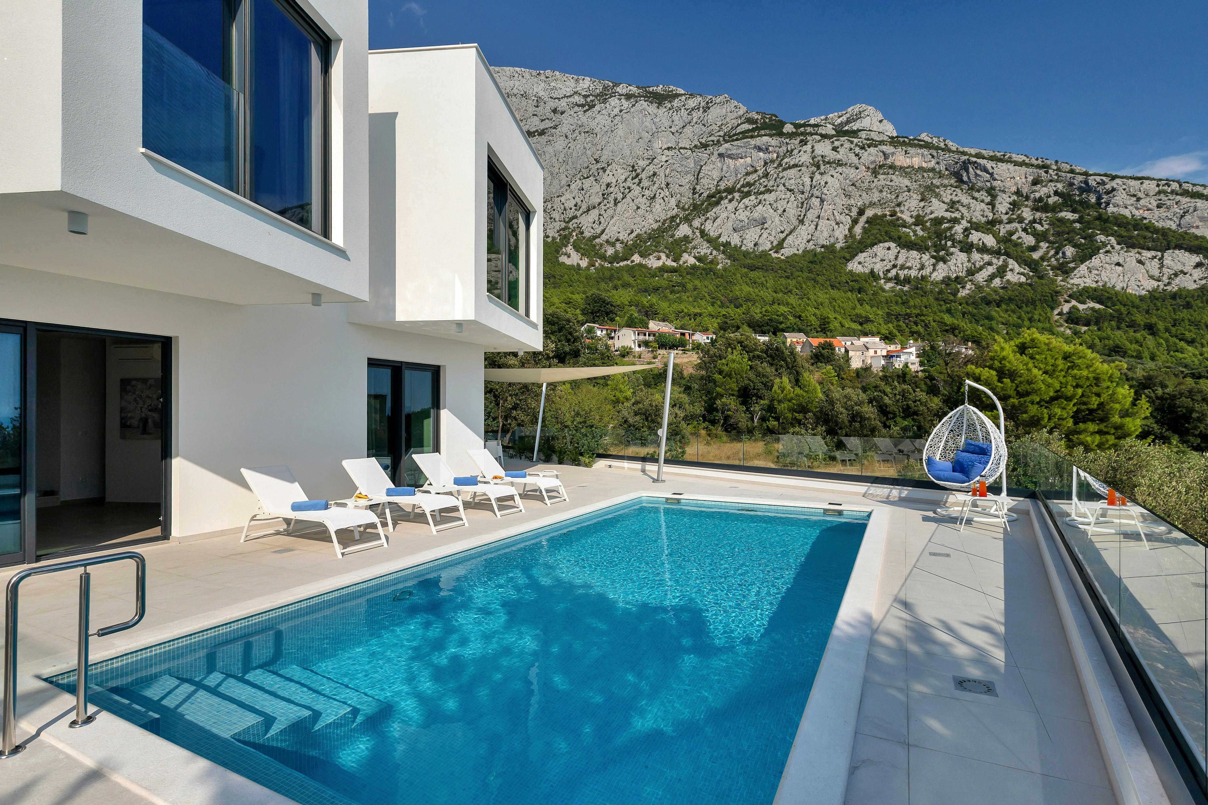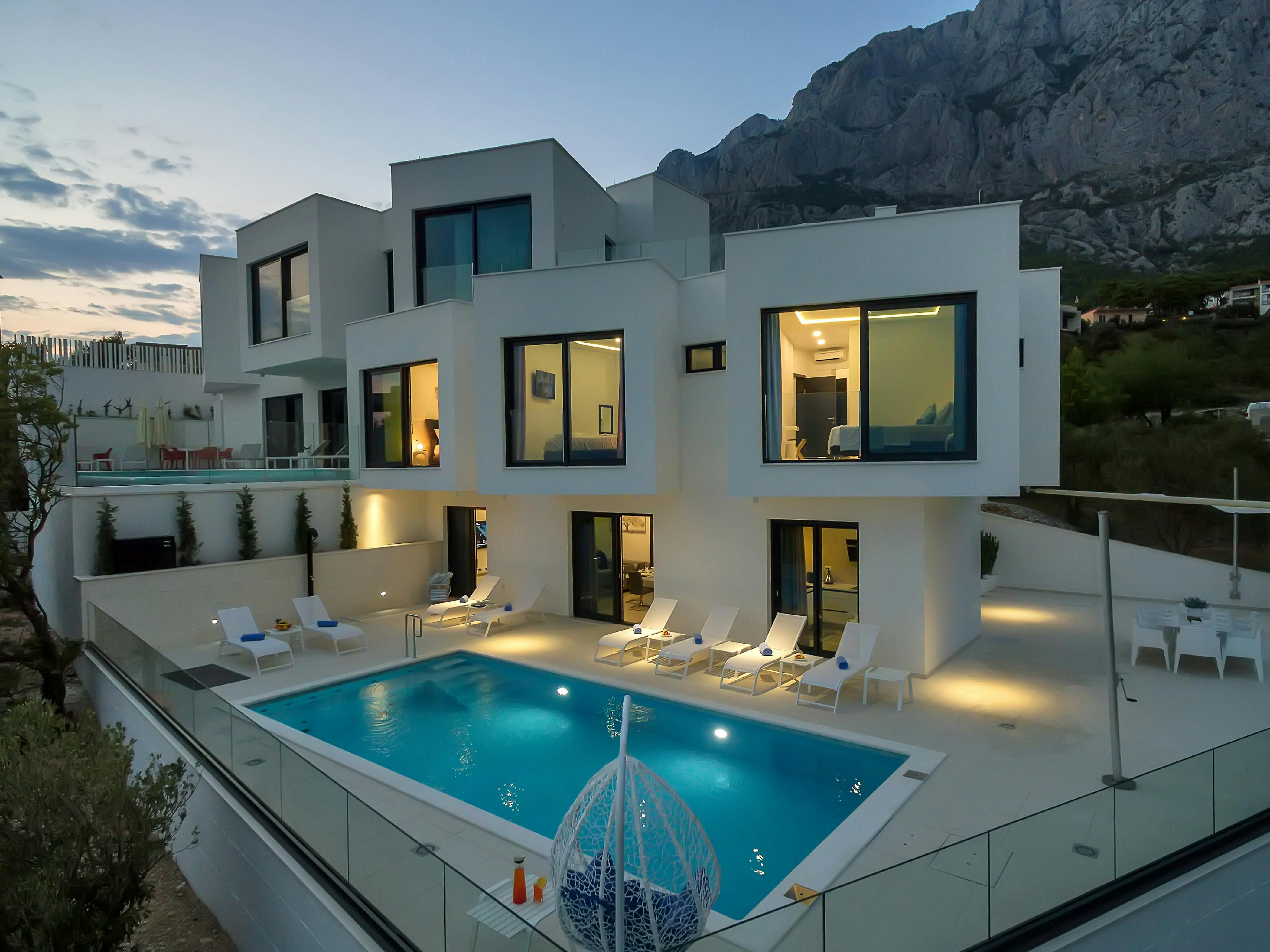 This stunning, architecturally sophisticated villa is nestled against the rugged gray mountain slopes of Makarska, boasting breathtaking sea views. The open-air setting invites guests to enjoy the 1,000-square-meter outdoor world, with a heated 40 m² pool featuring a counter-current system and hydro-massage for ultimate relaxation. In addition to comfortable loungers, guests can enjoy evening barbecues on the adjacent brick charcoal grill while taking in the Mediterranean breeze. Inside, the elegant design combines modernity and coziness, with large floor tiles and white walls providing a harmonious backdrop for the furniture. The open-plan living and dining area features a fireplace for added comfort on cooler days while the integrated kitchen boasts a high-gloss look and comprehensive equipment. Upstairs, three stylish bedrooms await with breathtaking views from floor-to-ceiling windows, all air-conditioned and equipped with their own TV and en suite bathroom for maximum privacy.