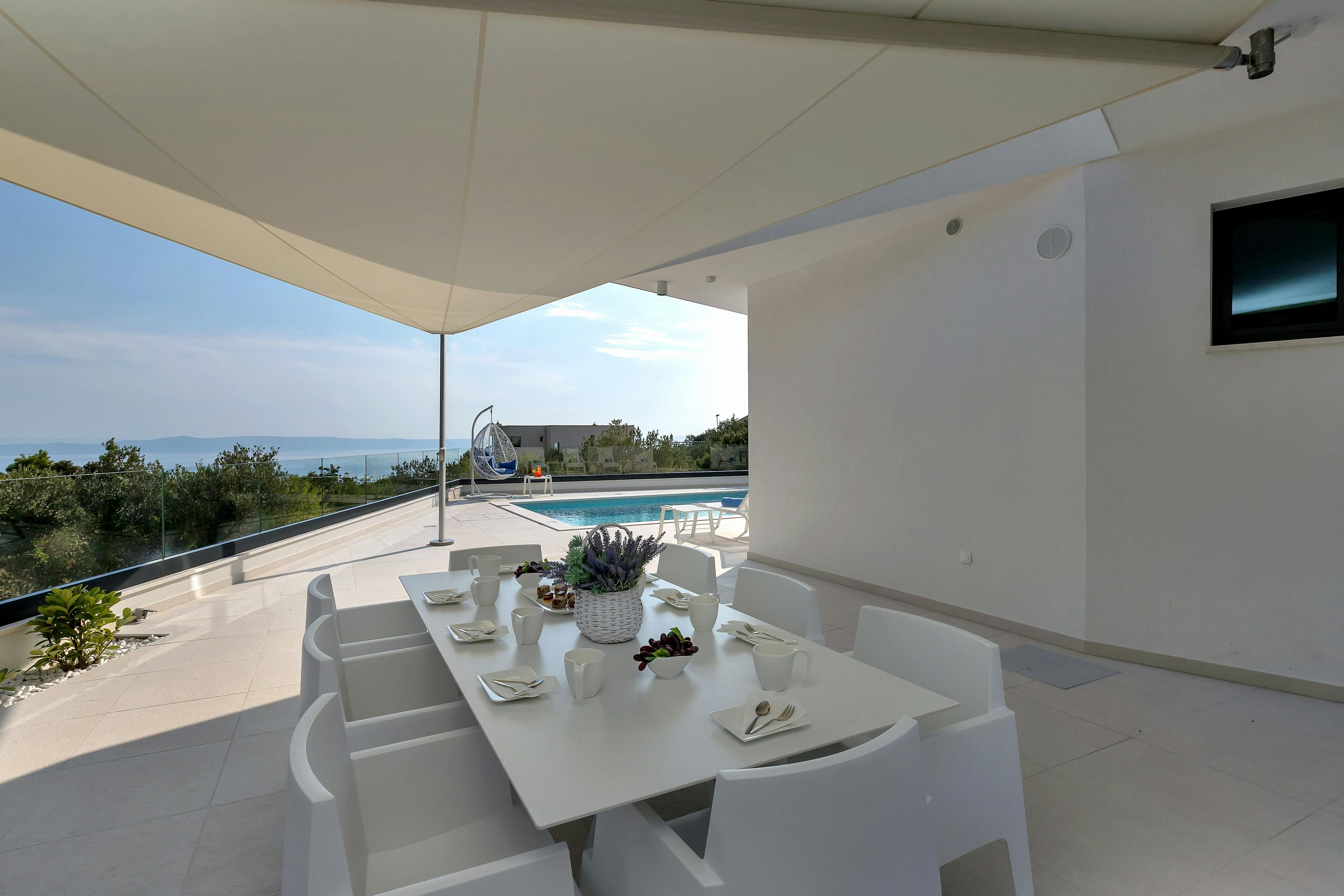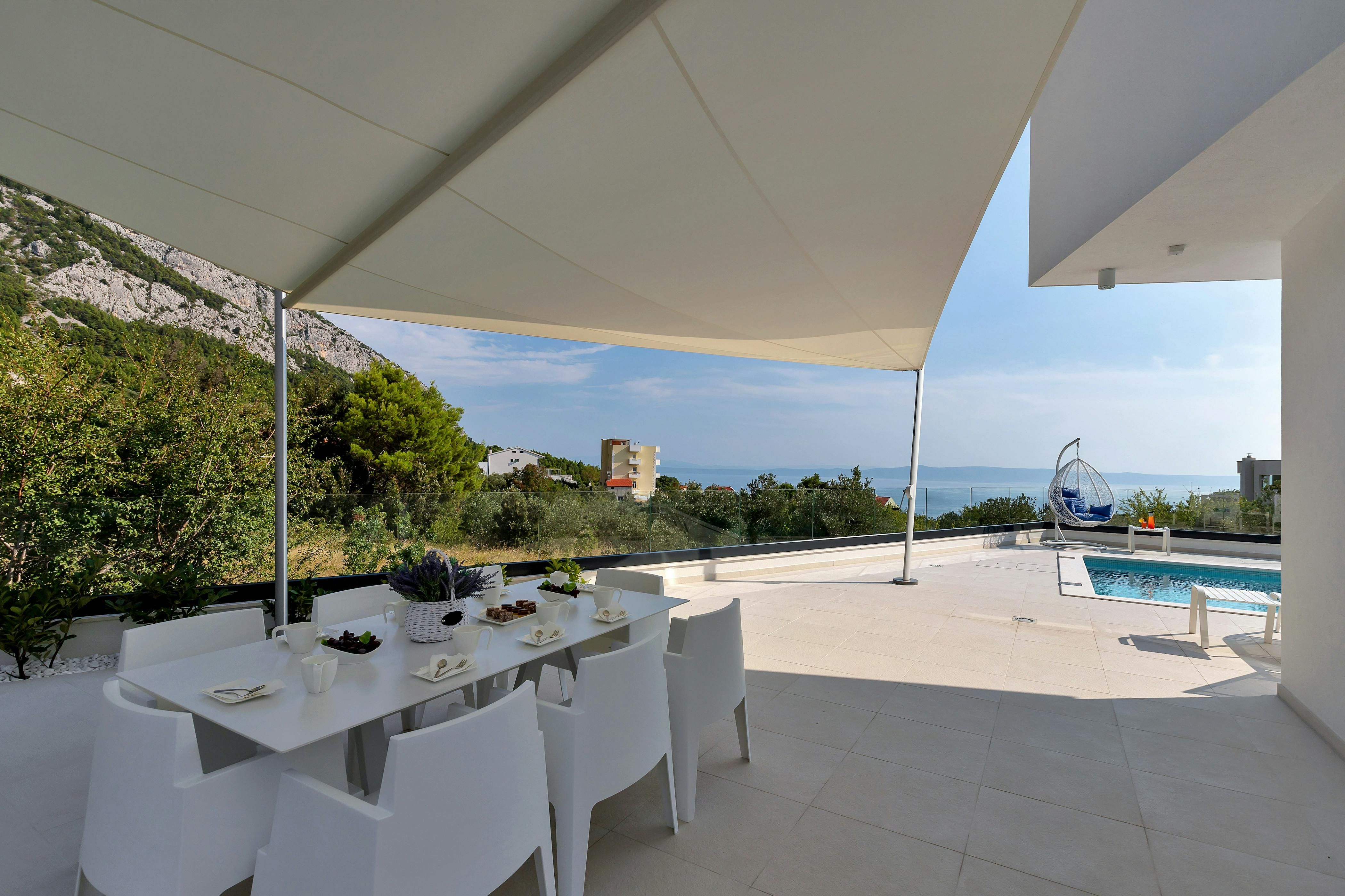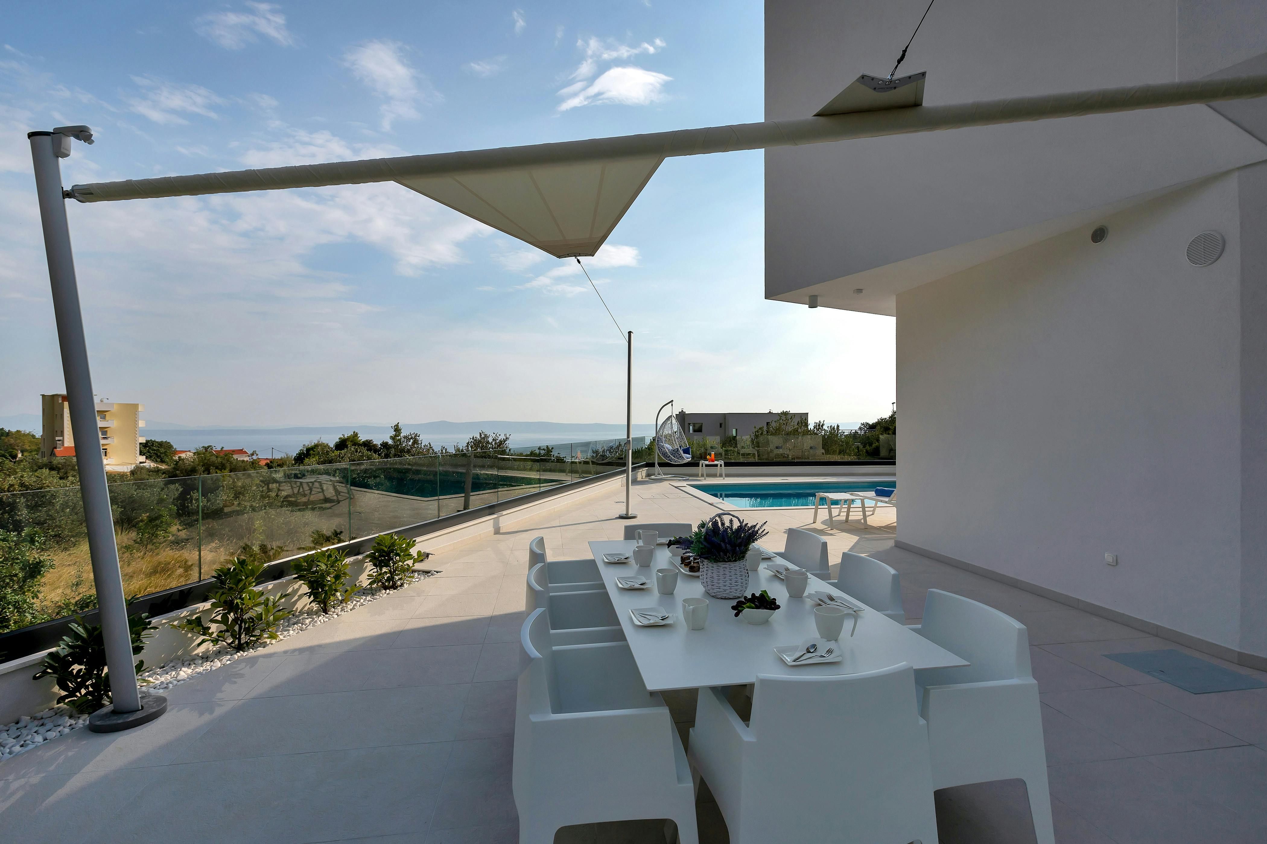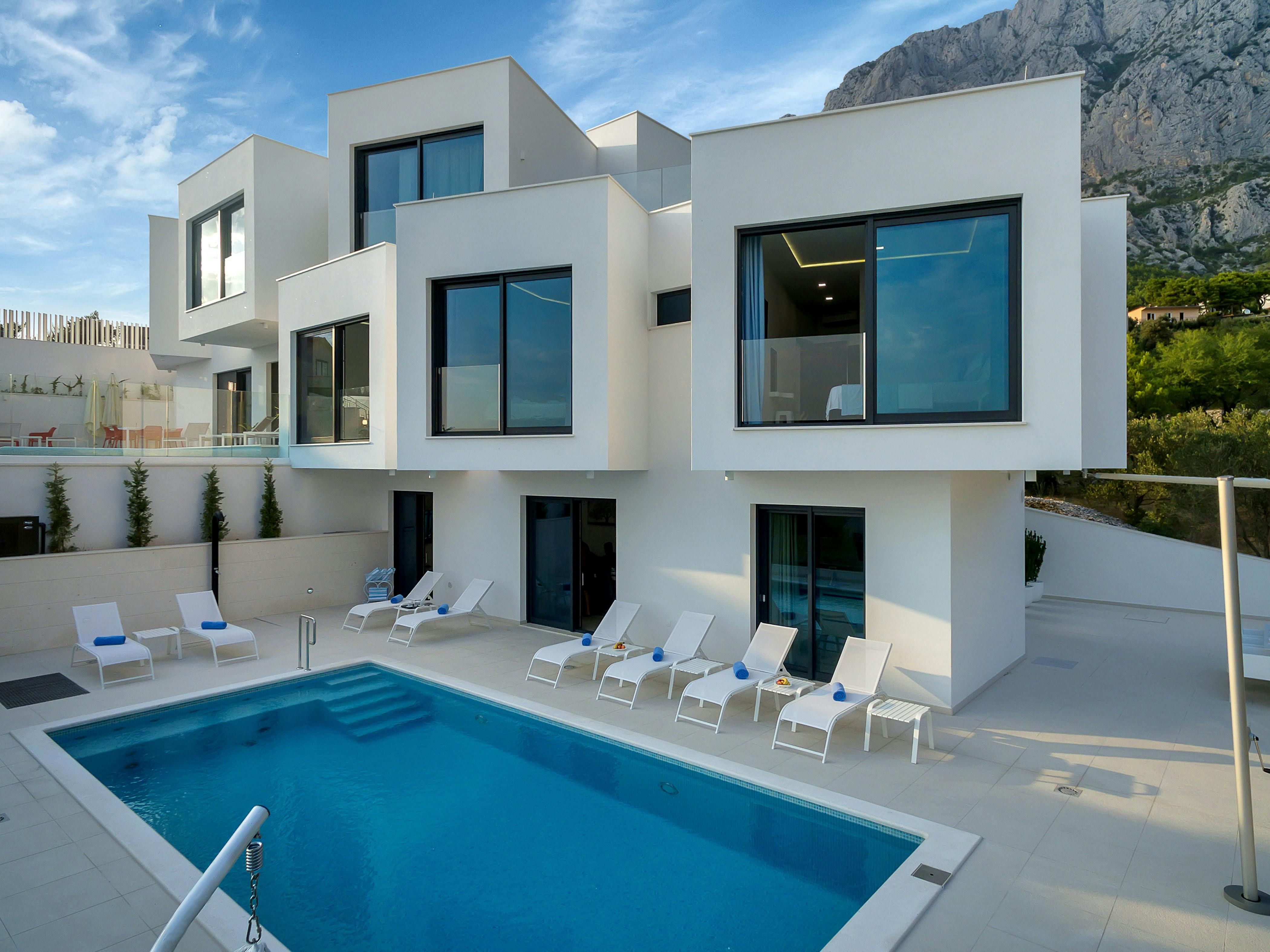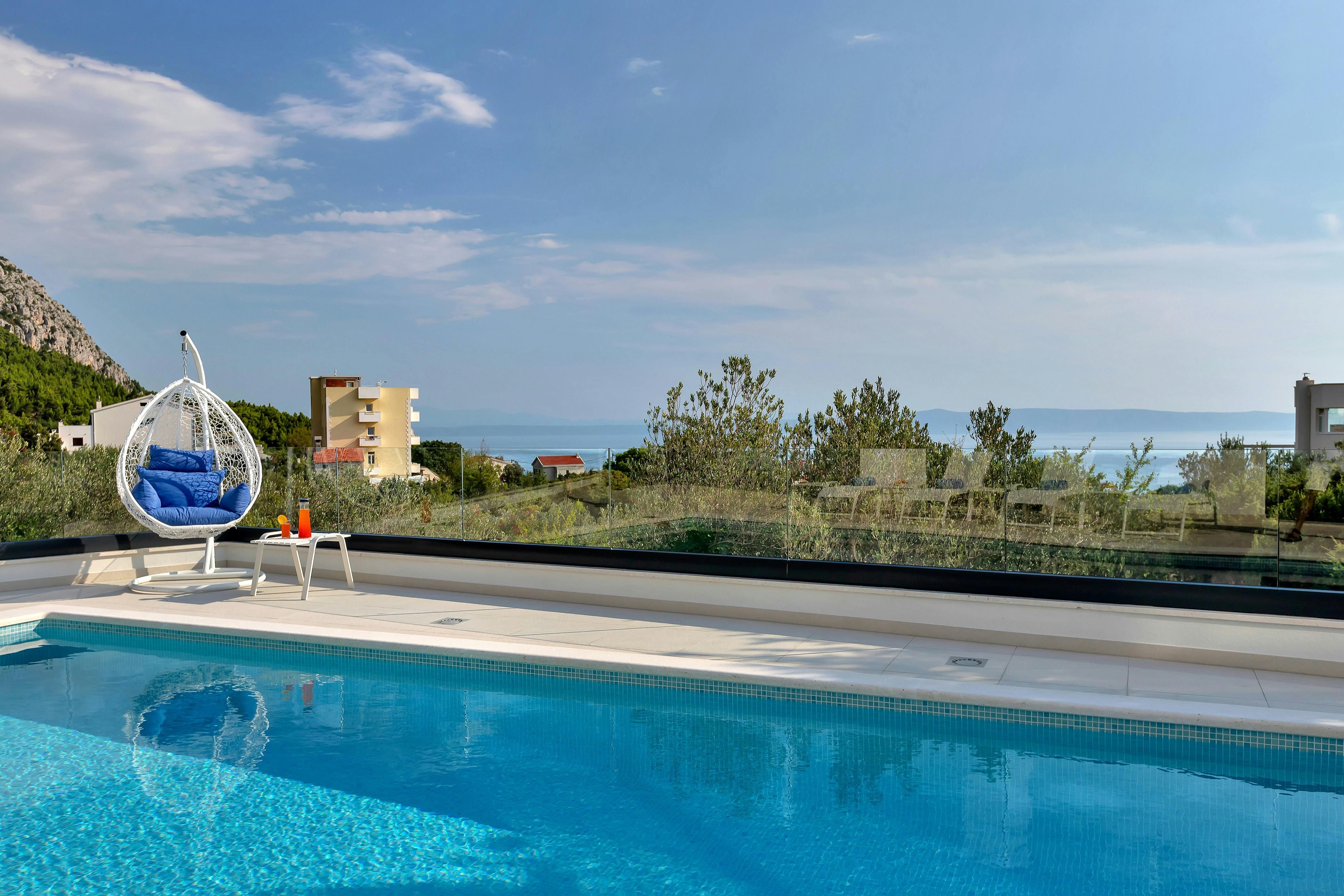 This stunning, architecturally sophisticated villa is nestled against the rugged gray mountain slopes of Makarska, boasting breathtaking sea views. The open-air setting invites guests to enjoy the 1,000-square-meter outdoor world, with a heated 40 m² pool featuring a counter-current system and hydro-massage for ultimate relaxation. In addition to comfortable loungers, guests can enjoy evening barbecues on the adjacent brick charcoal grill while taking in the Mediterranean breeze. Inside, the elegant design combines modernity and coziness, with large floor tiles and white walls providing a harmonious backdrop for the furniture. The open-plan living and dining area features a fireplace for added comfort on cooler days while the integrated kitchen boasts a high-gloss look and comprehensive equipment. Upstairs, three stylish bedrooms await with breathtaking views from floor-to-ceiling windows, all air-conditioned and equipped with their own TV and en suite bathroom for maximum privacy.