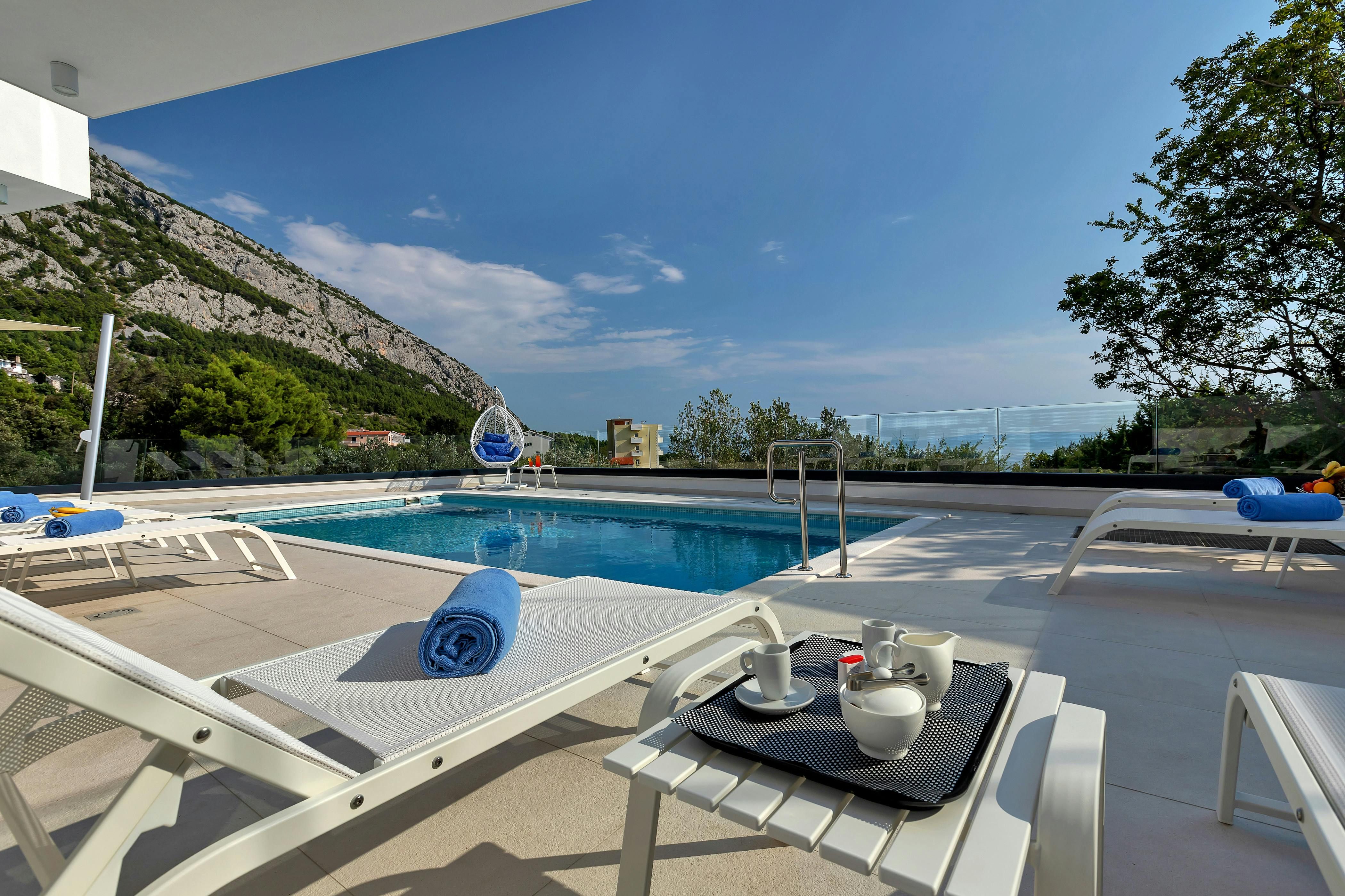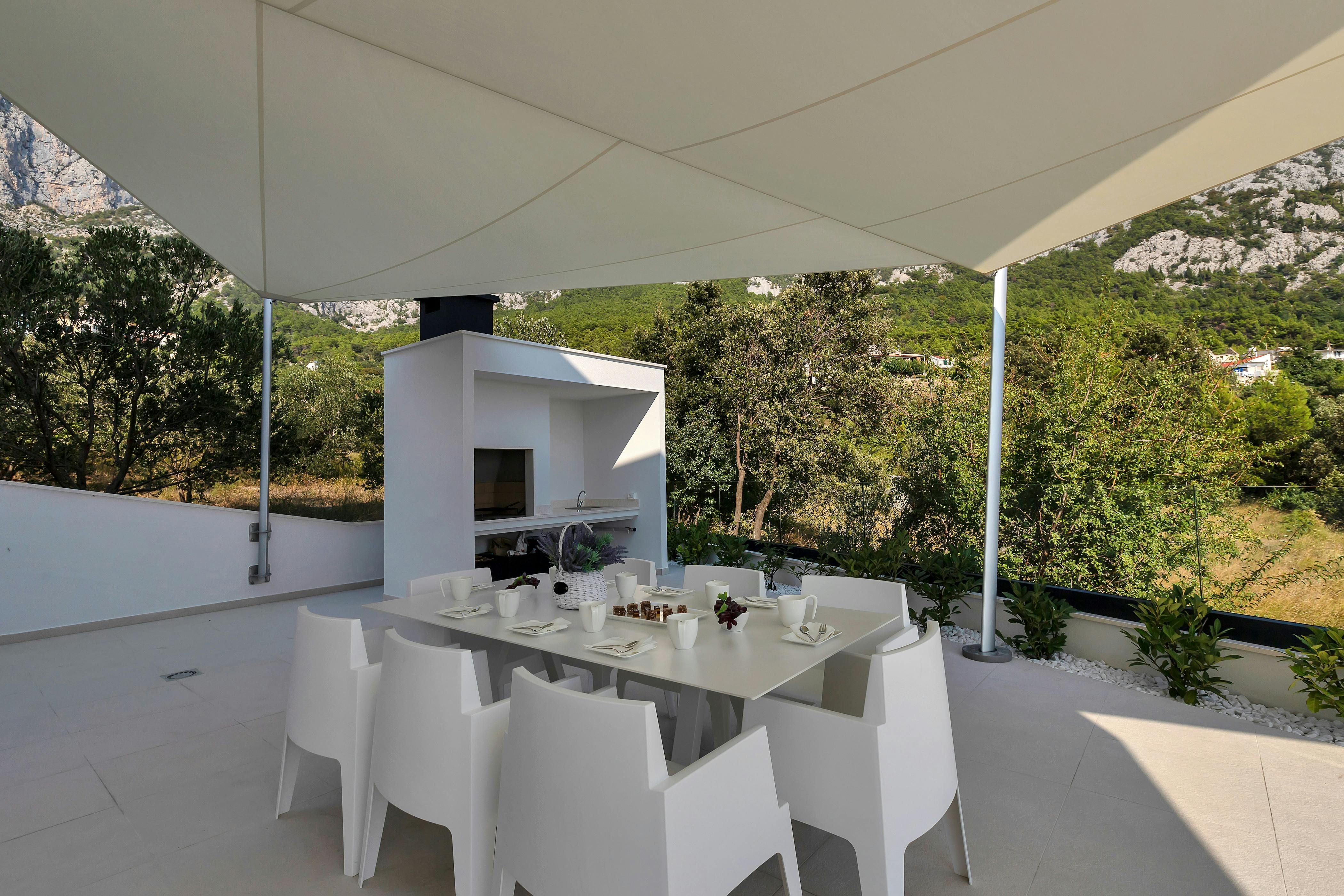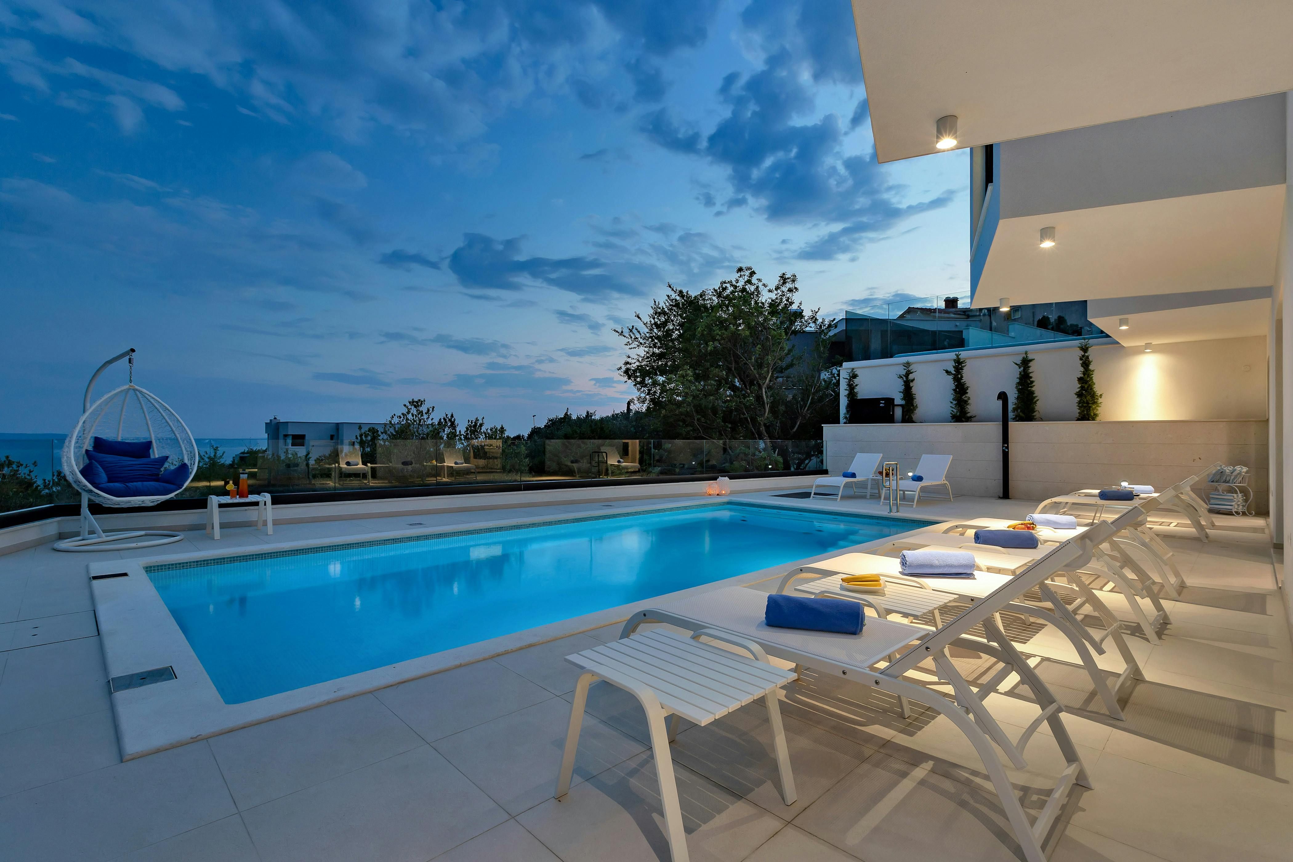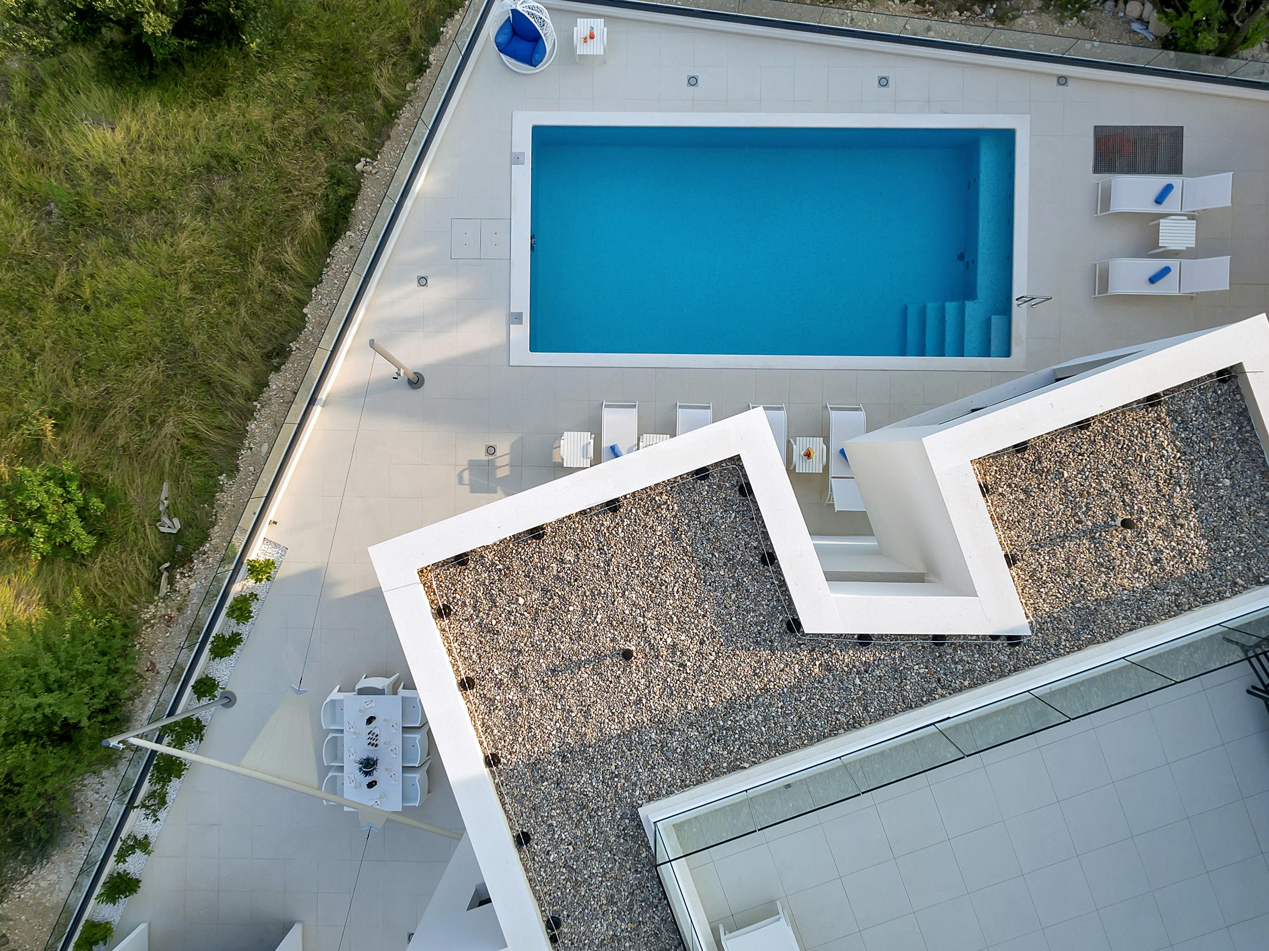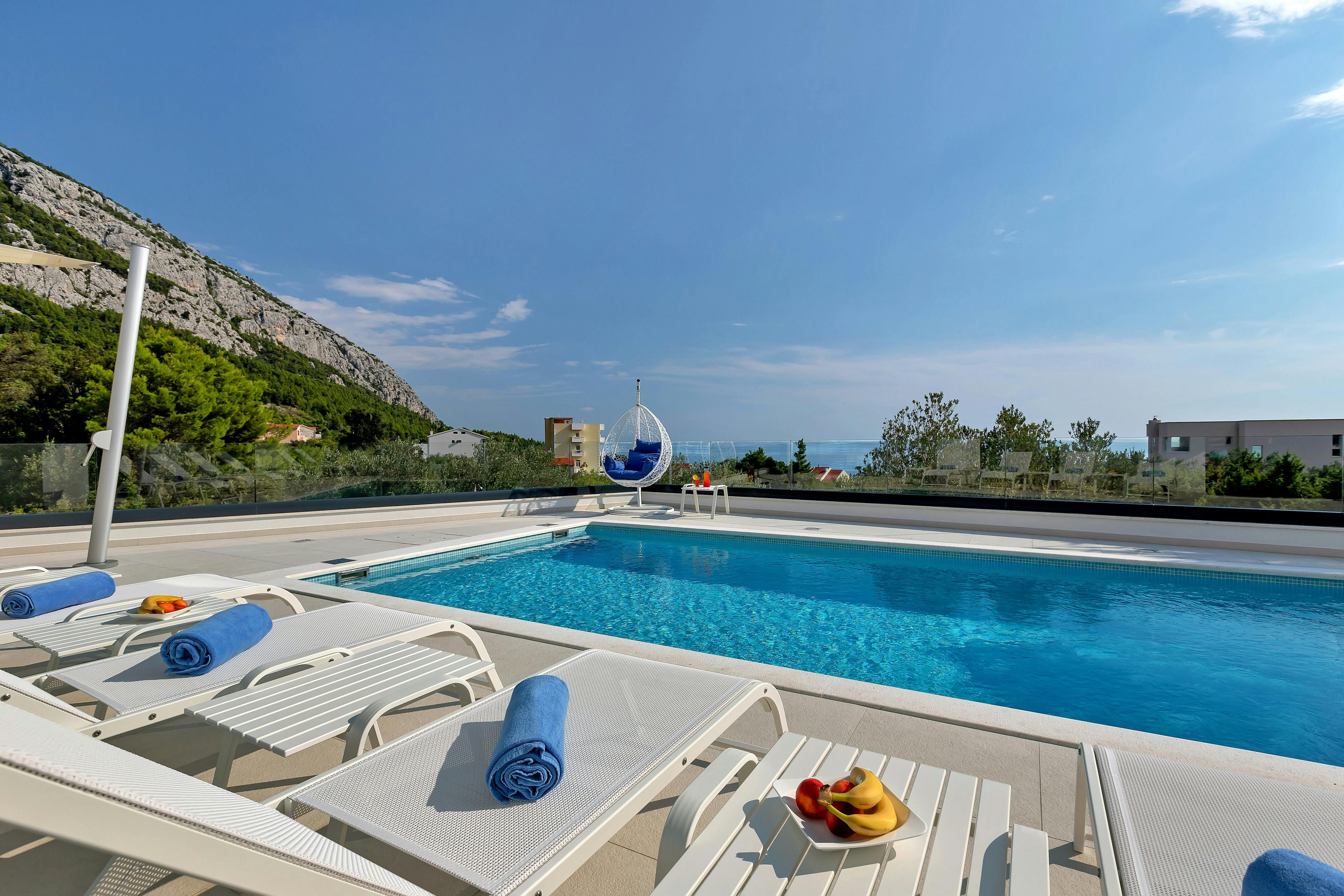 This stunning, architecturally sophisticated villa is nestled against the rugged gray mountain slopes of Makarska, boasting breathtaking sea views. The open-air setting invites guests to enjoy the 1,000-square-meter outdoor world, with a heated 40 m² pool featuring a counter-current system and hydro-massage for ultimate relaxation. In addition to comfortable loungers, guests can enjoy evening barbecues on the adjacent brick charcoal grill while taking in the Mediterranean breeze. Inside, the elegant design combines modernity and coziness, with large floor tiles and white walls providing a harmonious backdrop for the furniture. The open-plan living and dining area features a fireplace for added comfort on cooler days while the integrated kitchen boasts a high-gloss look and comprehensive equipment. Upstairs, three stylish bedrooms await with breathtaking views from floor-to-ceiling windows, all air-conditioned and equipped with their own TV and en suite bathroom for maximum privacy.