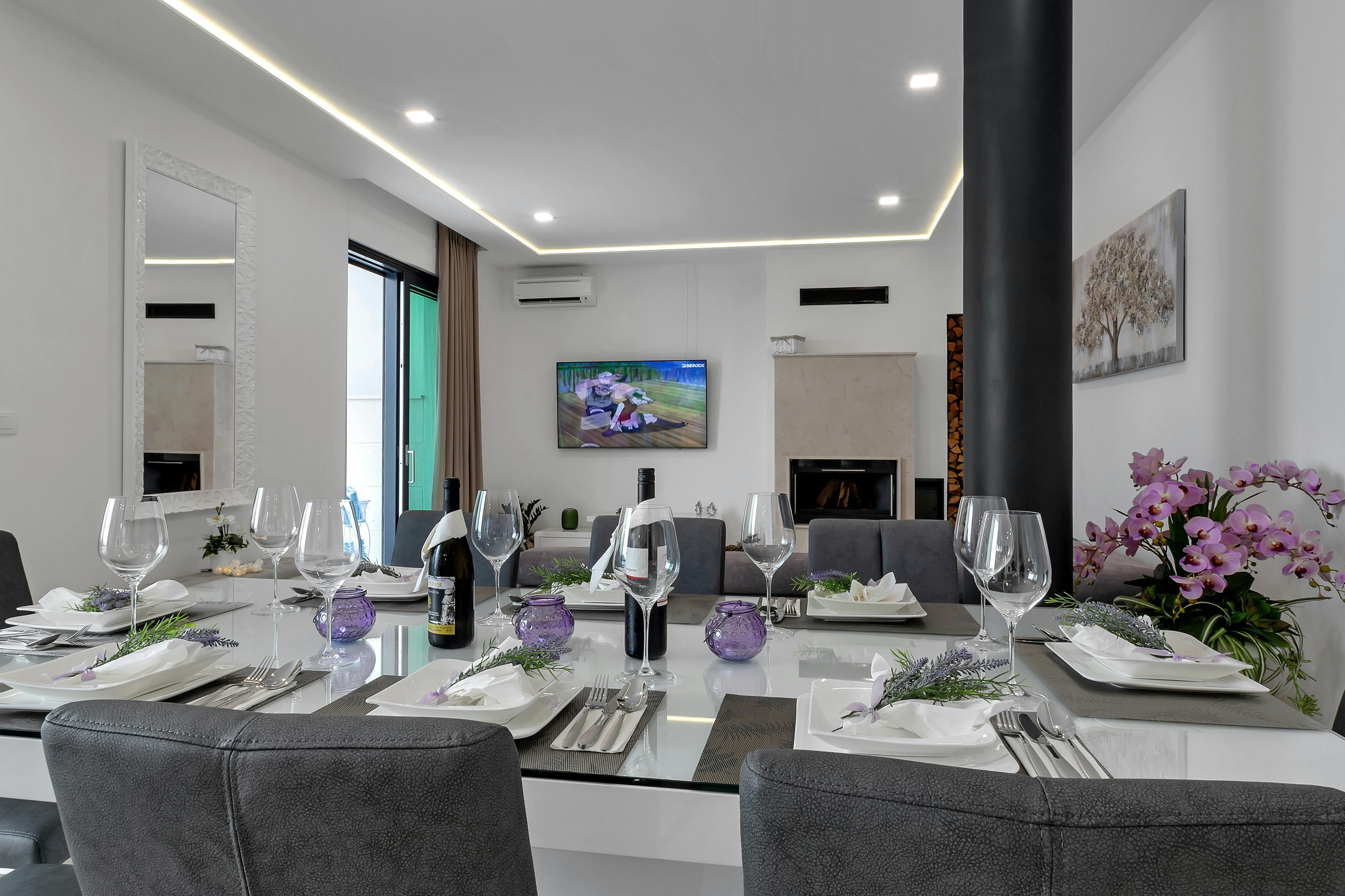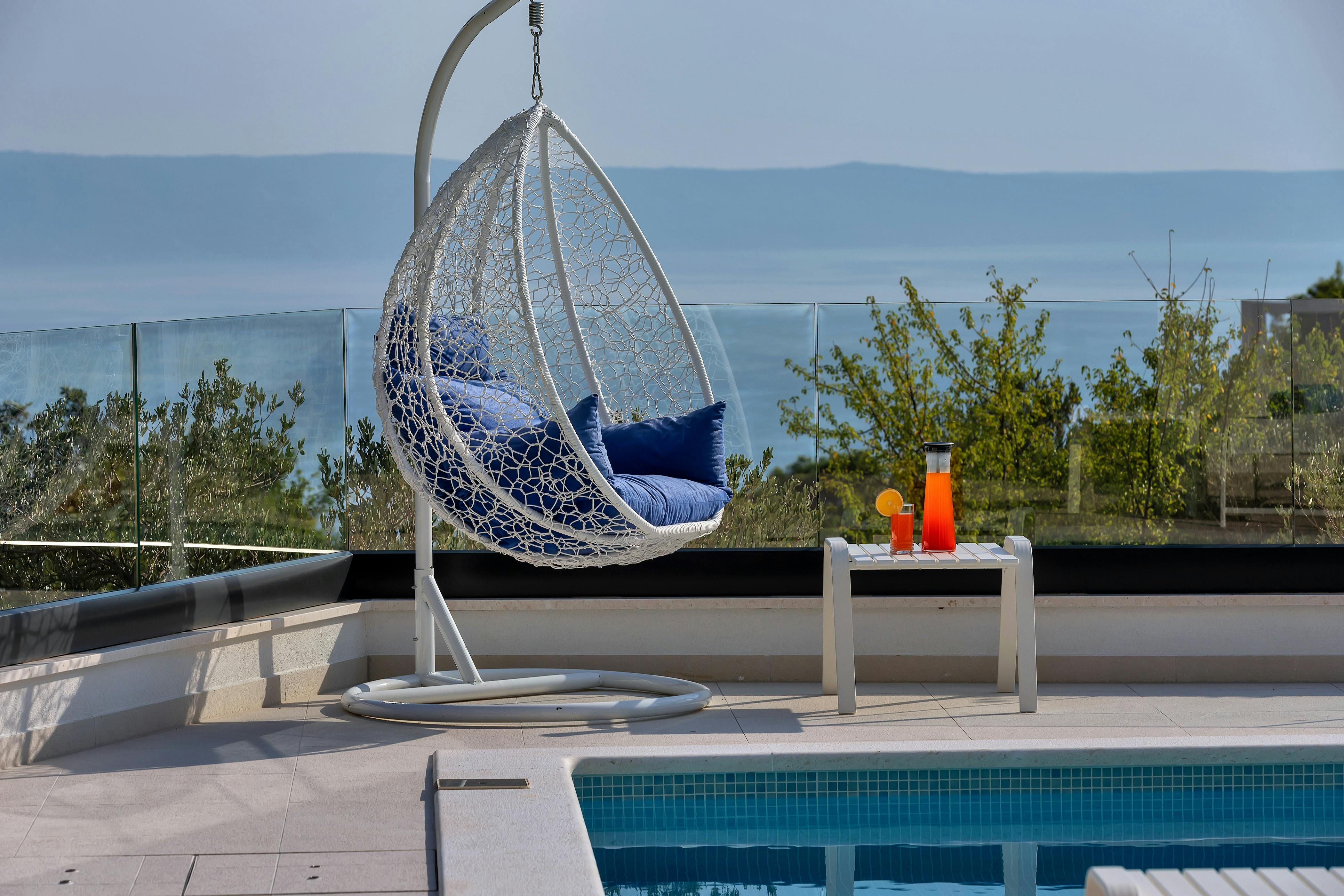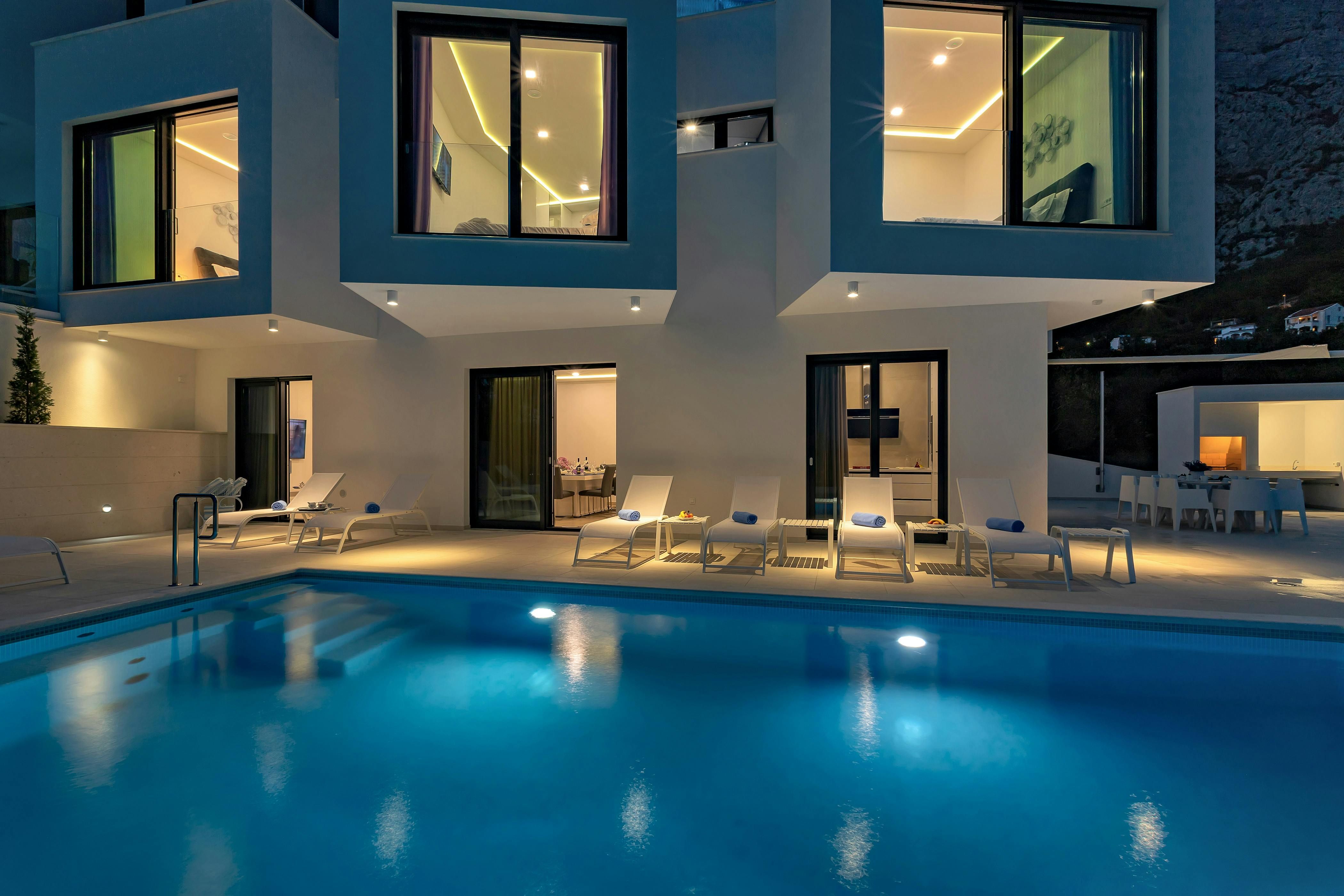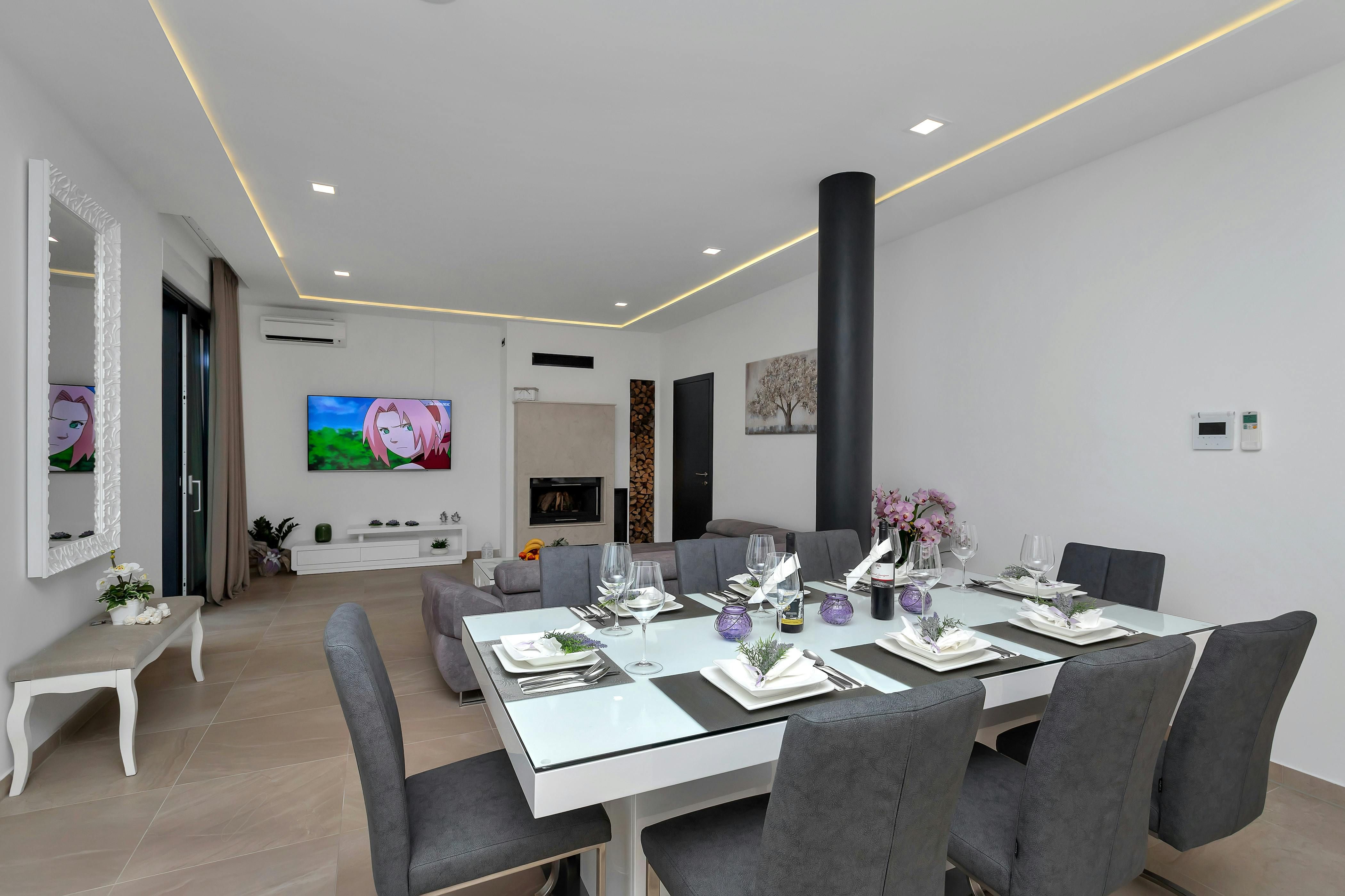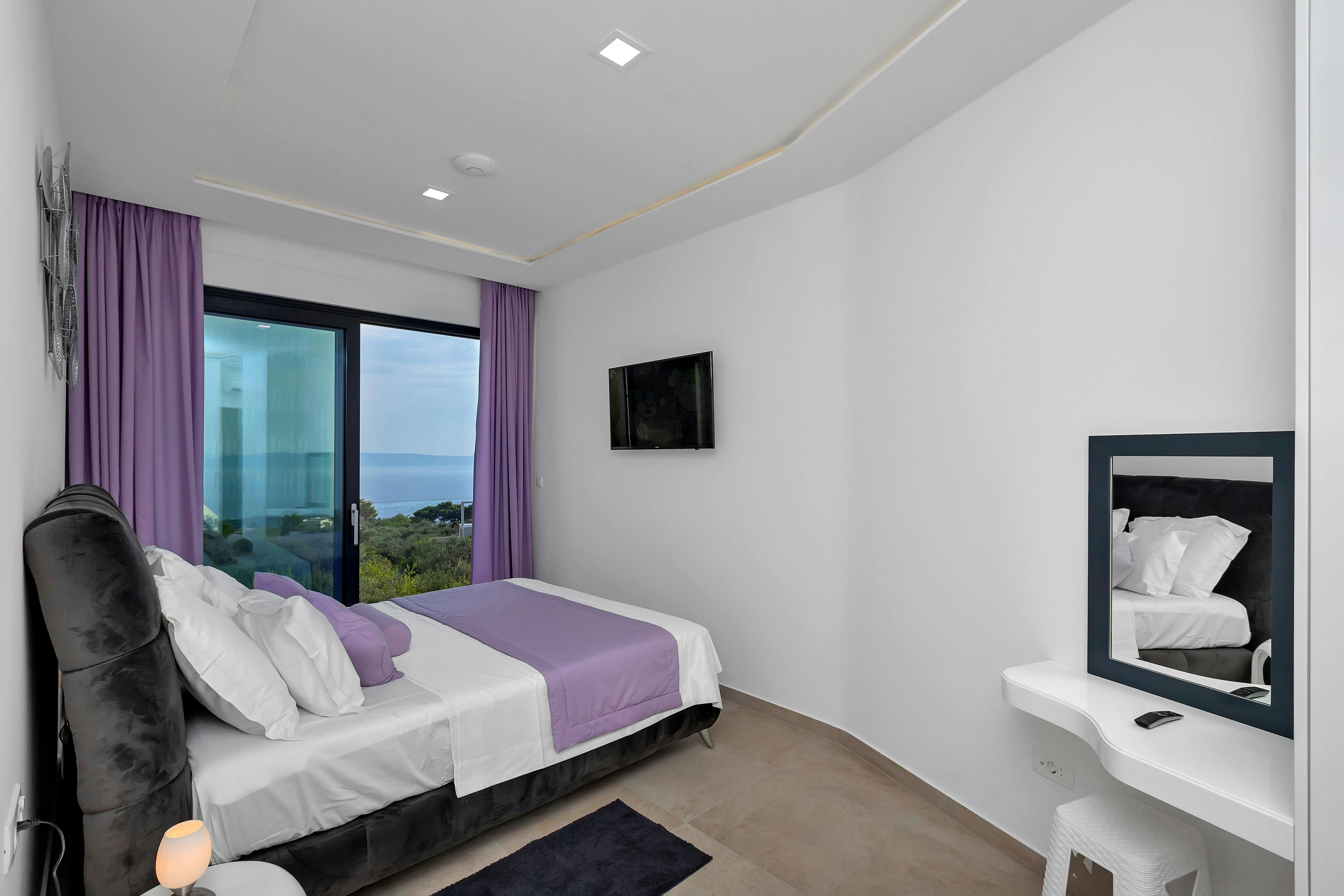 This stunning, architecturally sophisticated villa is nestled against the rugged gray mountain slopes of Makarska, boasting breathtaking sea views. The open-air setting invites guests to enjoy the 1,000-square-meter outdoor world, with a heated 40 m² pool featuring a counter-current system and hydro-massage for ultimate relaxation. In addition to comfortable loungers, guests can enjoy evening barbecues on the adjacent brick charcoal grill while taking in the Mediterranean breeze. Inside, the elegant design combines modernity and coziness, with large floor tiles and white walls providing a harmonious backdrop for the furniture. The open-plan living and dining area features a fireplace for added comfort on cooler days while the integrated kitchen boasts a high-gloss look and comprehensive equipment. Upstairs, three stylish bedrooms await with breathtaking views from floor-to-ceiling windows, all air-conditioned and equipped with their own TV and en suite bathroom for maximum privacy.