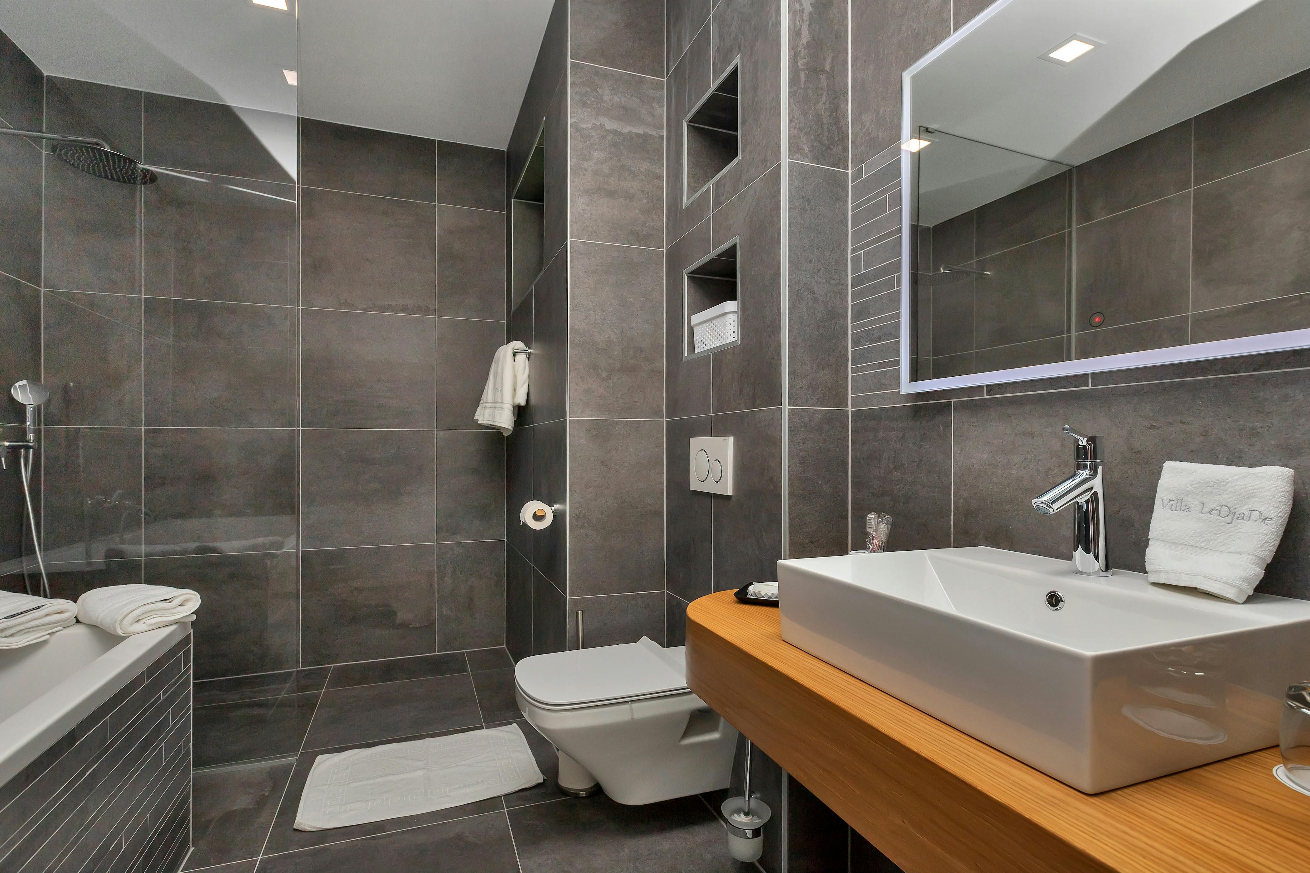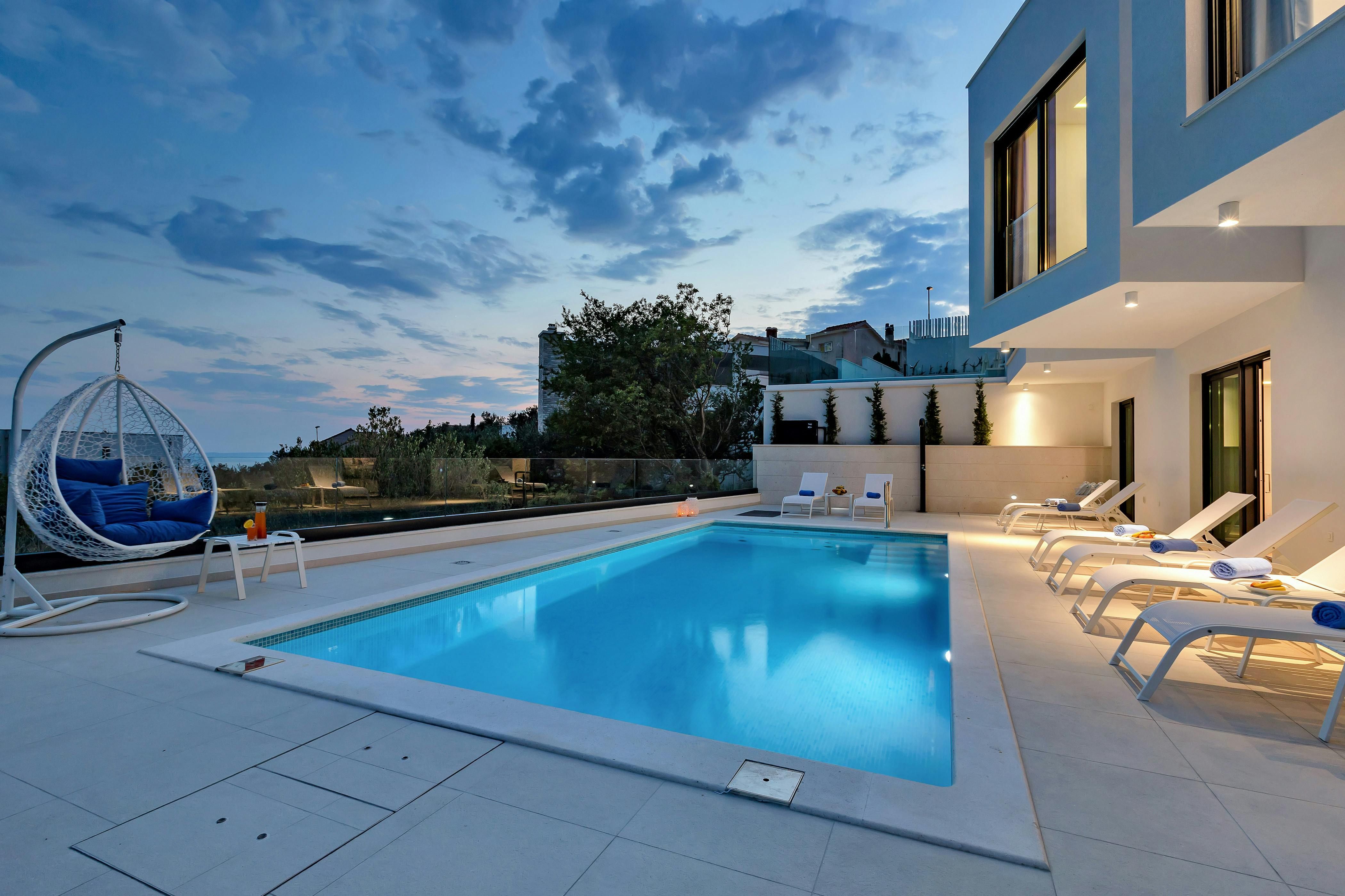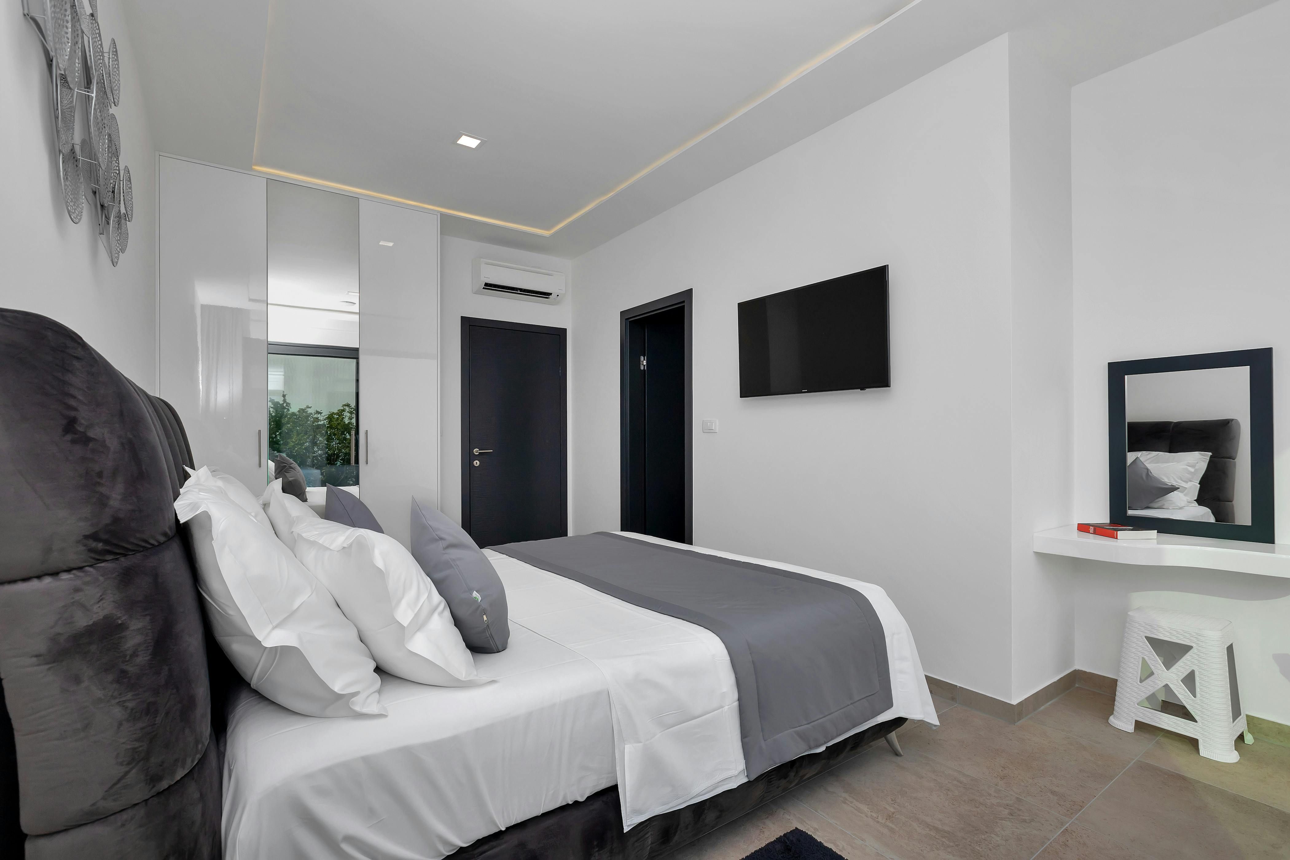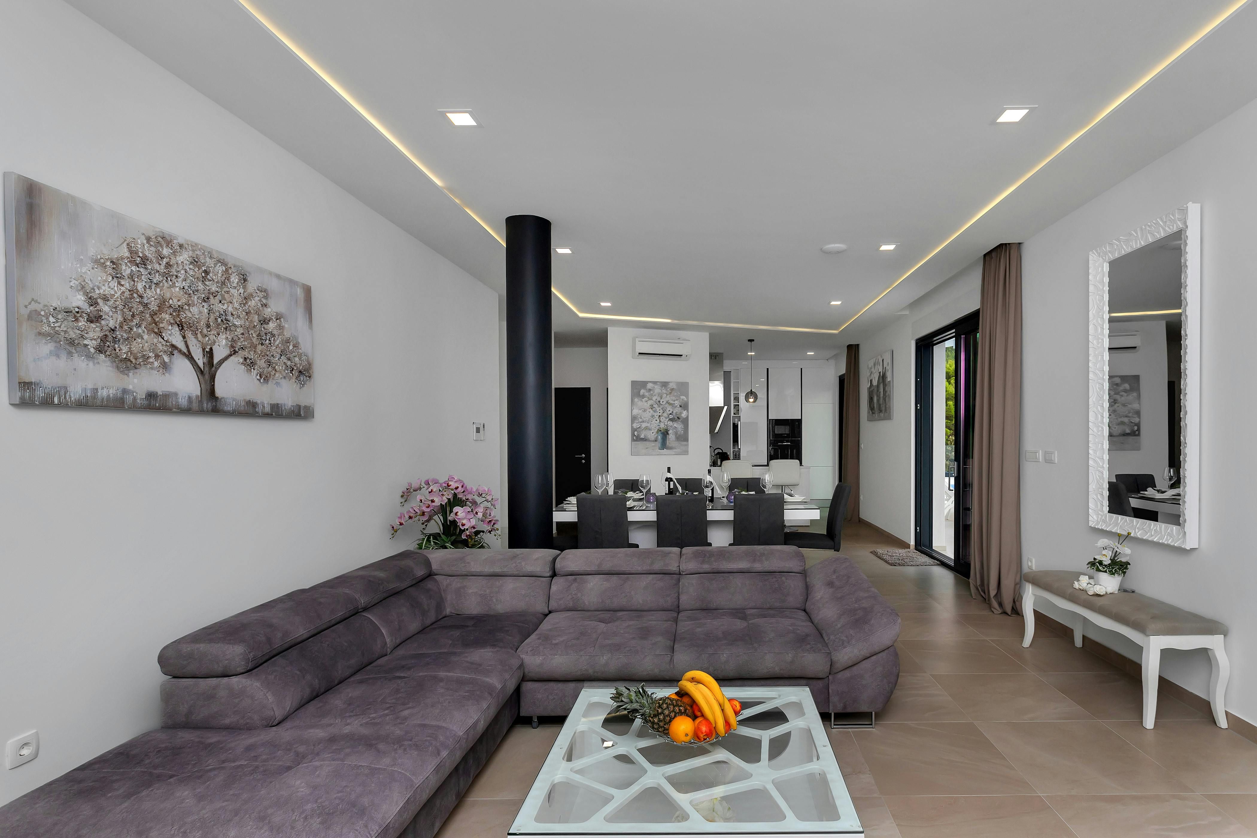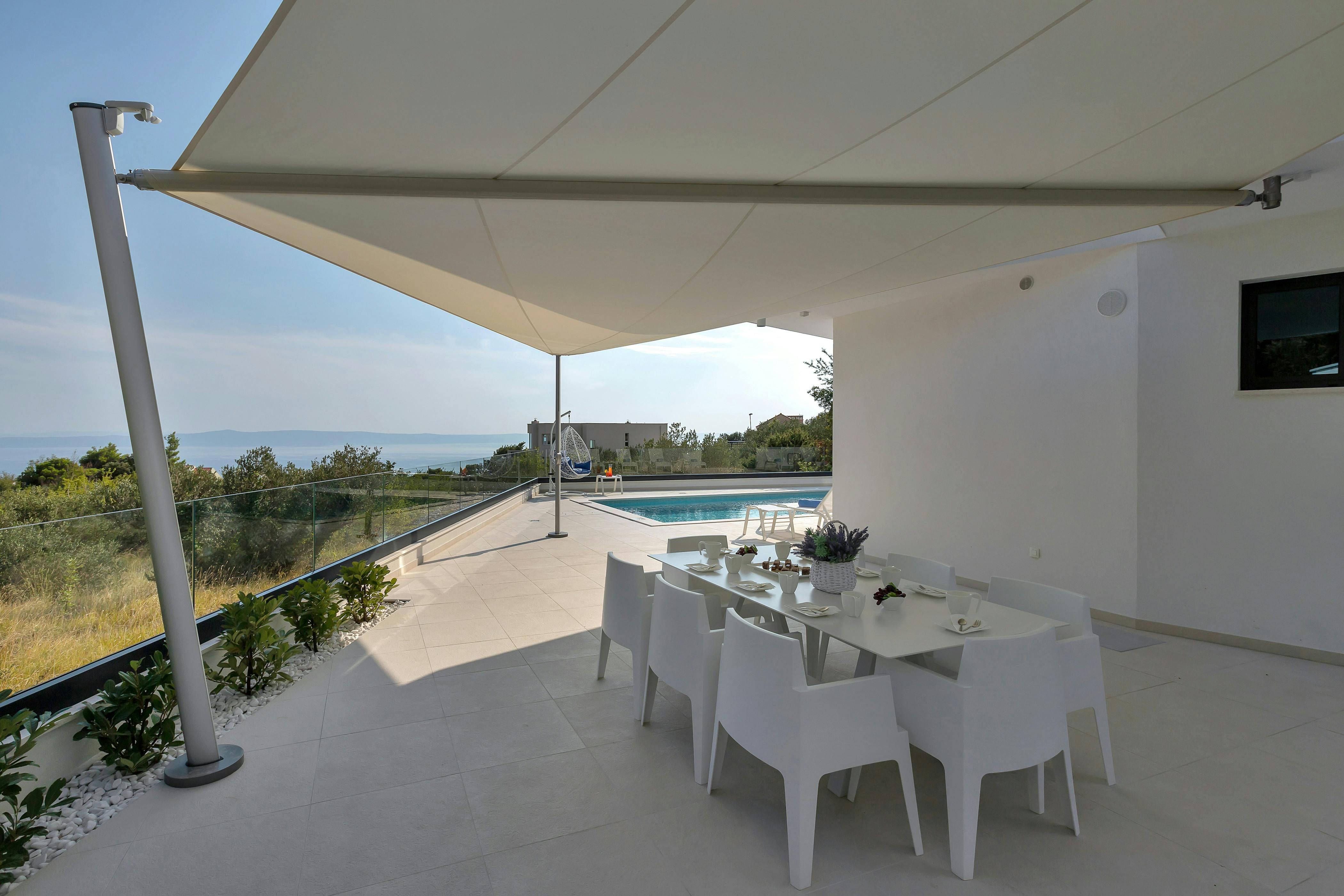 This stunning, architecturally sophisticated villa is nestled against the rugged gray mountain slopes of Makarska, boasting breathtaking sea views. The open-air setting invites guests to enjoy the 1,000-square-meter outdoor world, with a heated 40 m² pool featuring a counter-current system and hydro-massage for ultimate relaxation. In addition to comfortable loungers, guests can enjoy evening barbecues on the adjacent brick charcoal grill while taking in the Mediterranean breeze. Inside, the elegant design combines modernity and coziness, with large floor tiles and white walls providing a harmonious backdrop for the furniture. The open-plan living and dining area features a fireplace for added comfort on cooler days while the integrated kitchen boasts a high-gloss look and comprehensive equipment. Upstairs, three stylish bedrooms await with breathtaking views from floor-to-ceiling windows, all air-conditioned and equipped with their own TV and en suite bathroom for maximum privacy.