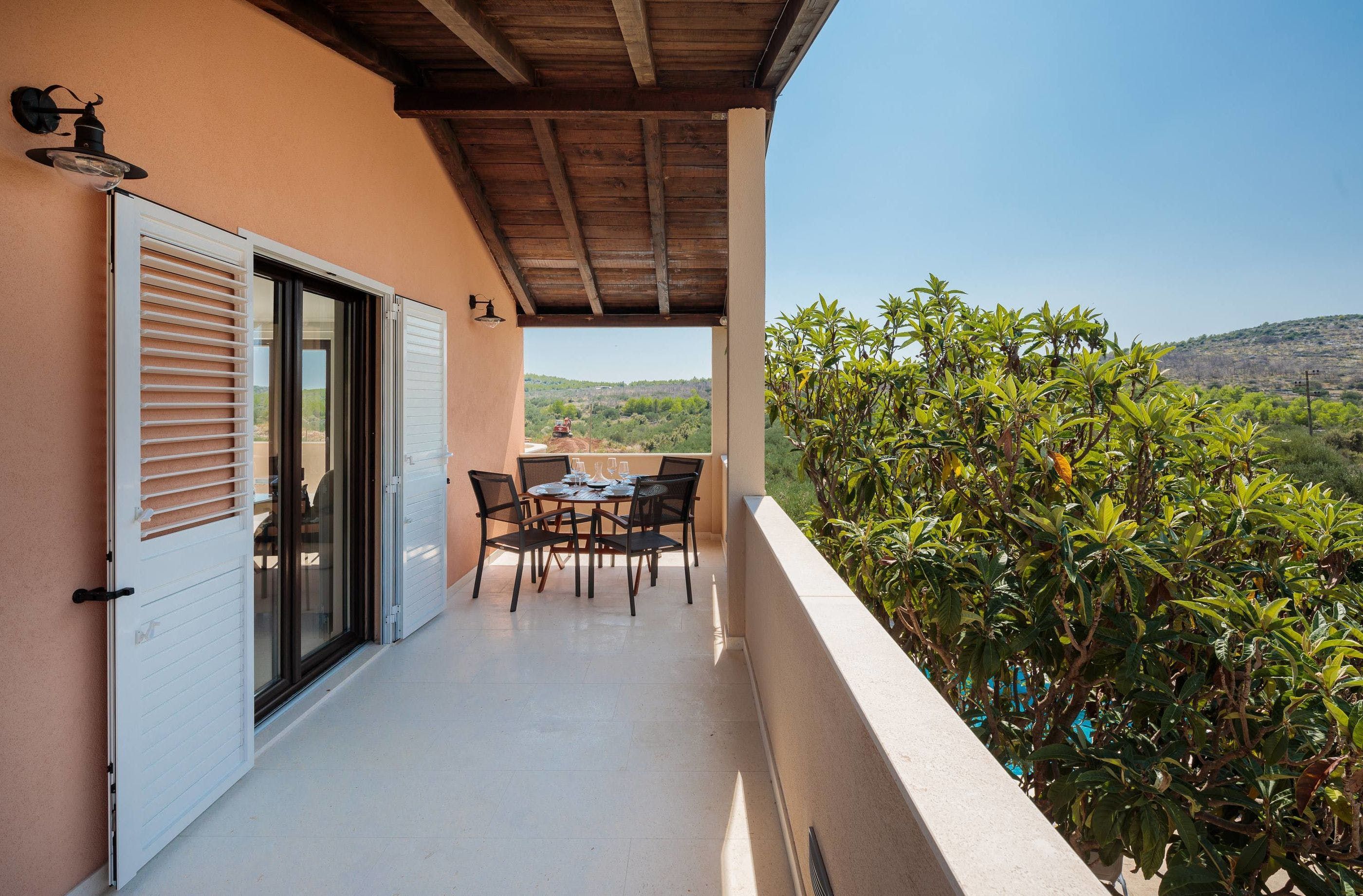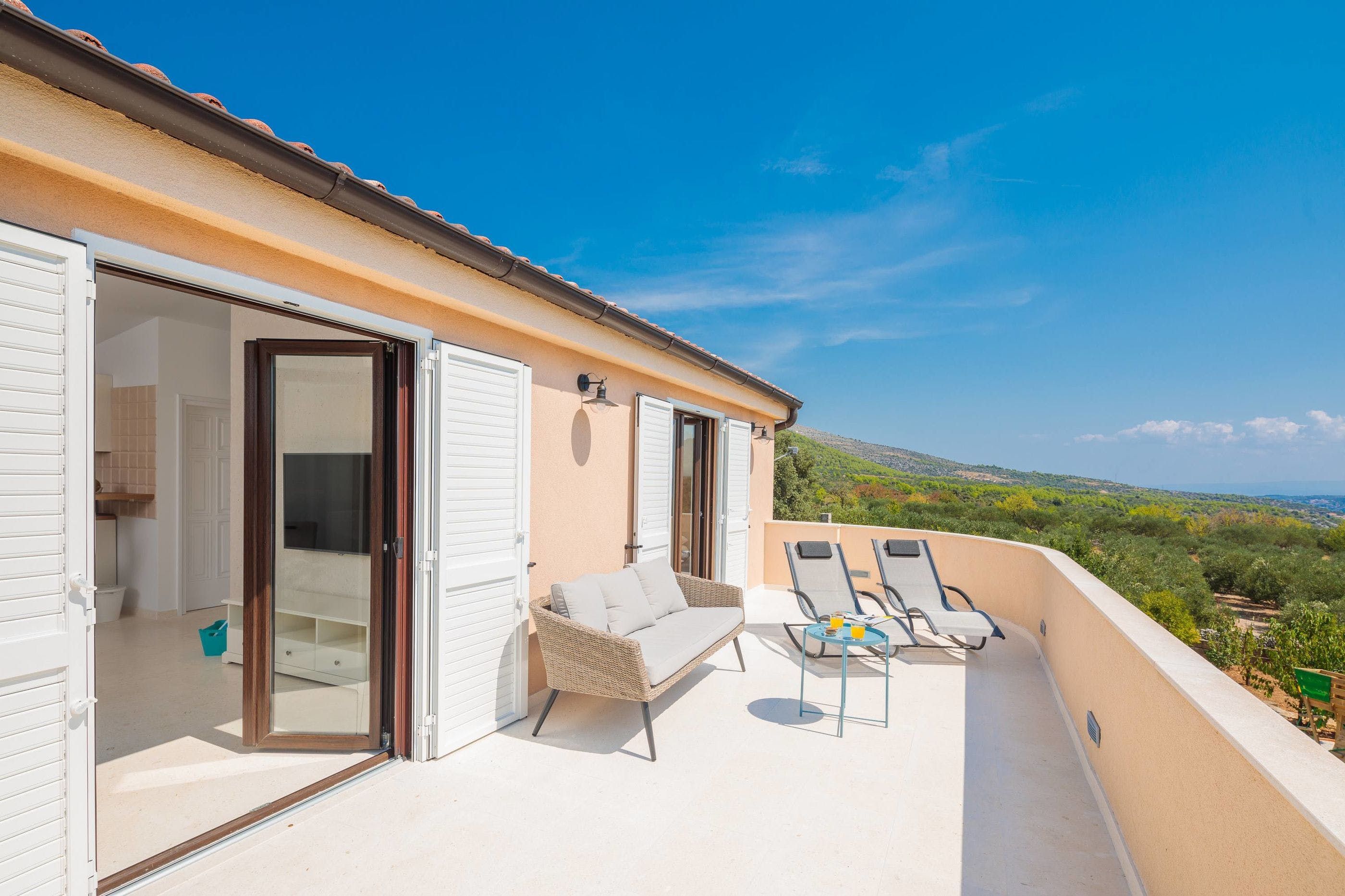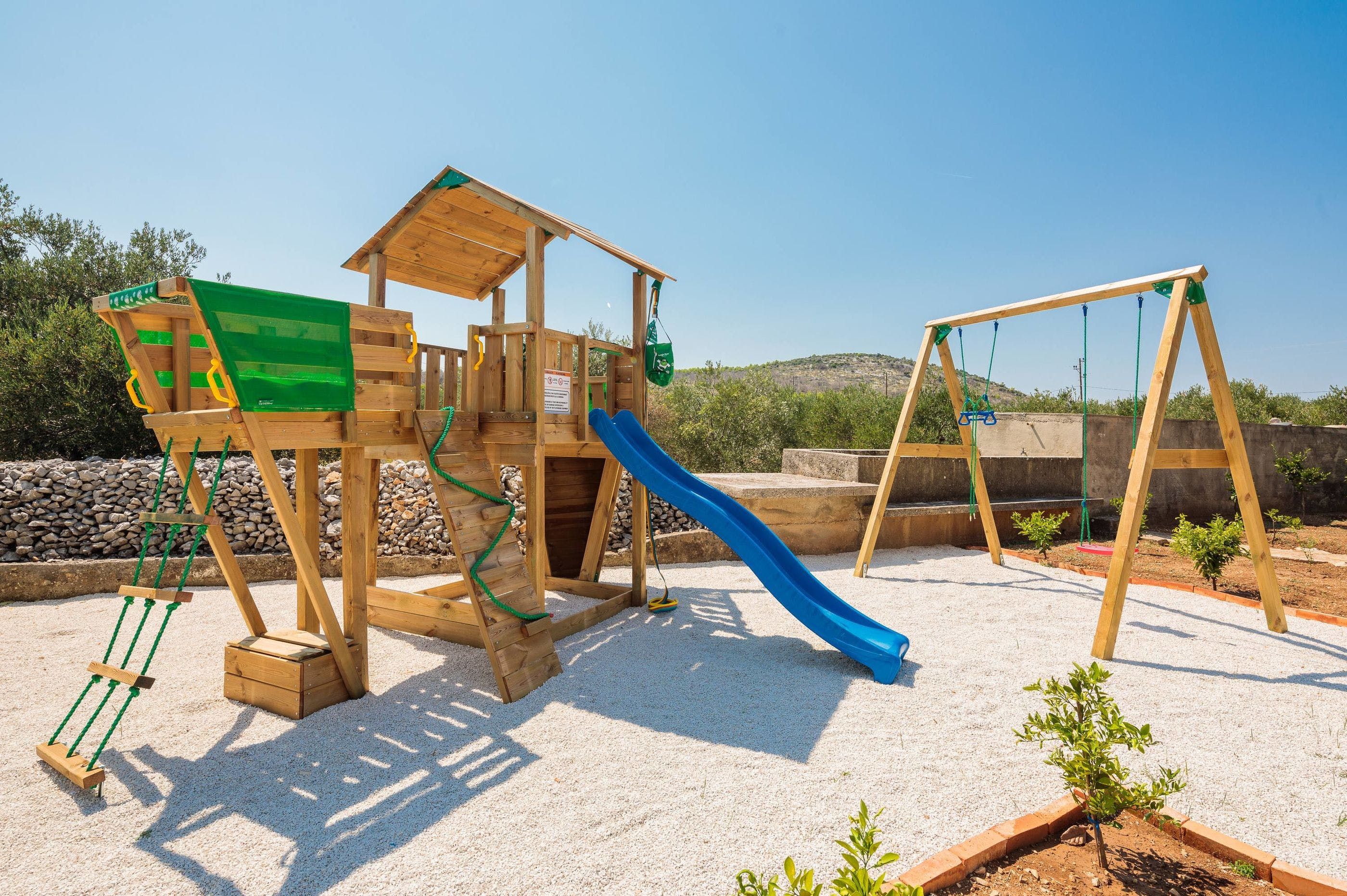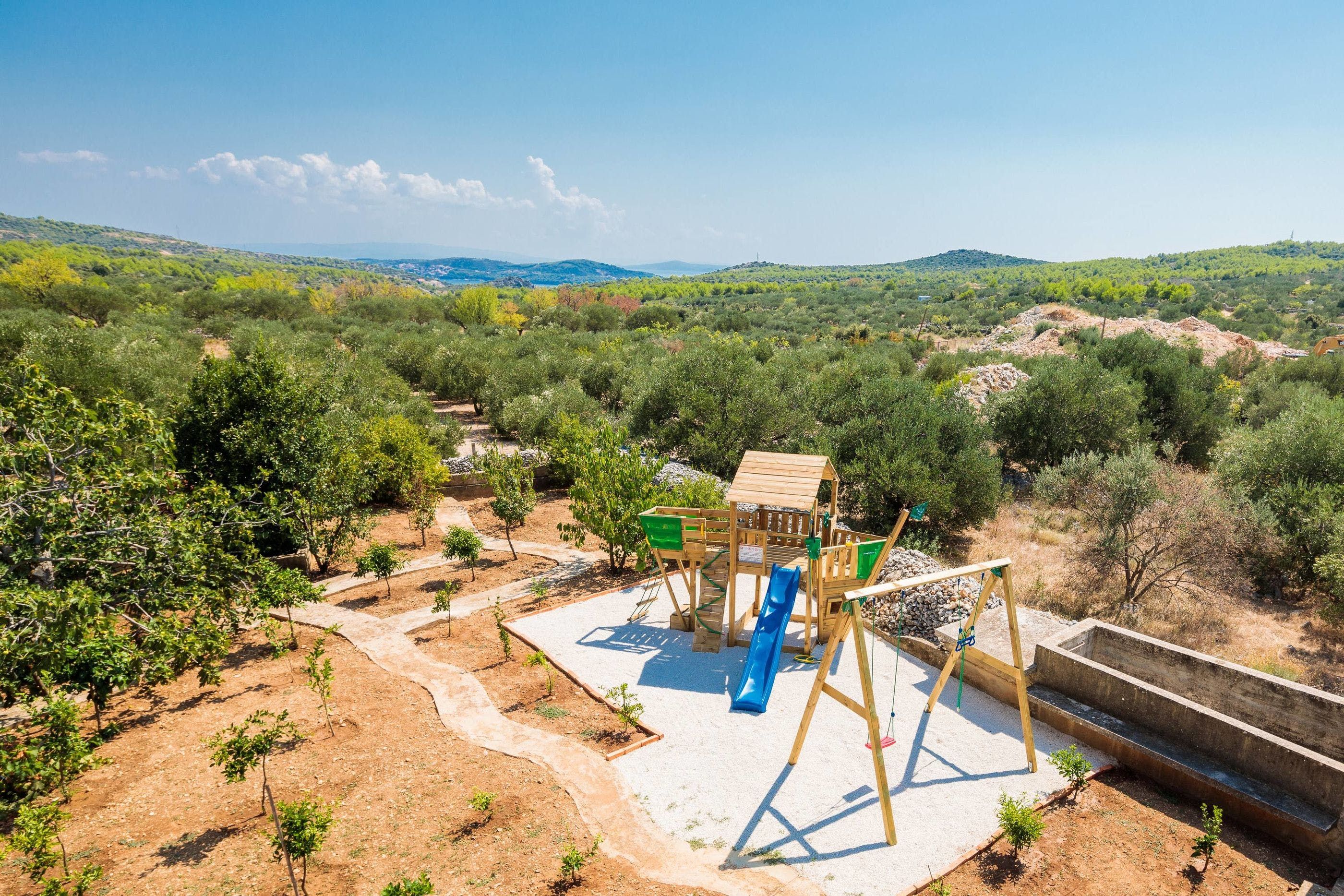 Inside, you can crowd around a white stone fireplace, and rustle up some wine and snacks in the cosy stone kitchenette and diner. Upstairs, you’ll find a second reception area, where you can take in the stunning views from the balcony, and cook up some breakfast in the dining area. Little ones can also tear around the private playground set among the trees – this villa offers plenty of space to roam.