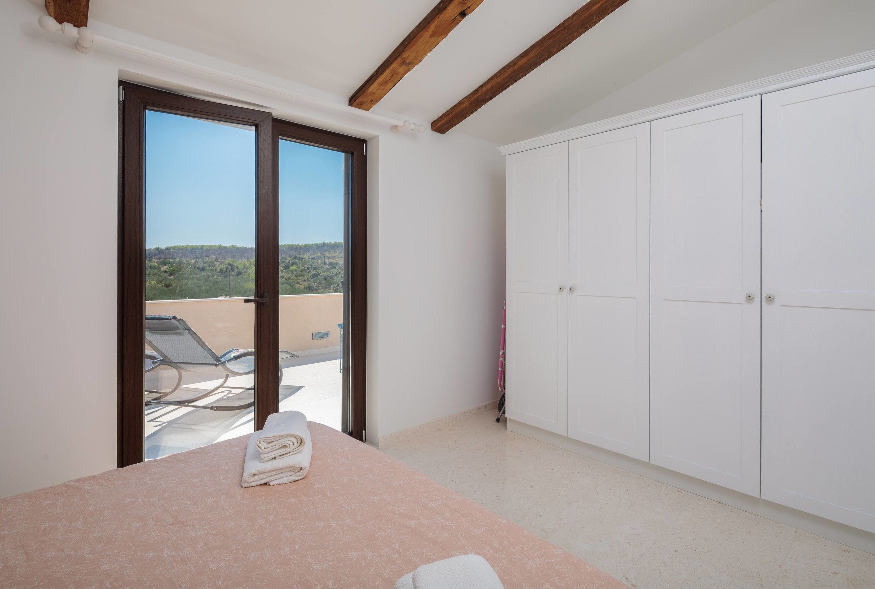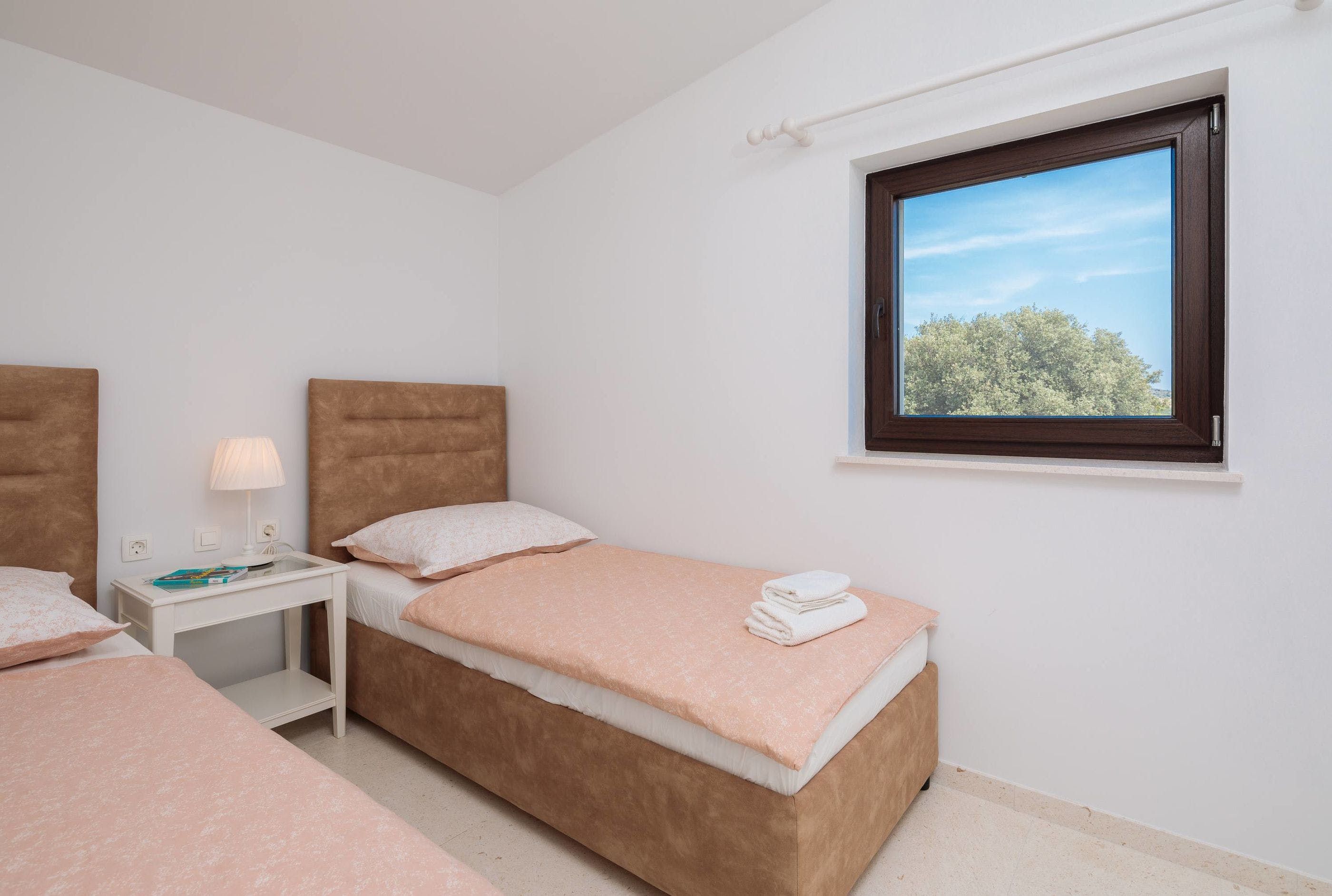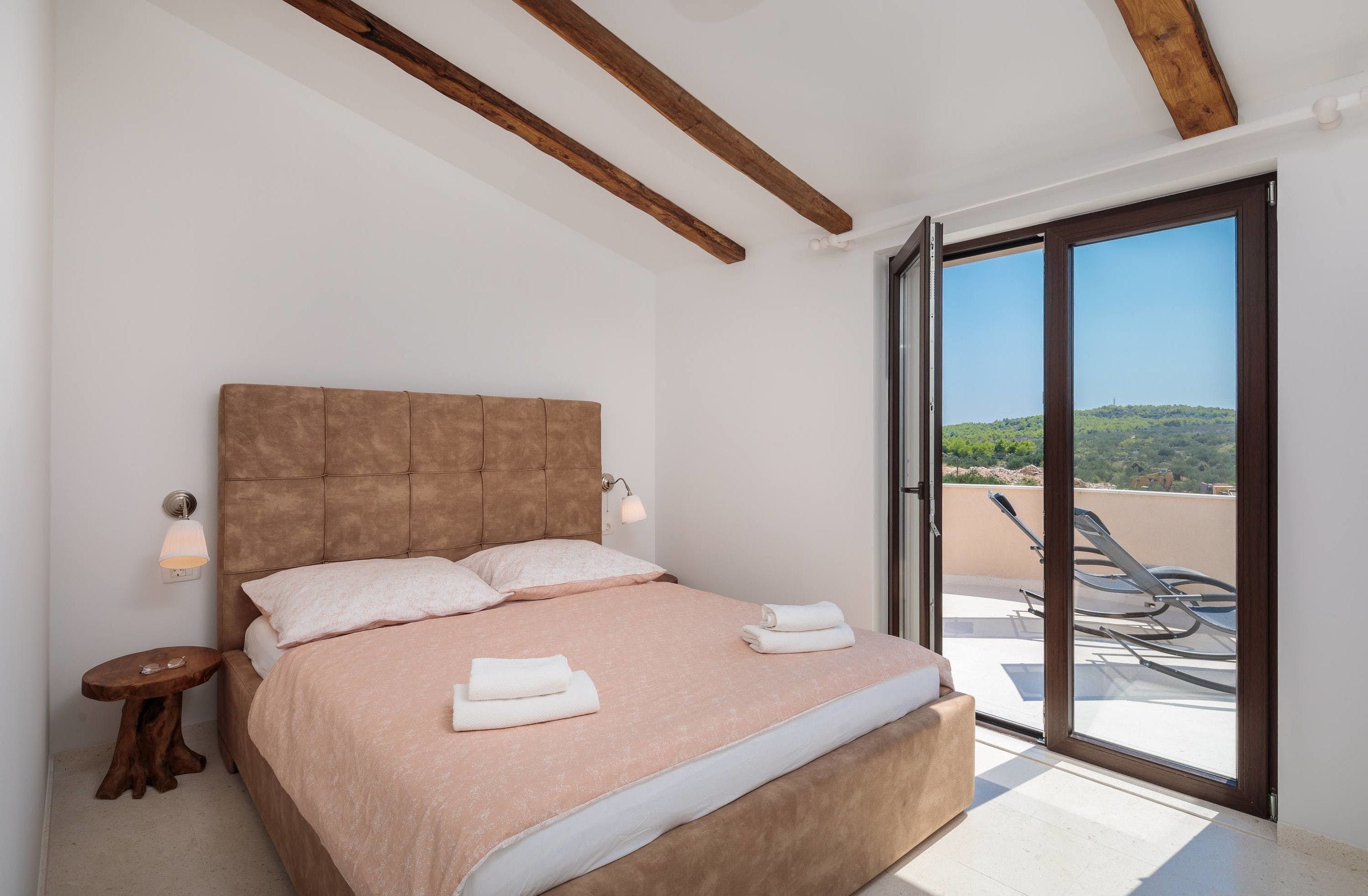 Inside, you can crowd around a white stone fireplace, and rustle up some wine and snacks in the cosy stone kitchenette and diner. Upstairs, you’ll find a second reception area, where you can take in the stunning views from the balcony, and cook up some breakfast in the dining area. Little ones can also tear around the private playground set among the trees – this villa offers plenty of space to roam.