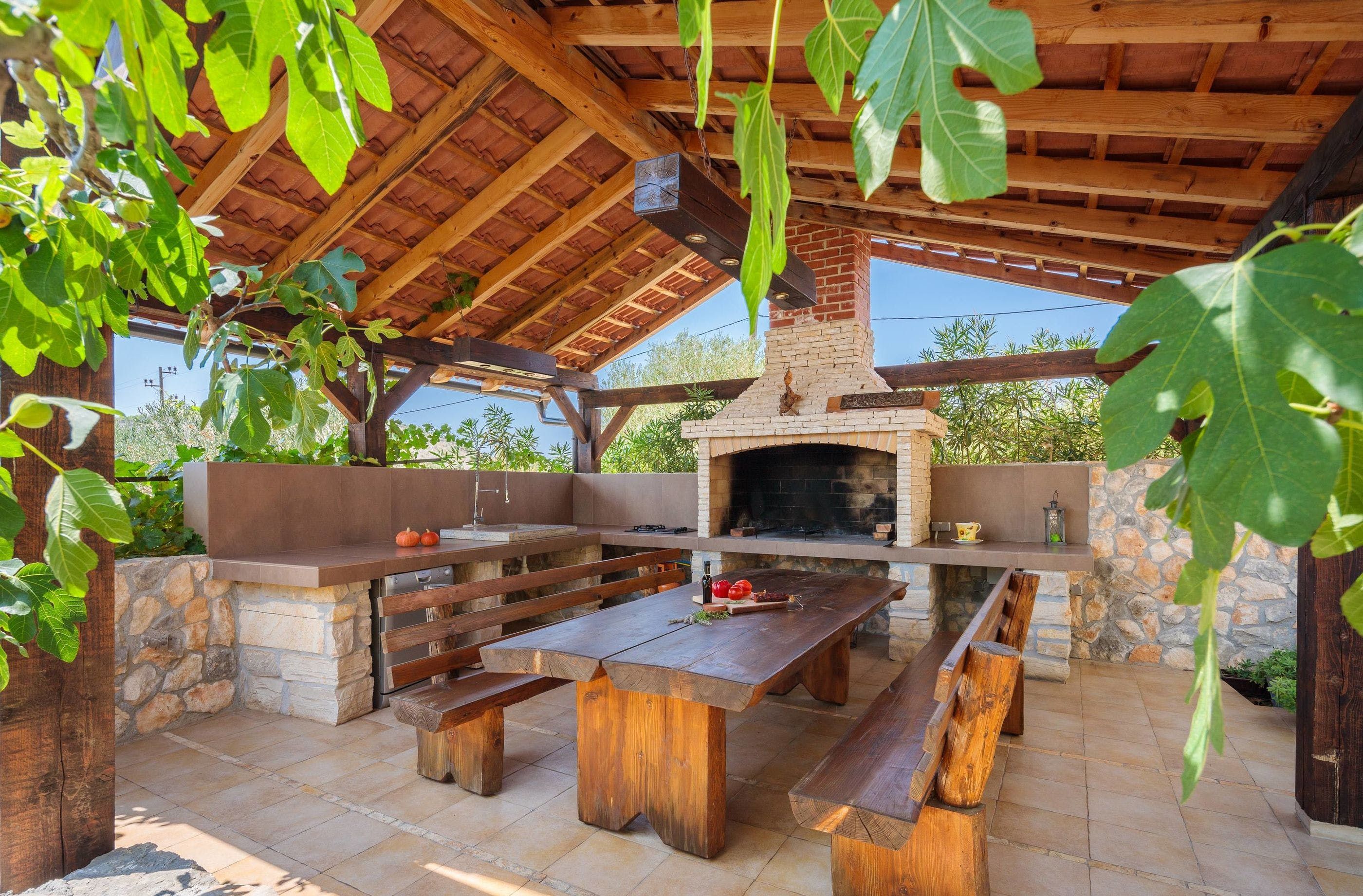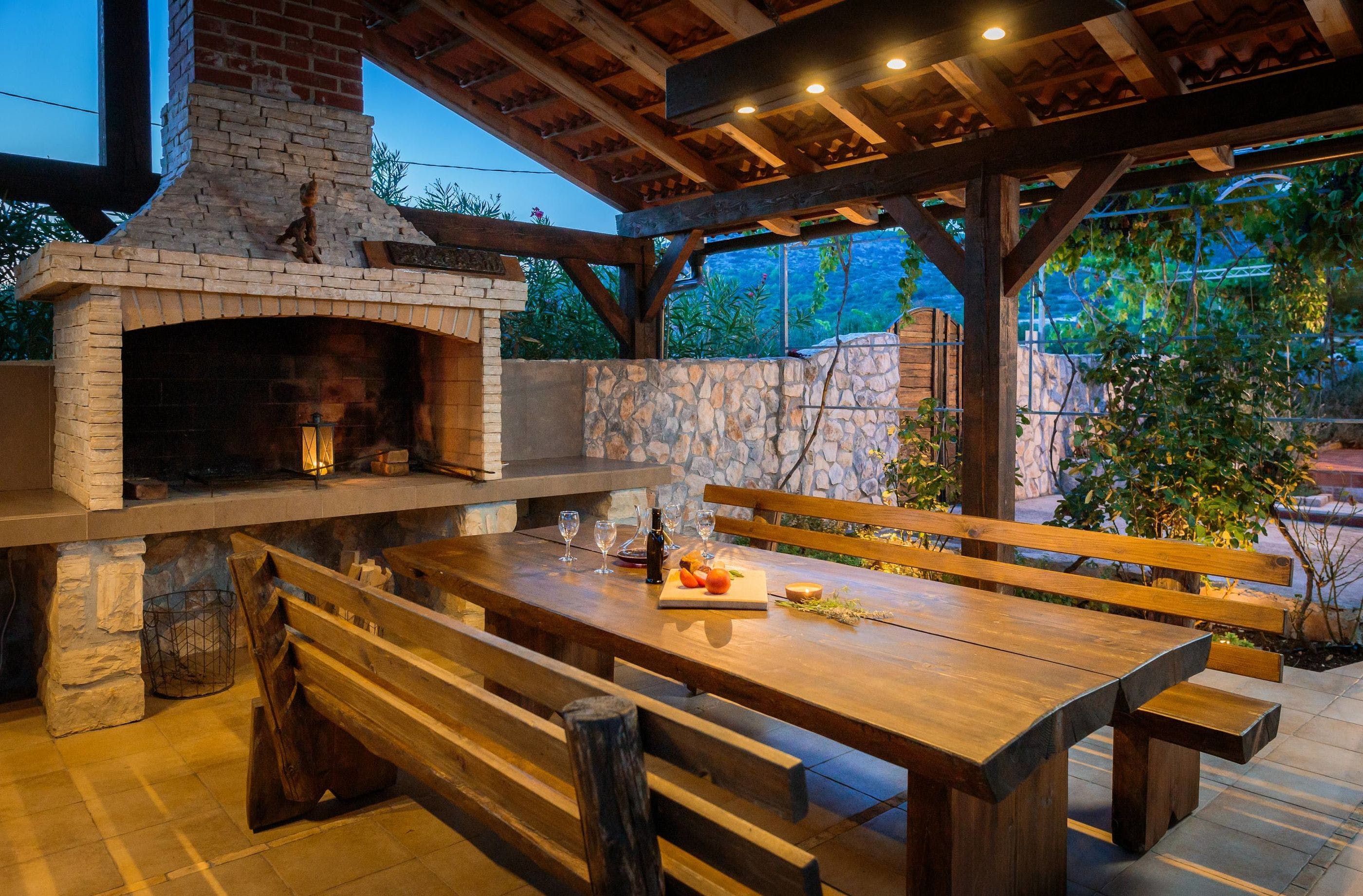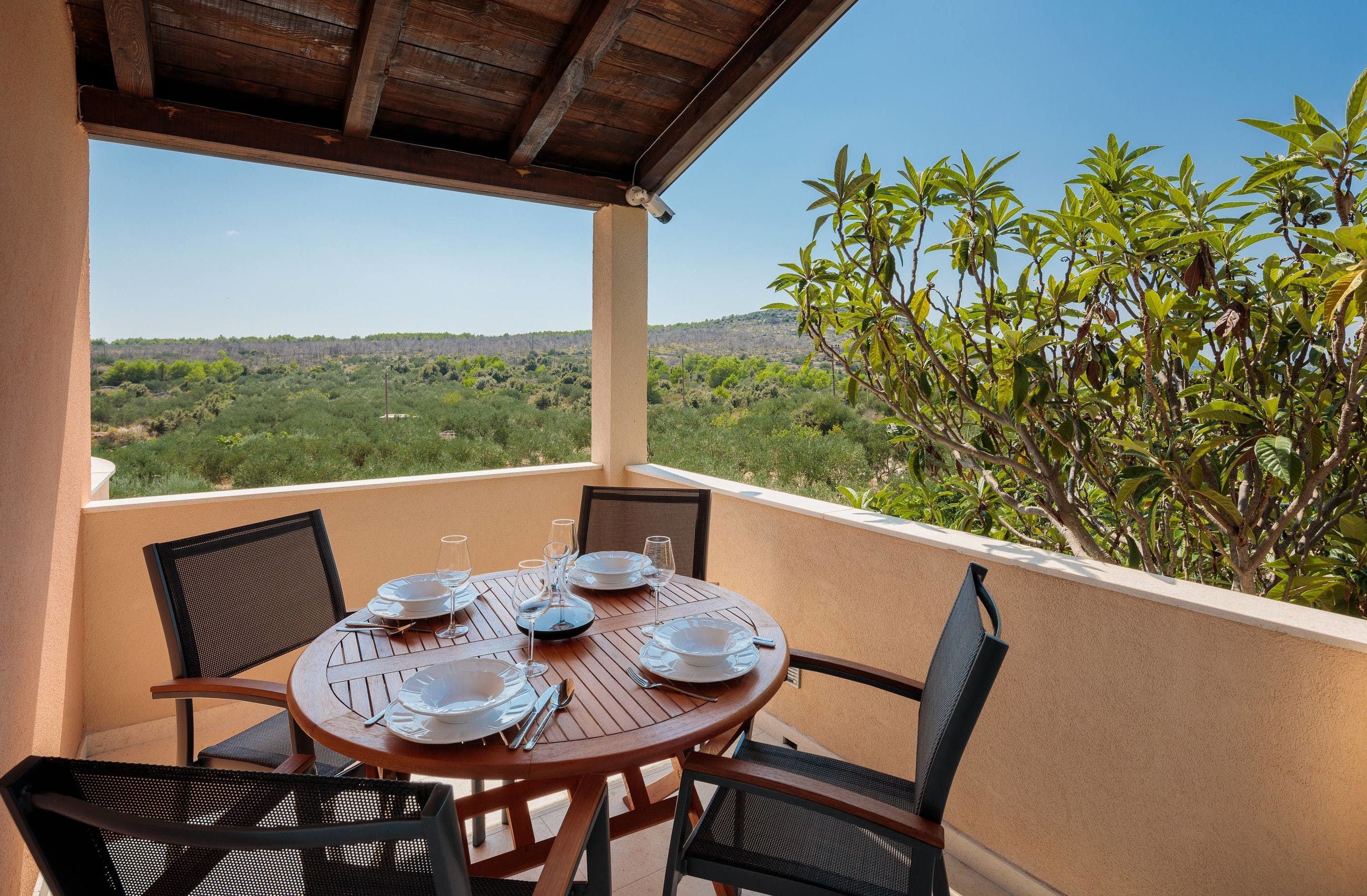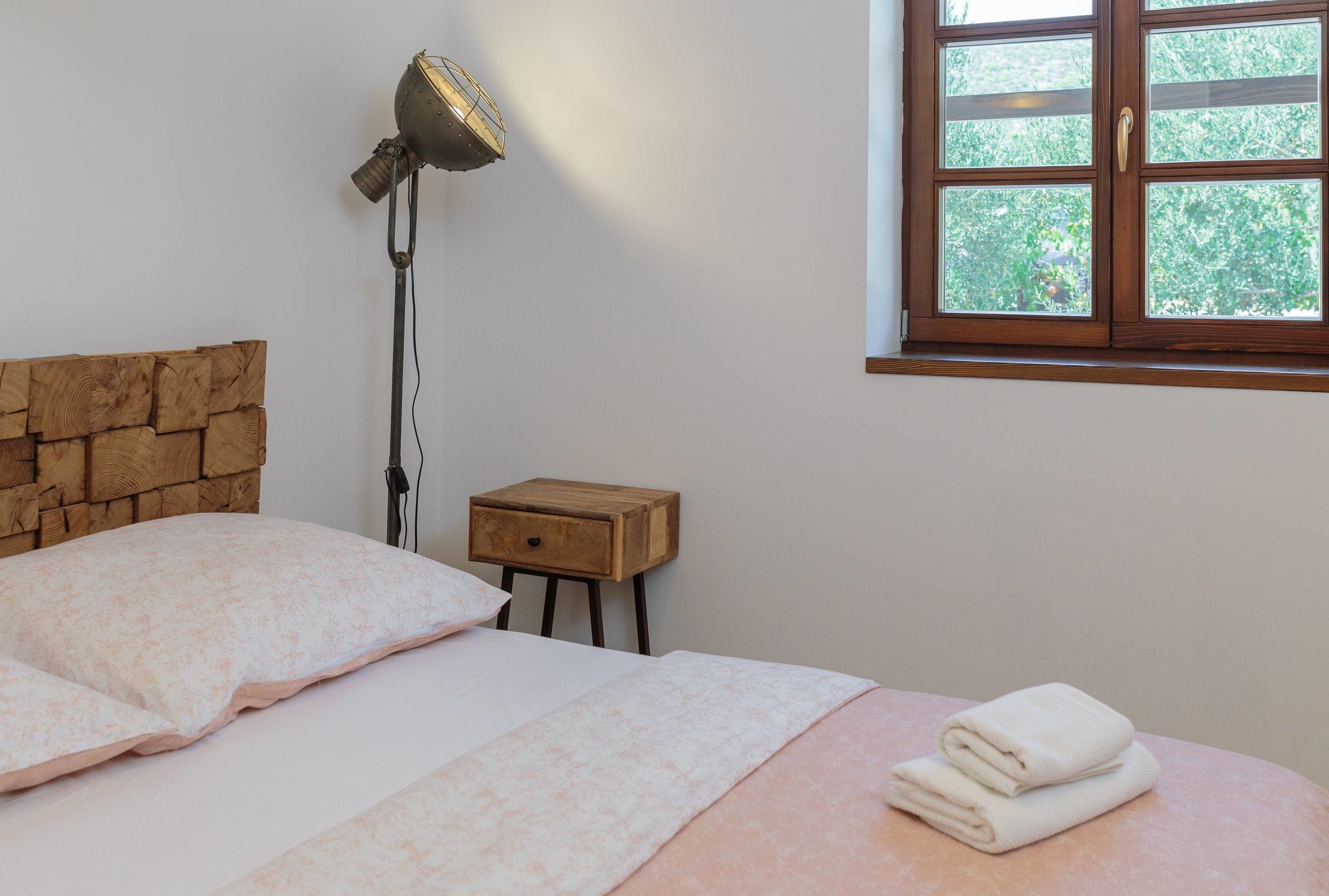 Inside, you can crowd around a white stone fireplace, and rustle up some wine and snacks in the cosy stone kitchenette and diner. Upstairs, you’ll find a second reception area, where you can take in the stunning views from the balcony, and cook up some breakfast in the dining area. Little ones can also tear around the private playground set among the trees – this villa offers plenty of space to roam.