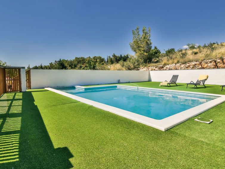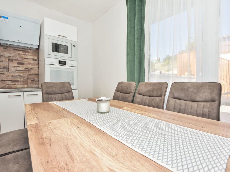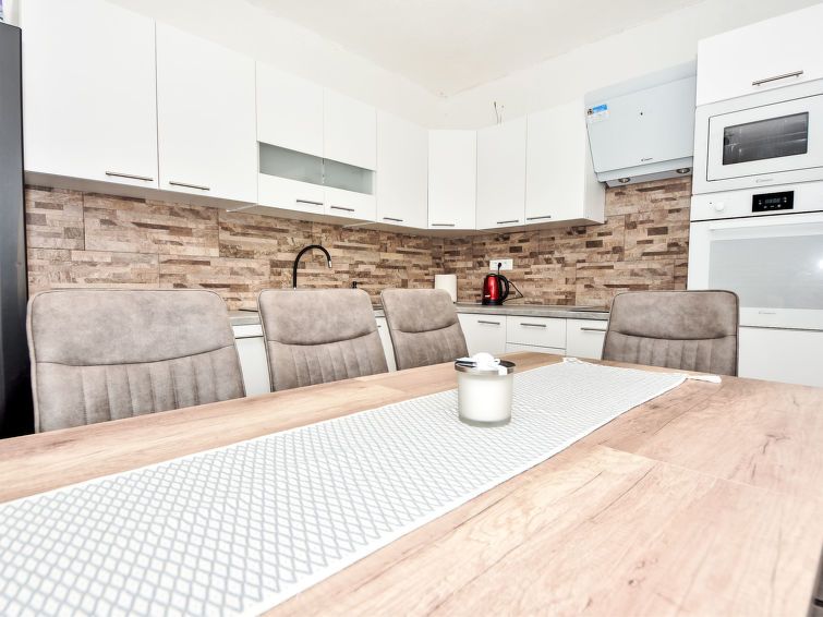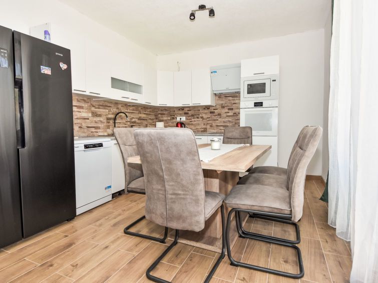 4-room house 100 m2 on 1st floor, south-west facing position. Living/dining room 30 m2 with 1 sofabed (140 cm, length 200 cm), satellite TV (flat screen), air conditioning. Exit to the terrace. 3 rooms, each room with 1 french bed (180 cm, length 200 cm). Open kitchen (4 hot plates, oven, microwave, freezer, electric coffee machine).