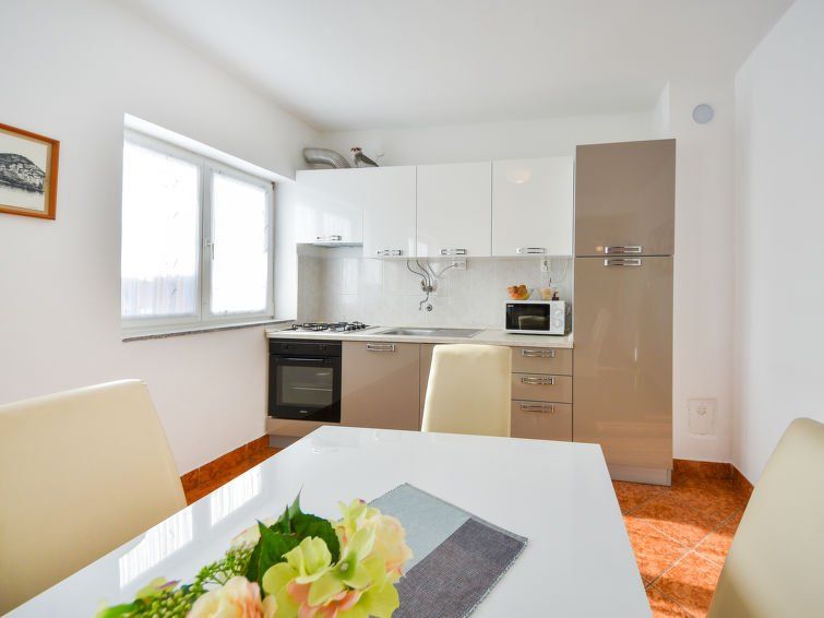 3-room house 75 m2 on 2 levels, south-west facing position. Living/dining room 30 m2 with 1 sofabed (120 cm, length 180 cm), satellite TV (flat screen), fan. Open kitchen (4 hot plates, oven, dishwasher, microwave, freezer, electric coffee machine). Shower/WC. Upper floor: entrance hall with air conditioning.