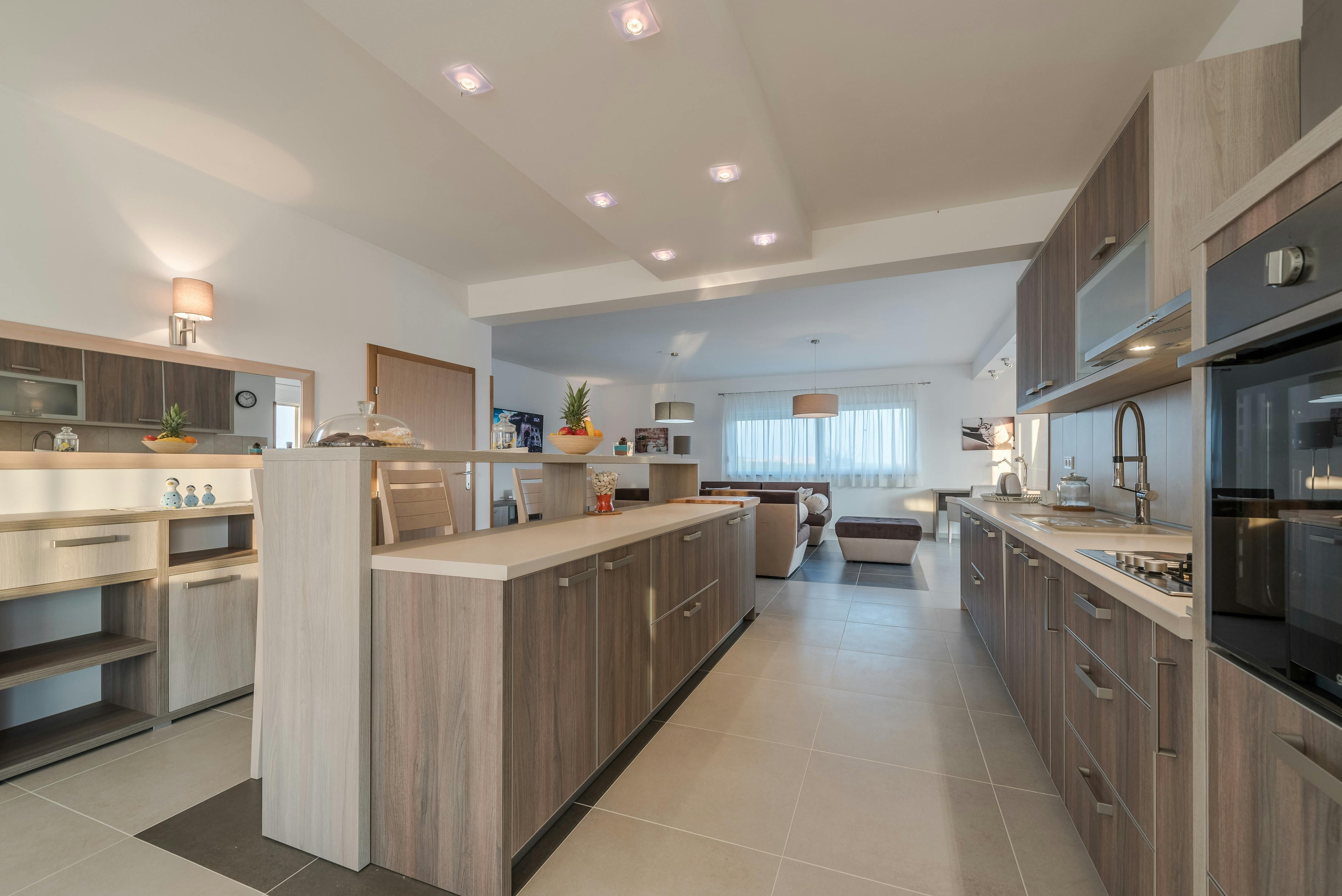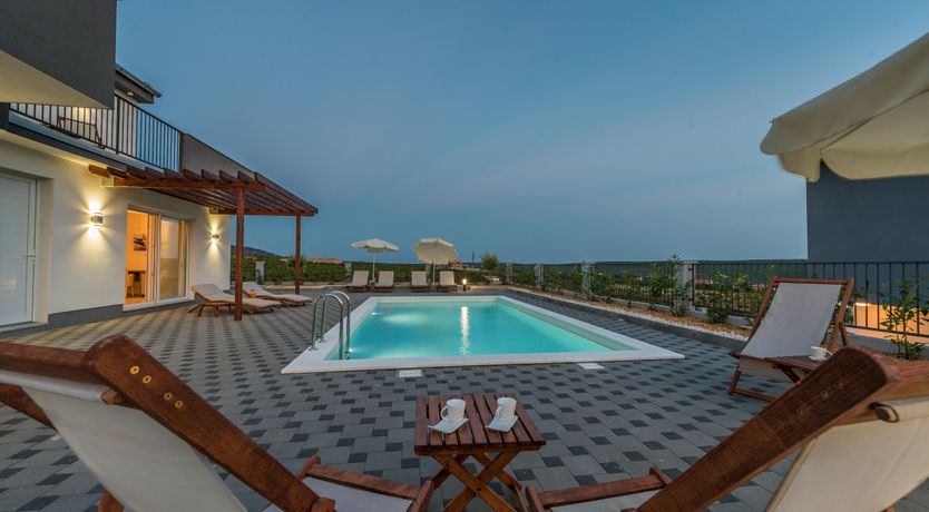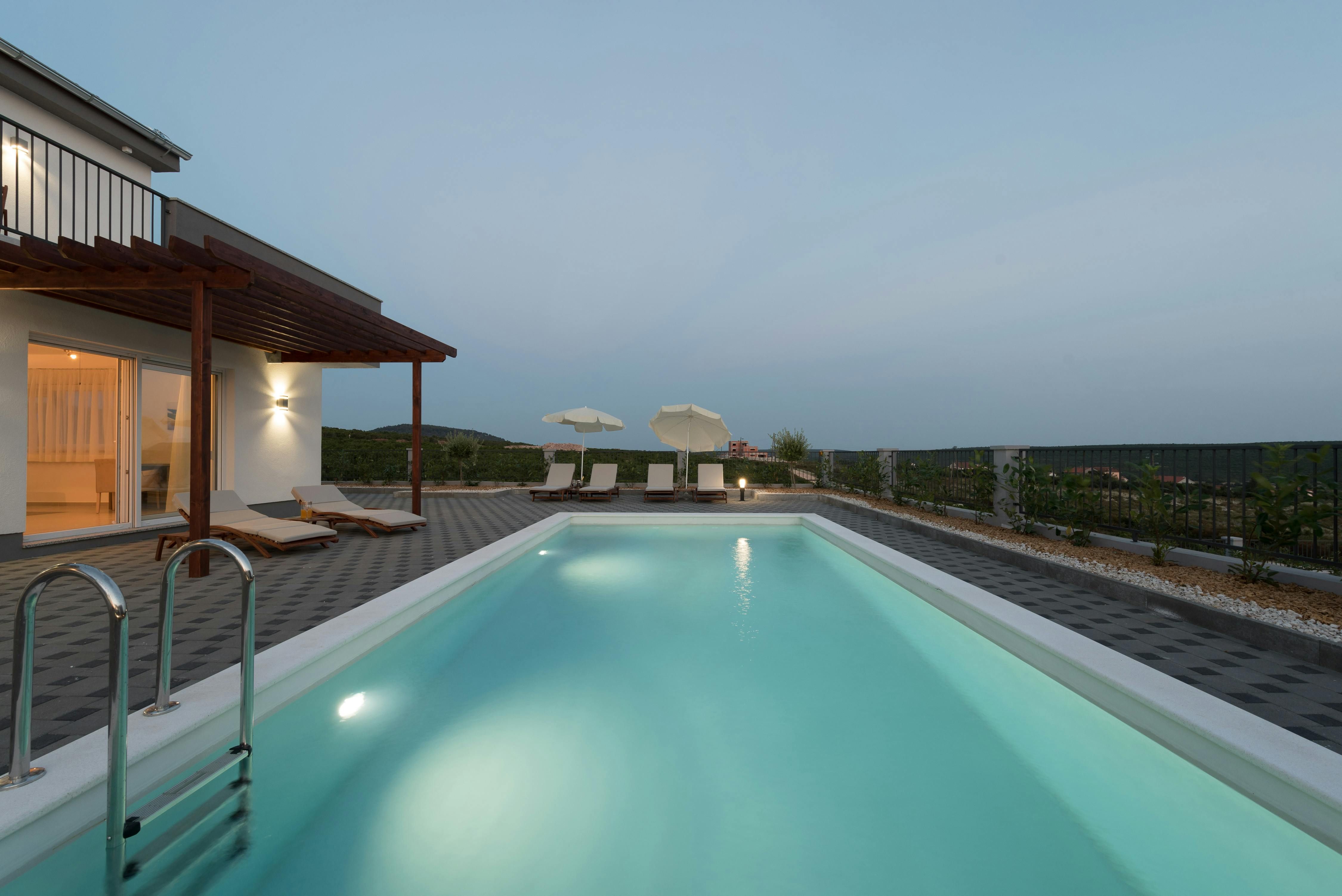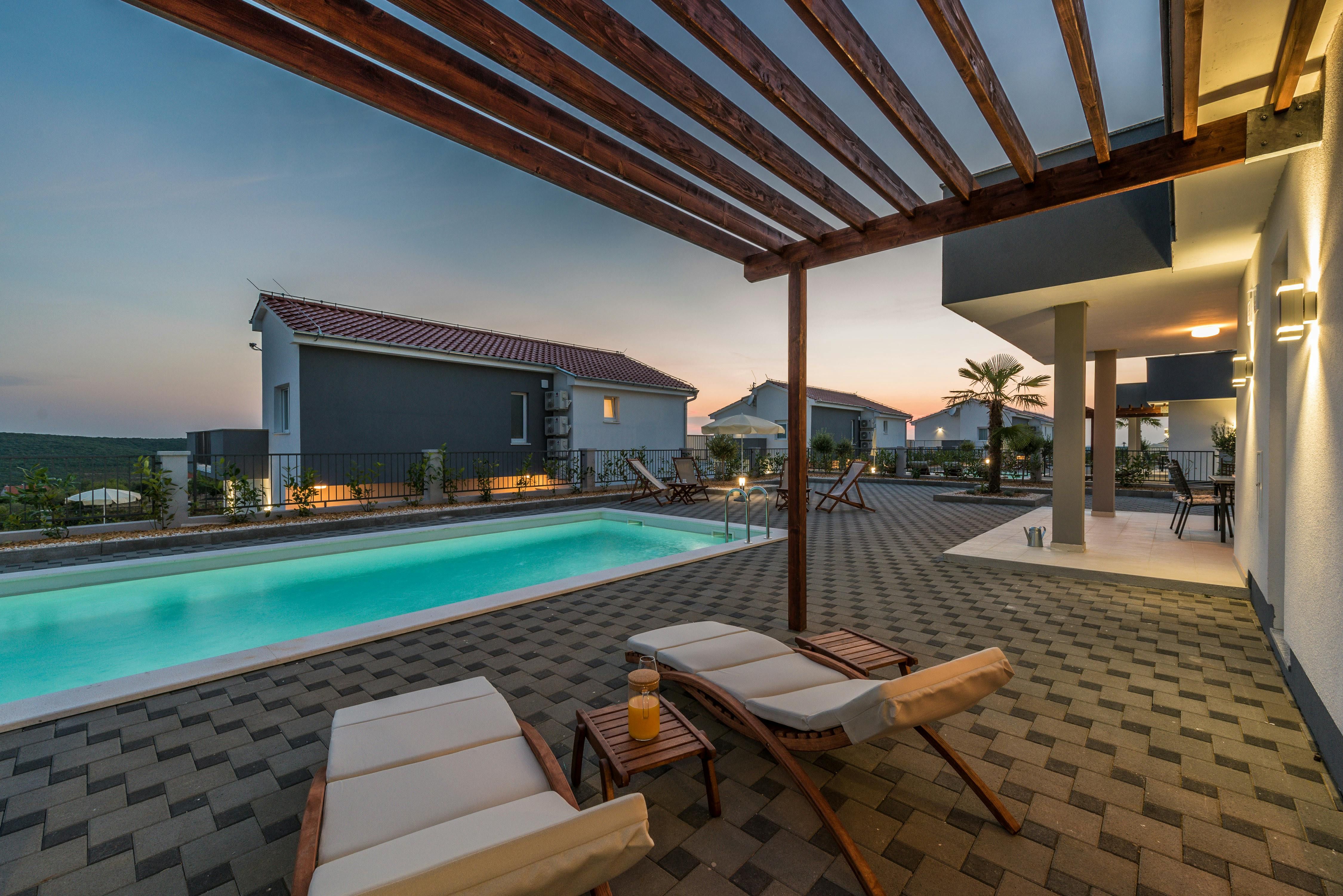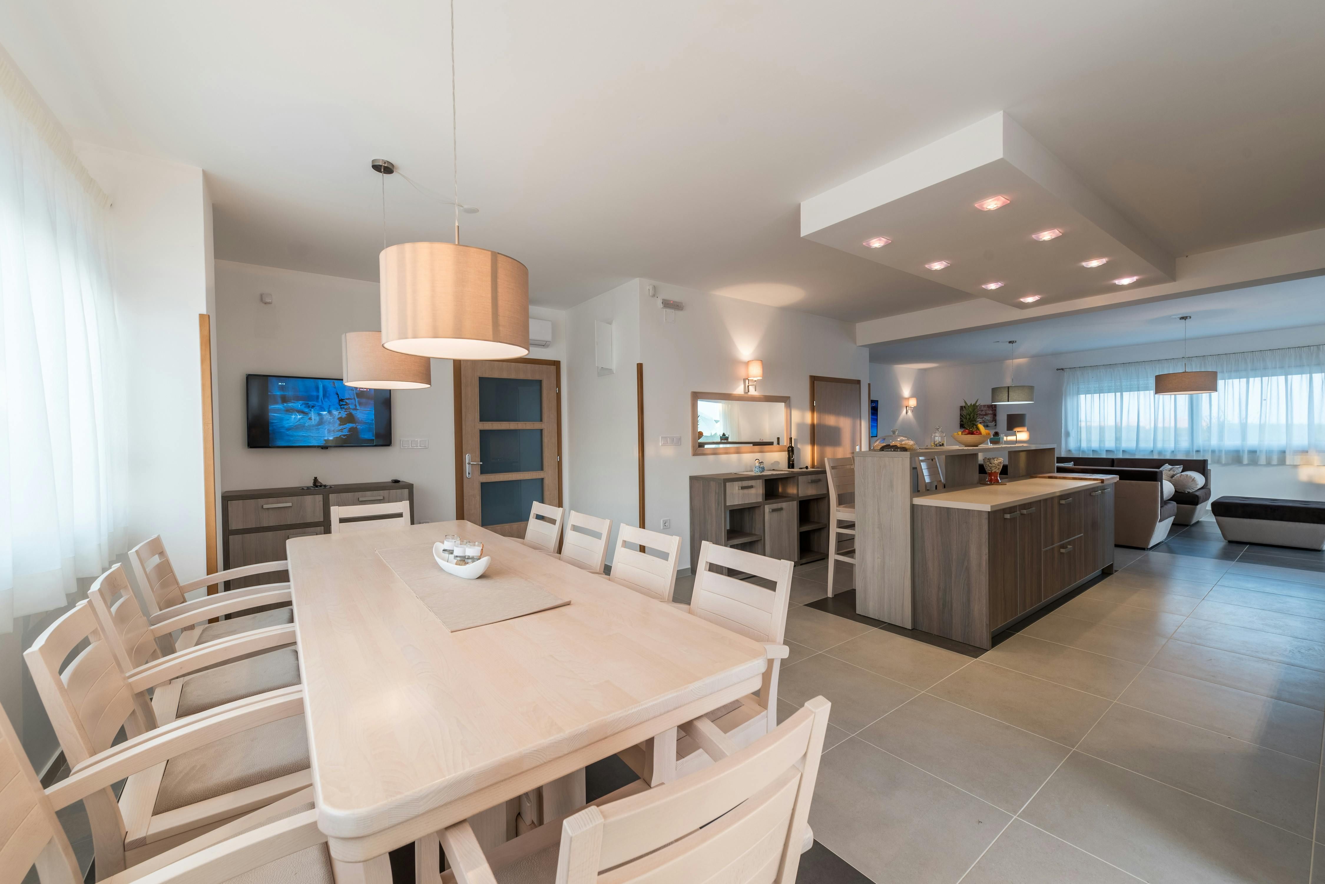 This home is a stunning family villa located in the Villen Resort near Sukosan, Croatia. The modern architecture and sleek white façade offer an attractive holiday comfort both indoors and outdoors. The villa boasts a 36m² pool, several seating areas with comfortable furniture, and a barbecue area perfect for relaxing and soaking up the views of the surrounding landscape. The open floor plan of the interior cleverly combines living room, dining room, and kitchen with many windows and clever lighting creating a harmonious atmosphere. The fully equipped kitchen with central counter makes self-catering easy for larger travel groups. The four double rooms each have their own bathroom and direct access to the balcony or pool terrace. Nearby Sukosan offers beautiful stretches of sea, the largest marina in the Adriatic - Zlatna Luka, ideal beaches for families with children, local restaurants serving delicious cuisine, and "Fun Park Mirnovec" offering adrenaline experiences. With all three national parks (Kornati, Krka, Paklenica) within a radius of 30 km, boredom has no chance.