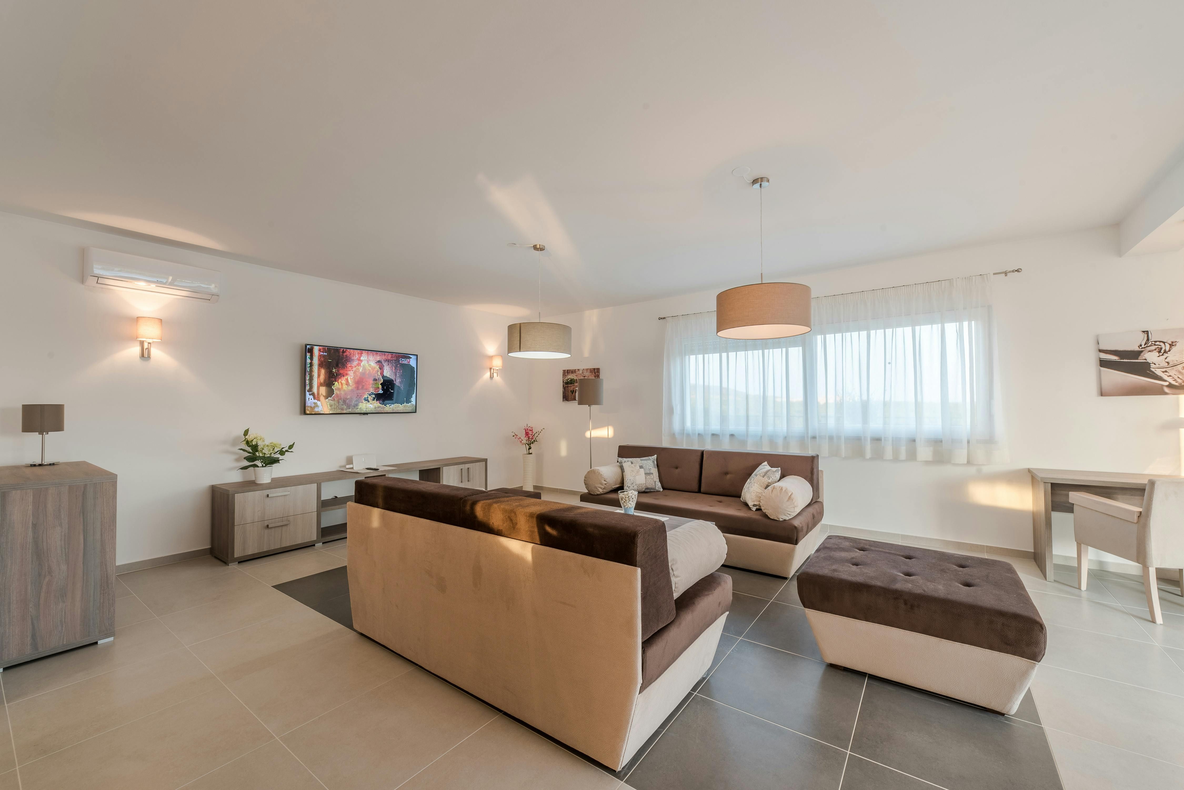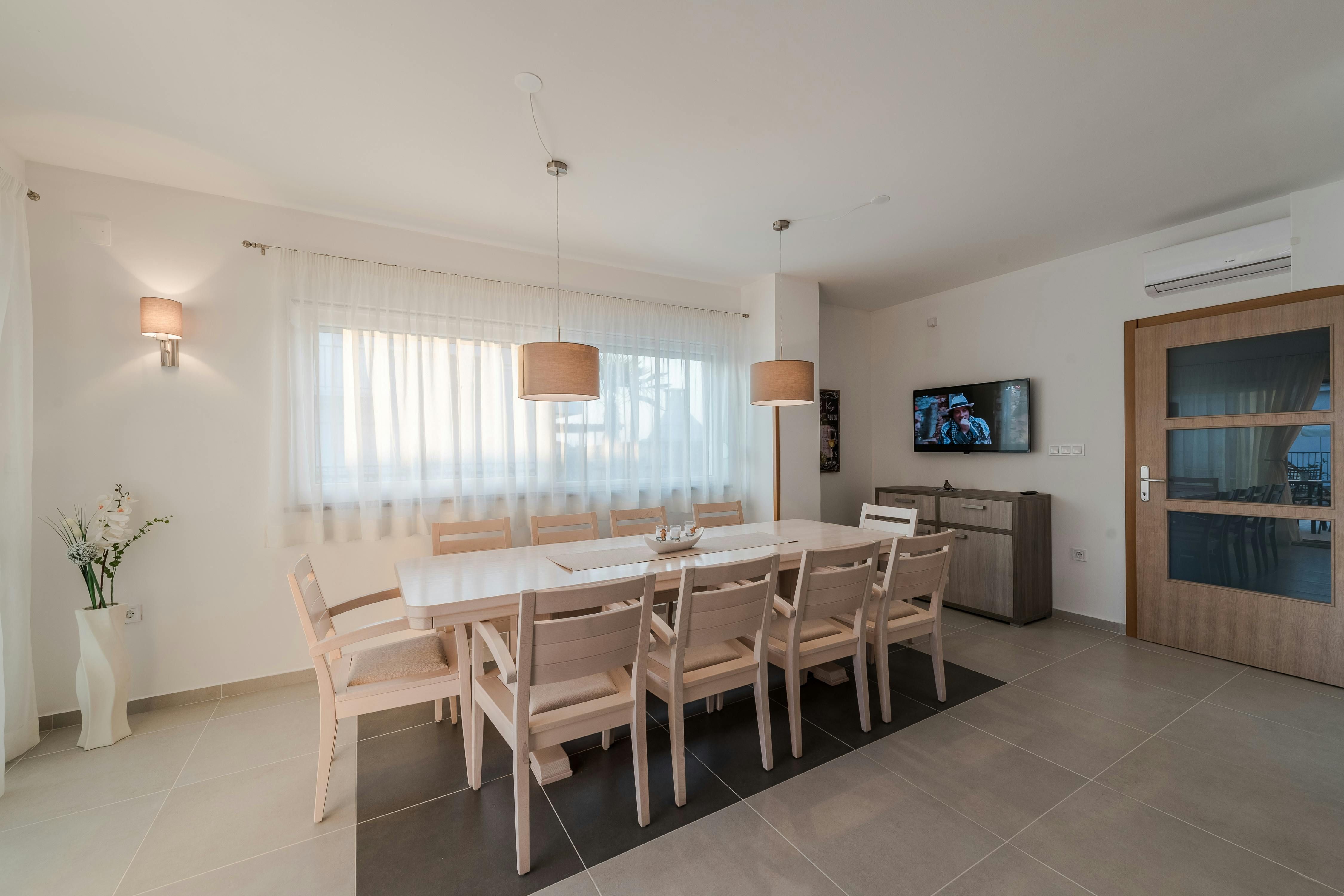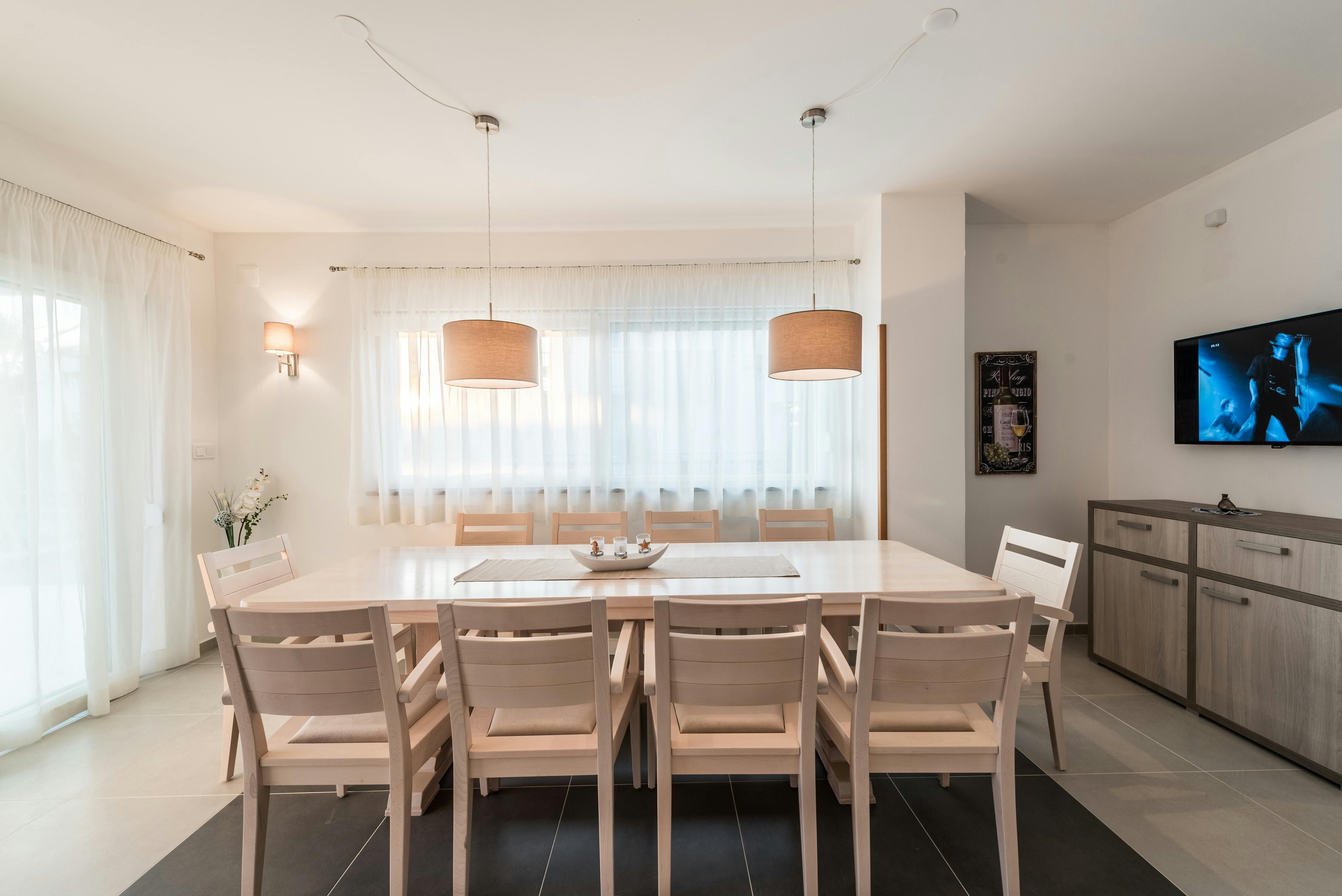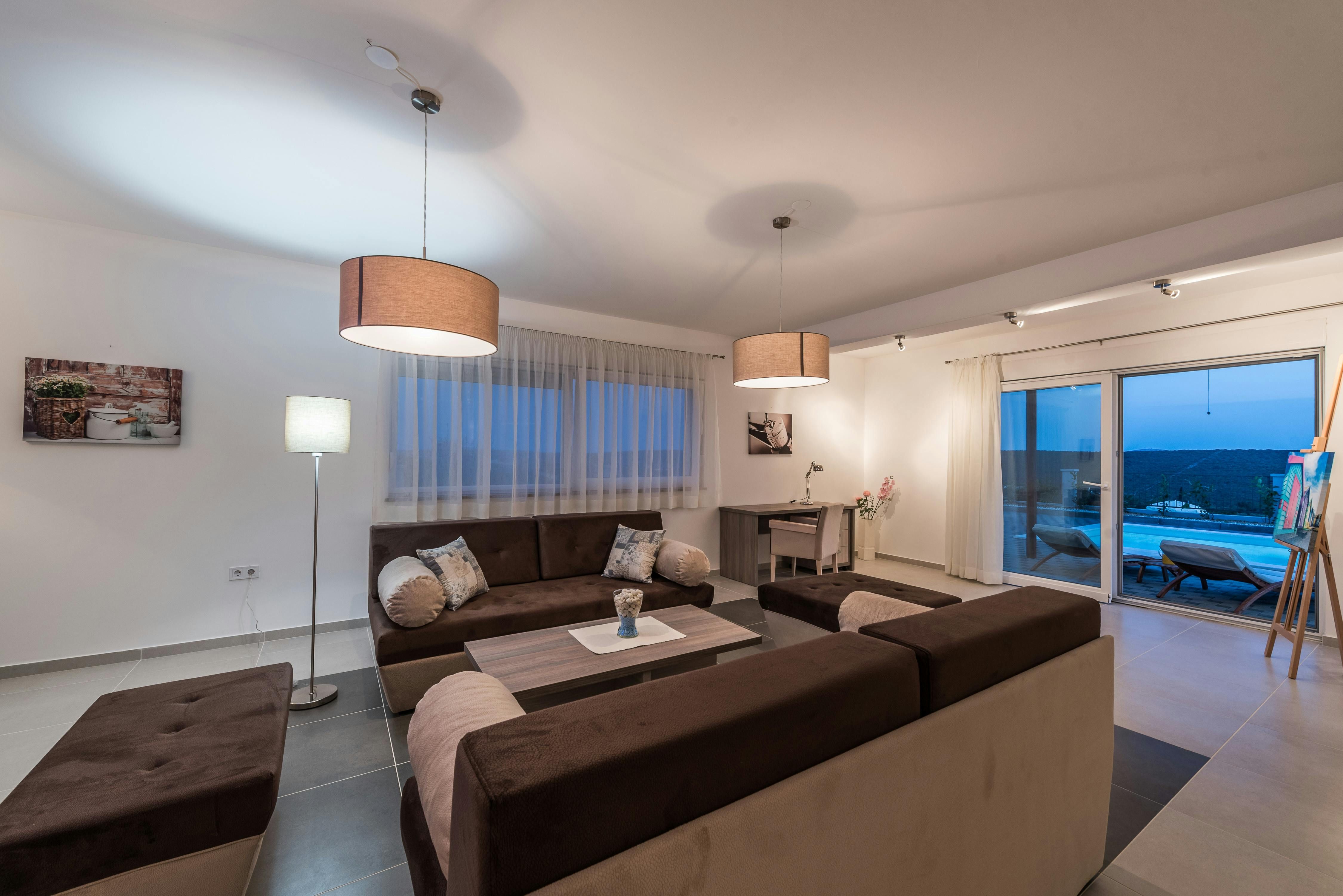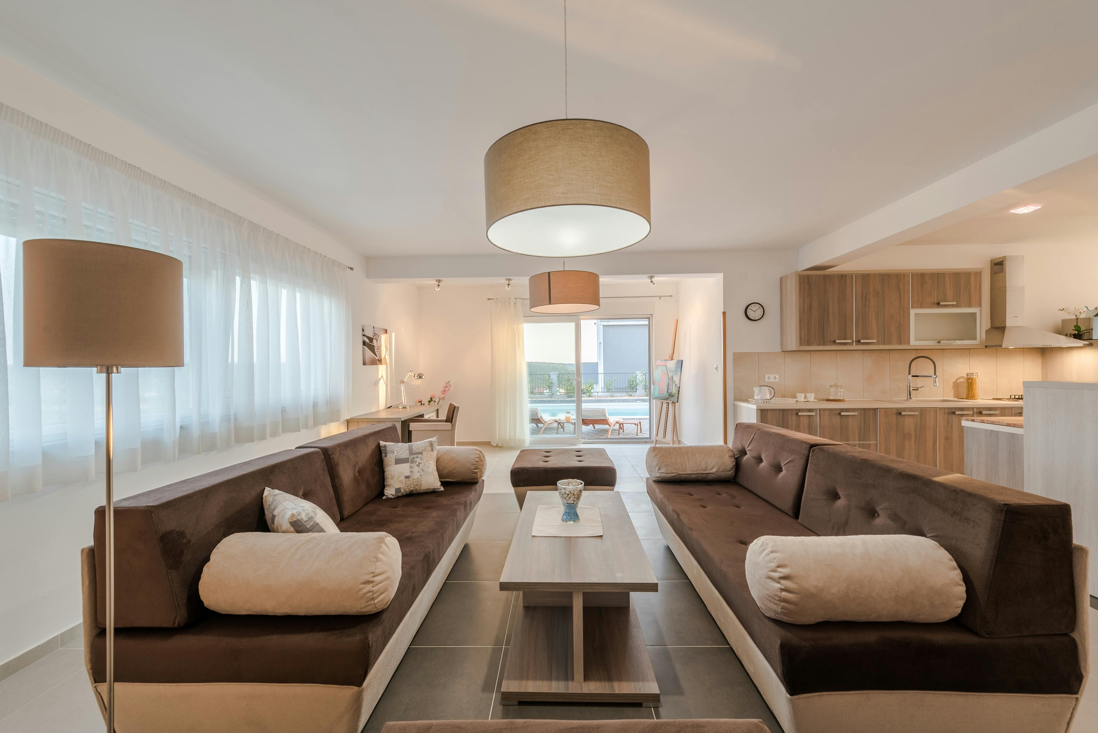 This home is a stunning family villa located in the Villen Resort near Sukosan, Croatia. The modern architecture and sleek white façade offer an attractive holiday comfort both indoors and outdoors. The villa boasts a 36m² pool, several seating areas with comfortable furniture, and a barbecue area perfect for relaxing and soaking up the views of the surrounding landscape. The open floor plan of the interior cleverly combines living room, dining room, and kitchen with many windows and clever lighting creating a harmonious atmosphere. The fully equipped kitchen with central counter makes self-catering easy for larger travel groups. The four double rooms each have their own bathroom and direct access to the balcony or pool terrace. Nearby Sukosan offers beautiful stretches of sea, the largest marina in the Adriatic - Zlatna Luka, ideal beaches for families with children, local restaurants serving delicious cuisine, and "Fun Park Mirnovec" offering adrenaline experiences. With all three national parks (Kornati, Krka, Paklenica) within a radius of 30 km, boredom has no chance.