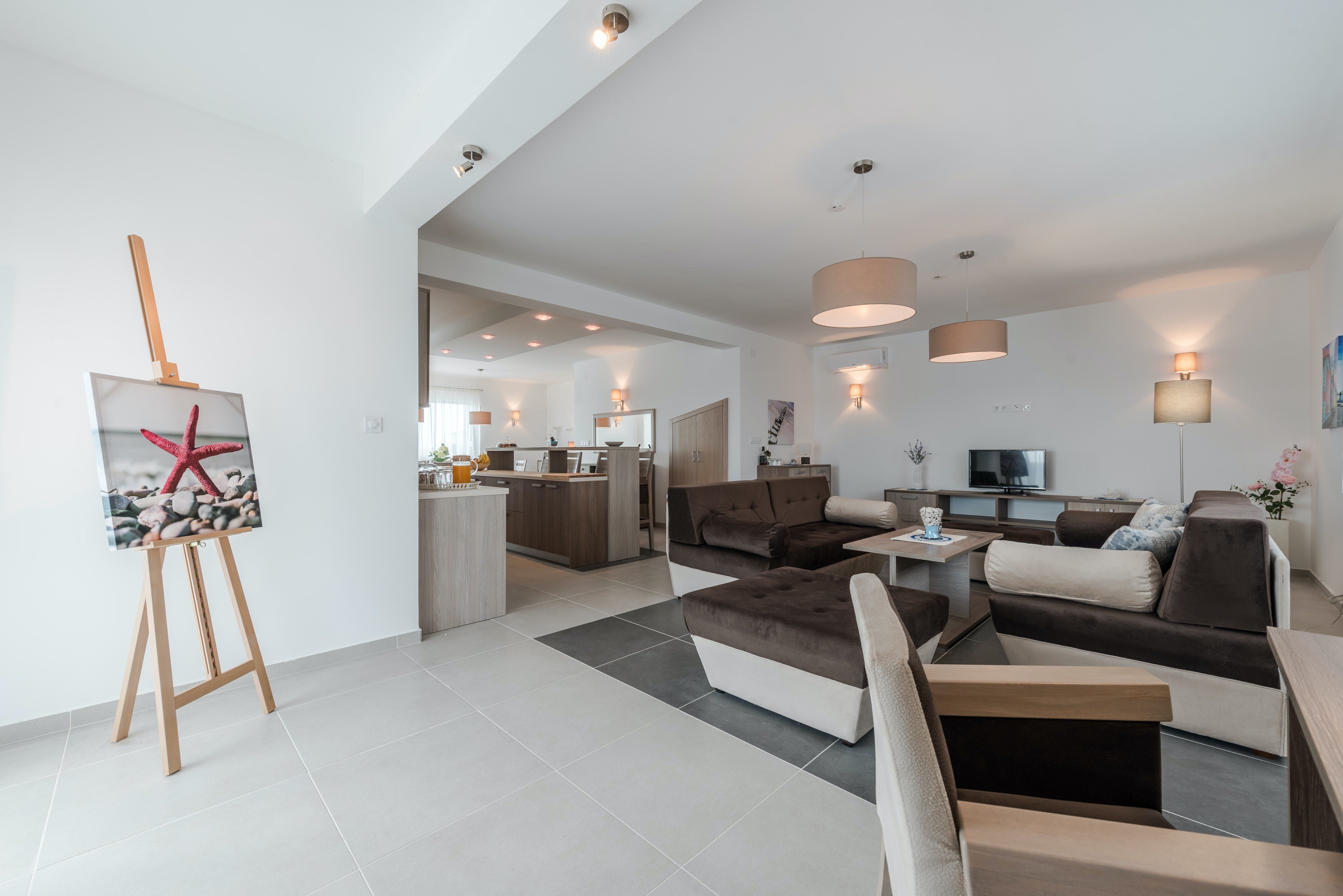 Located in a beautiful resort near Sukosan, this modern family villa offers a stunning view of the landscape and the sea. The chic building has a living space of 190 m² with several seating areas and an approximately 30 m² pool that provides cooling at any time of day. The interior presents itself stylishly with modern aesthetics and creates a harmonious atmosphere with many windows and clever lighting. The four double rooms, each with its own bathroom, offer unpretentious comfort to all fellow travellers, one on the ground floor and others on the top. Nearby Sukosan has a beautiful beach ideal for families with children and offers a wide range of culinary delights in local restaurants and konobas. Zadar, about 16 km away, is perfect for sightseeing and culture, beach and leisure. All three national parks (Kornati, Krka, Paklenica) are within a radius of 30 km.