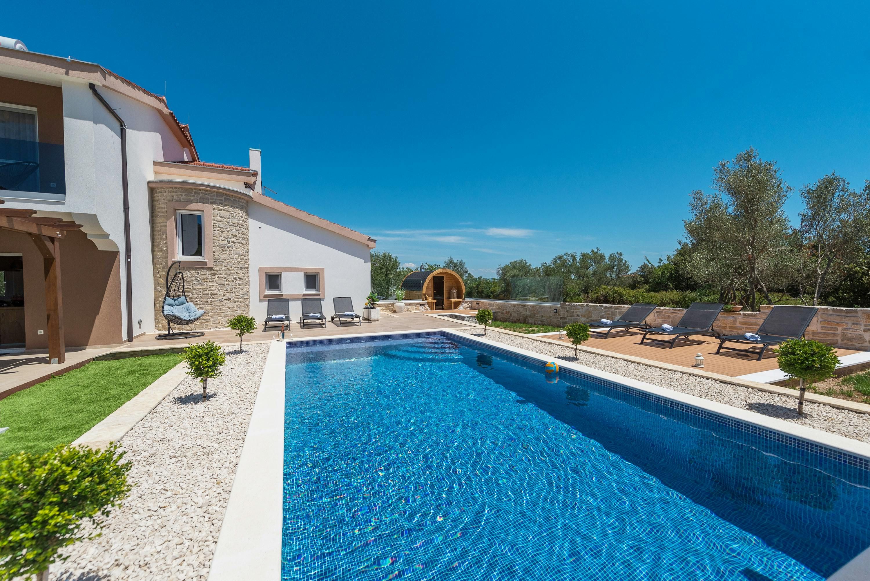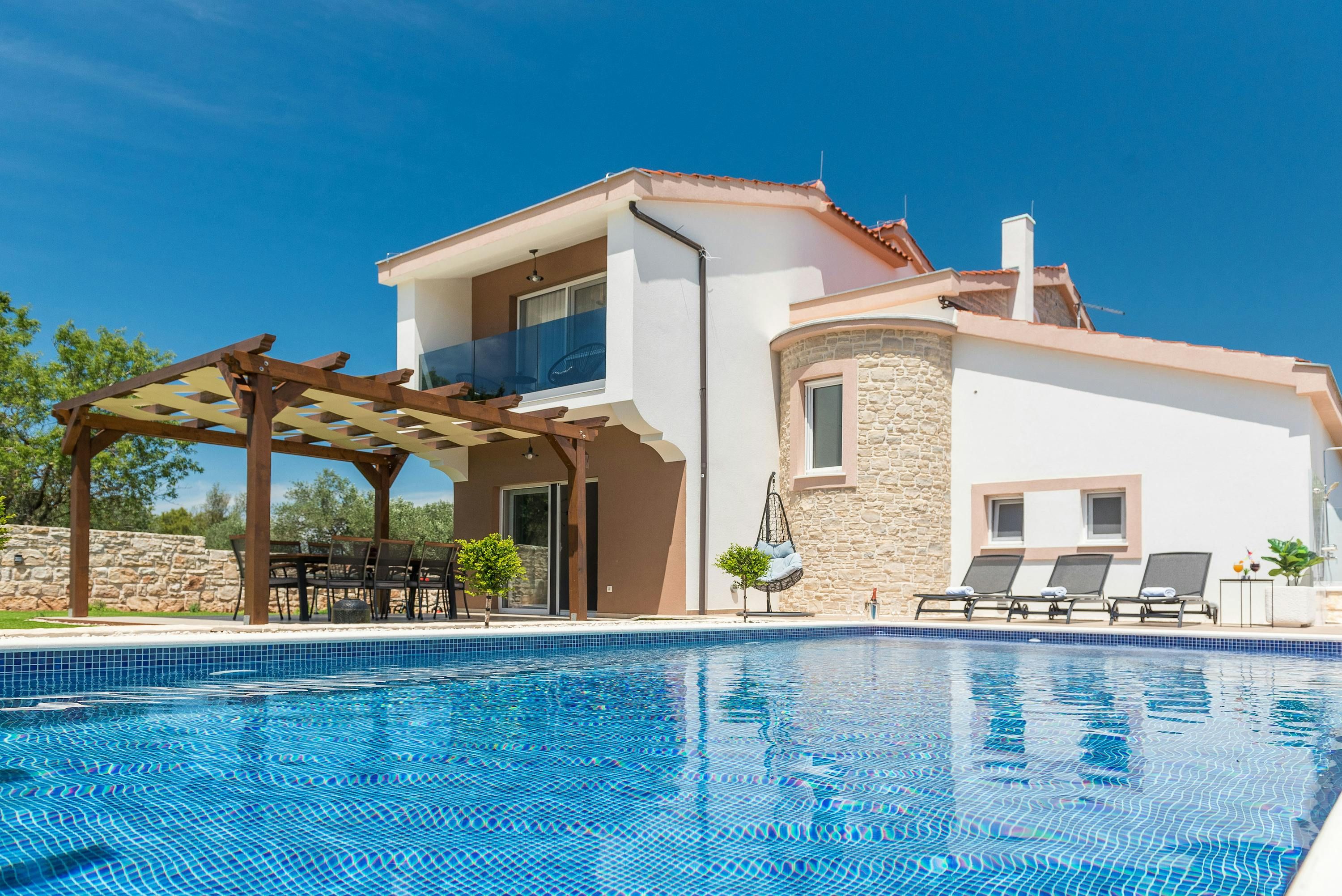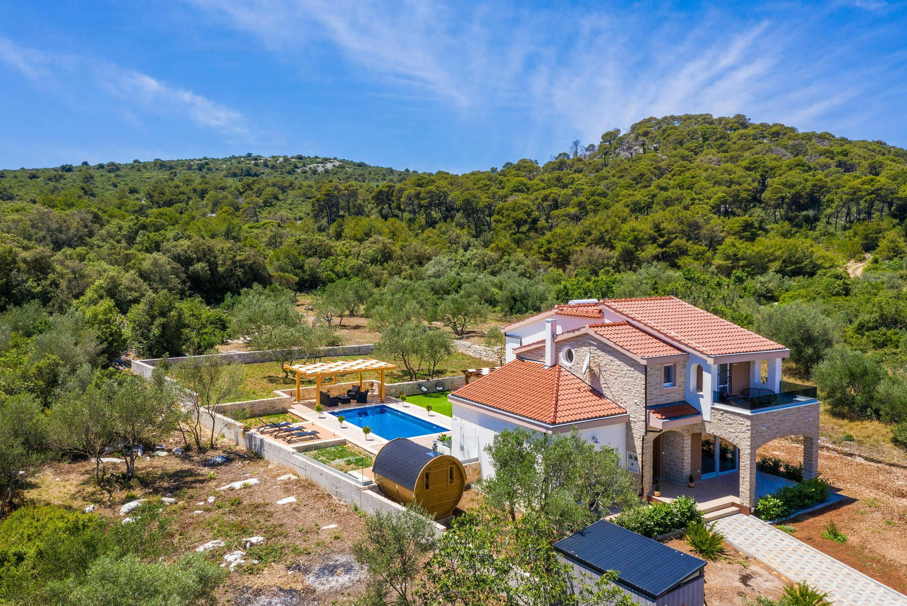 This beautiful finca sits by the sea on the North Dalmatia coast. You’ll be able to easily explore the nearby islands of Tkon and Ugljan by ferry, and will find Kornati National Park close by. Closer to home, Pasman beach is only 400 metres away – the toughest choice you’ll have to make each day is whether to swim in the sea or the private pool. The garden is idyllic, with plenty of shade, a spot for alfresco dining, and a sauna – stress melts away here. The villa is modern and oh-so stylish, with everything you’ll need for a relaxing break.