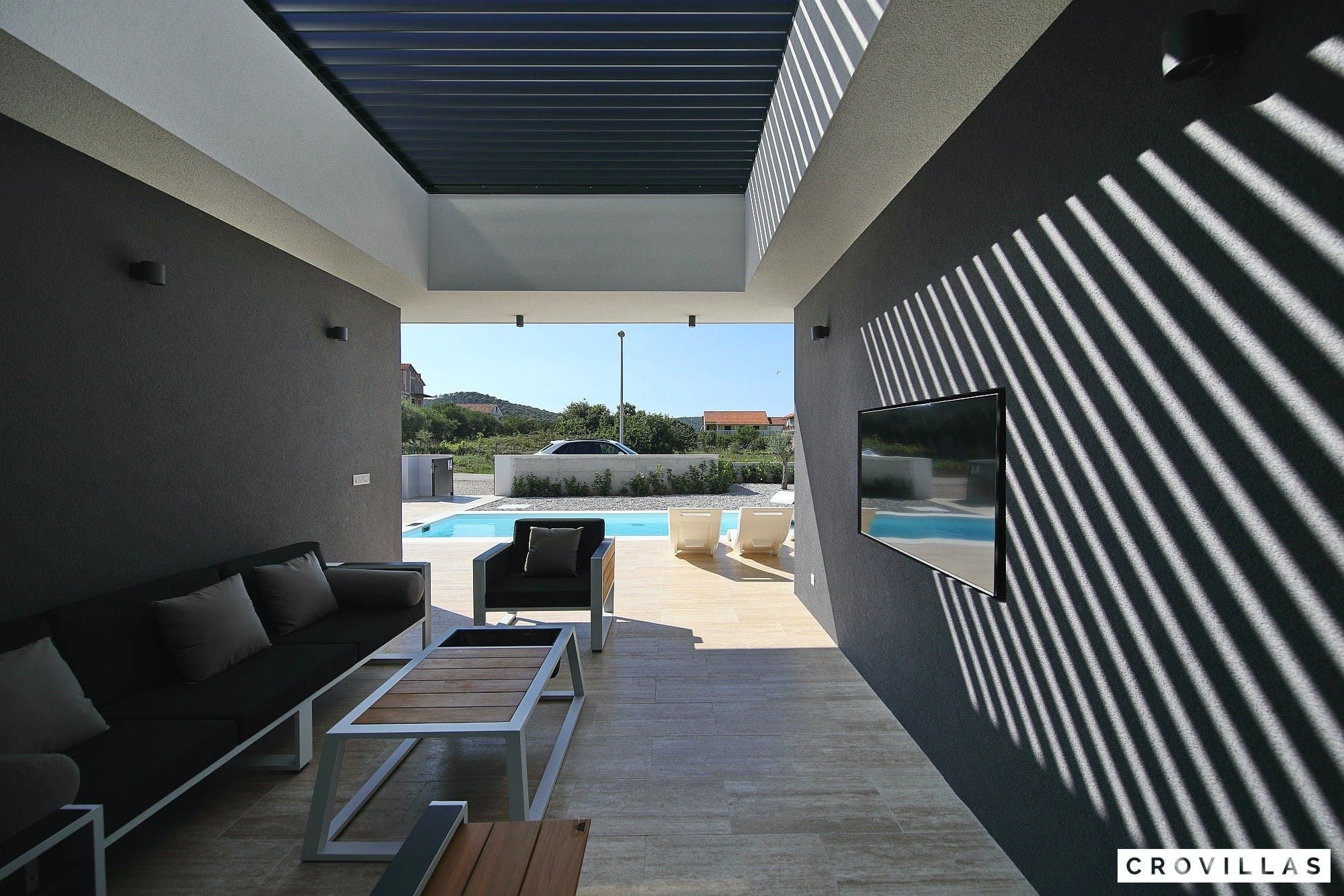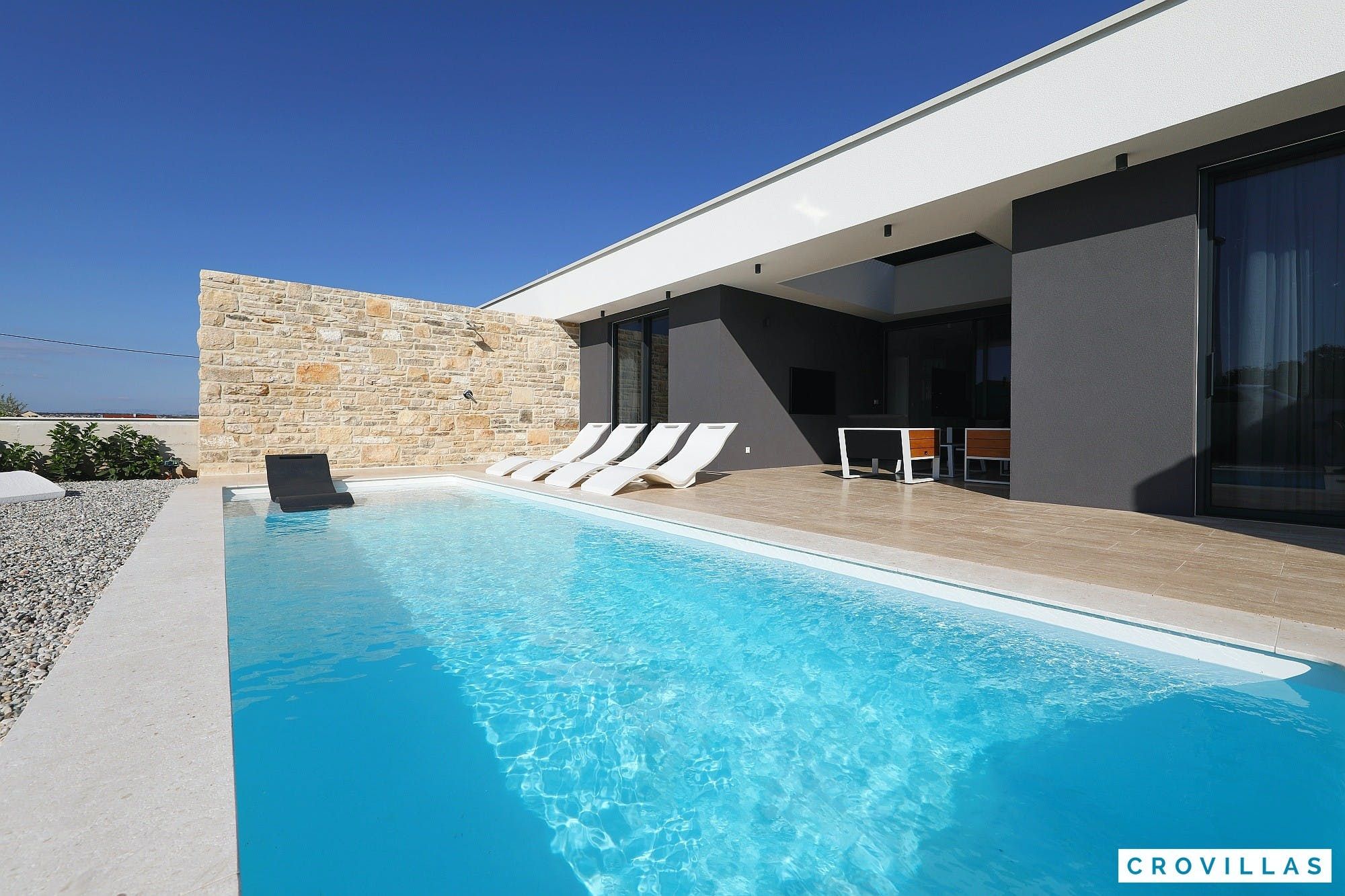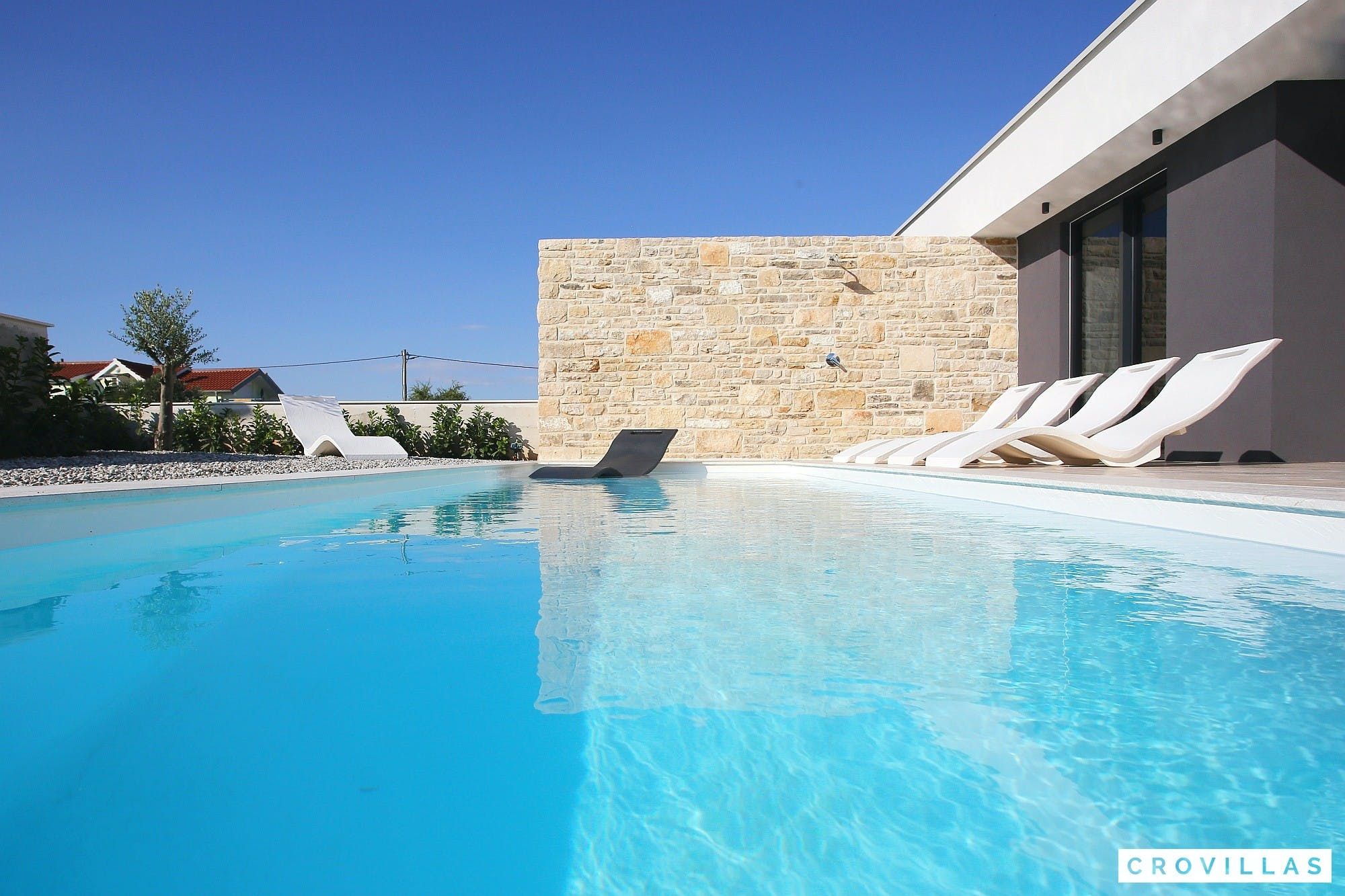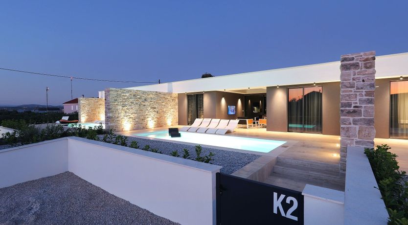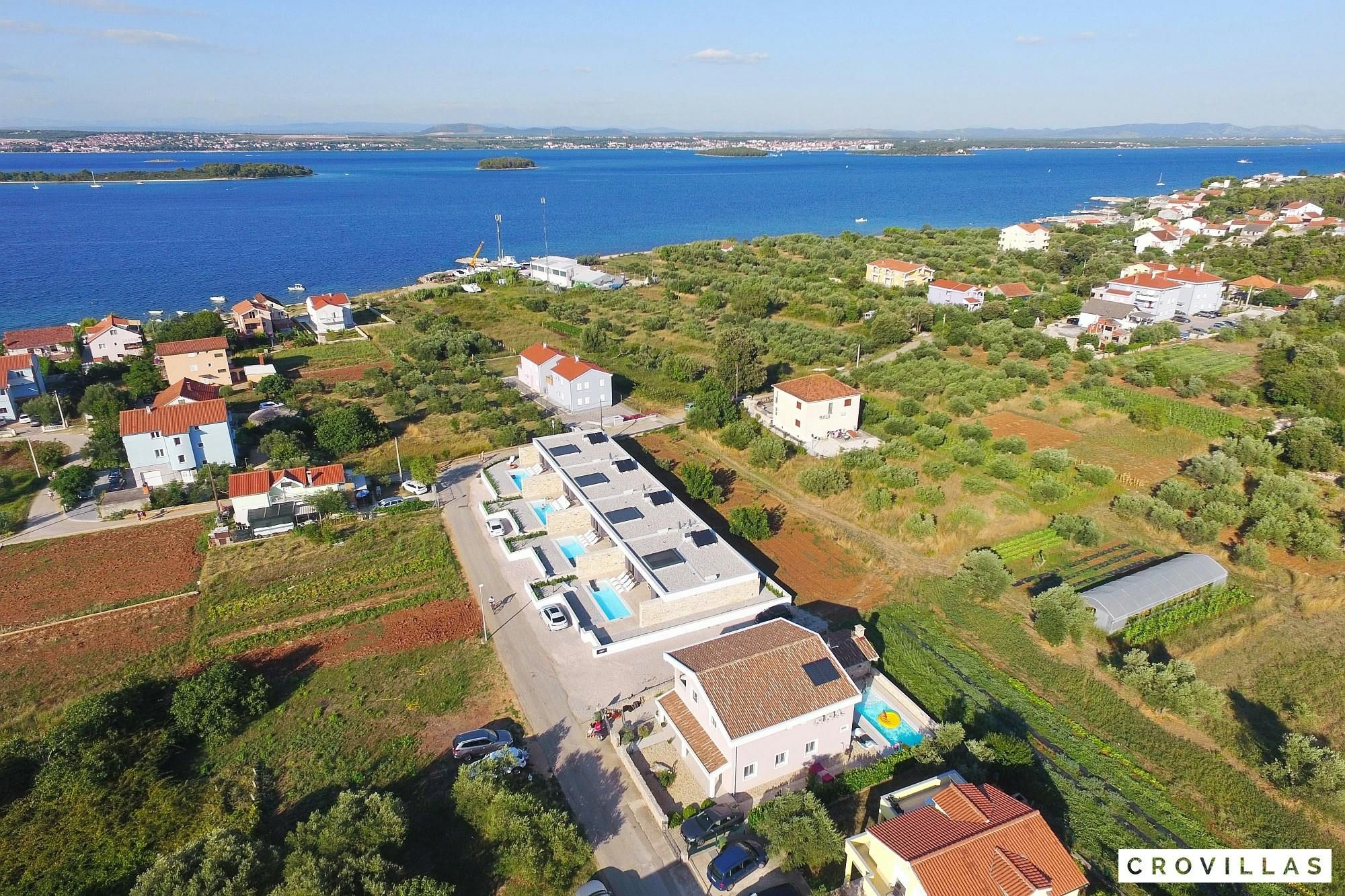 Experience a luxurious holiday in the newly built villa, located on the beautiful island of Pasman. The modern low-rise building is just 200m away from the beach, complete with a bar and bistro. The outdoor area offers a stylish seating area and a 7.60m pool for refreshing swims and lounging on the shallow platform. The roofed terrace features an outdoor living room with comfortable lounge furniture and a TV recessed into the wall for entertainment. The 90 sqm interior boasts a modern design with stylish furnishings, white, grey, and black harmonies, and a glass front exit to the outdoor living room. The kitchen area is fully equipped for self-catering days. Three bedrooms with double box-spring beds offer majestic rest periods, two of which share a bathroom while one has an en suite bathroom. Enjoy indoor temperatures all year round with air conditioning and underfloor heating, wireless internet, and satellite connection.