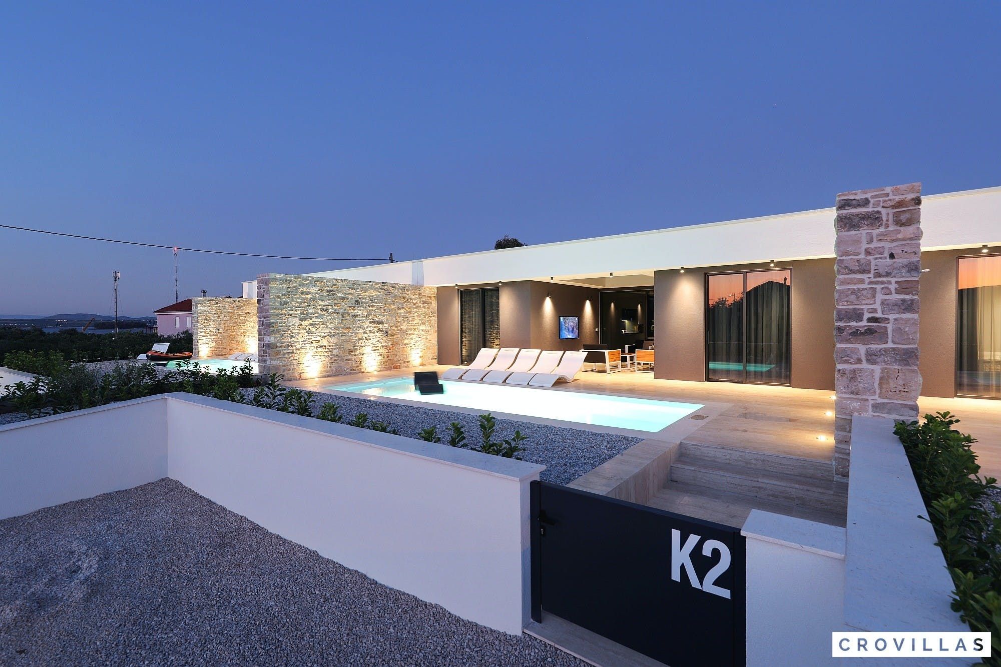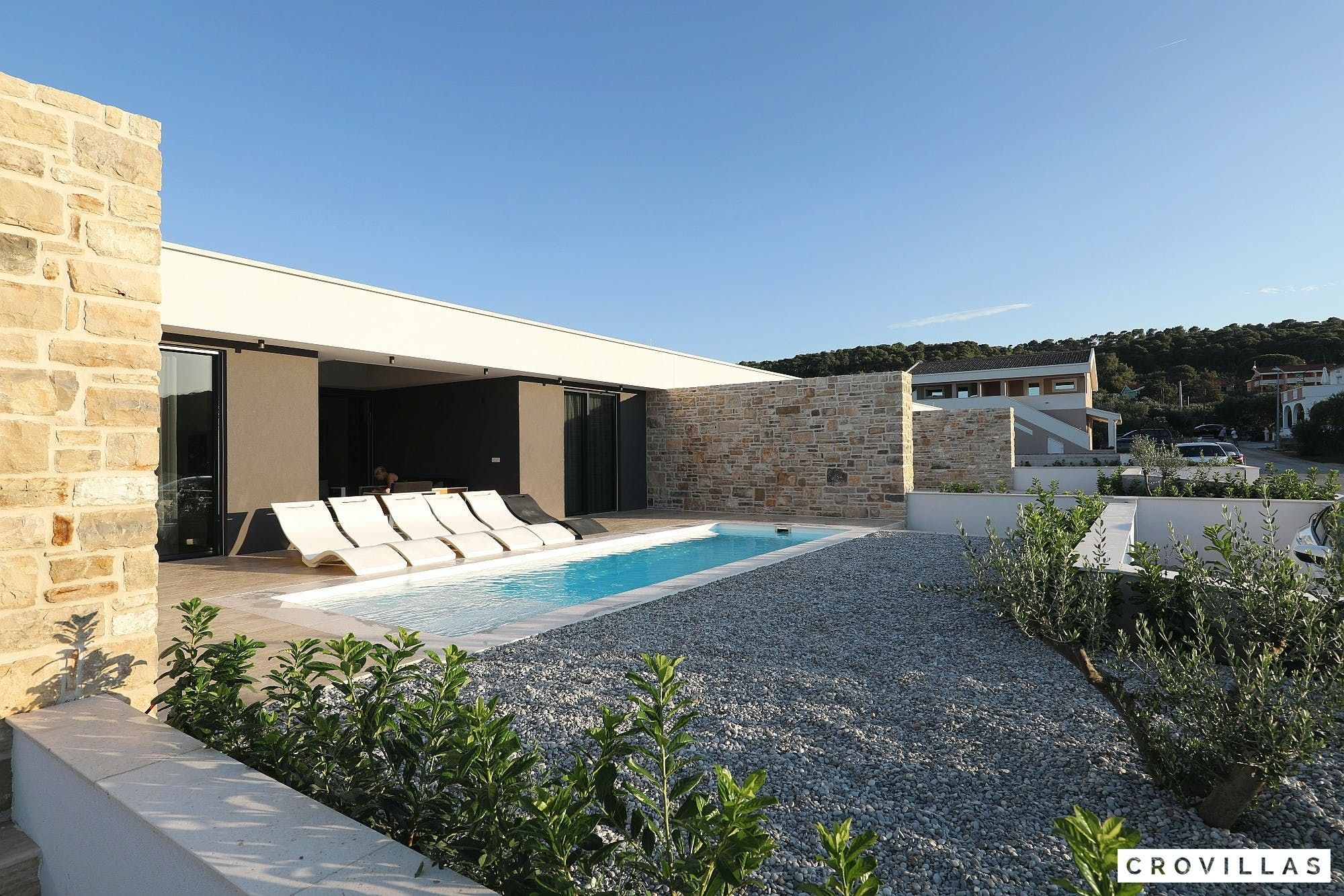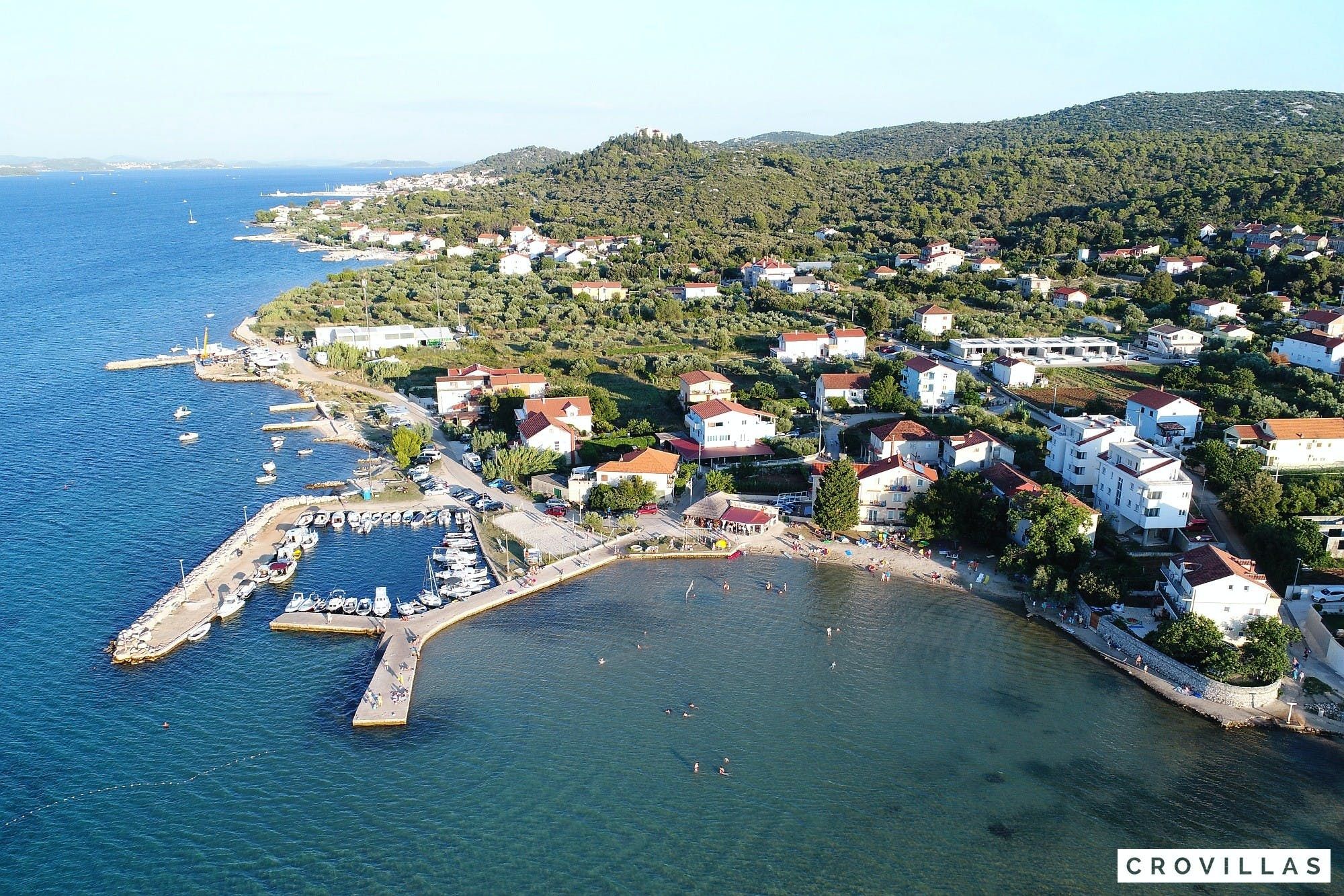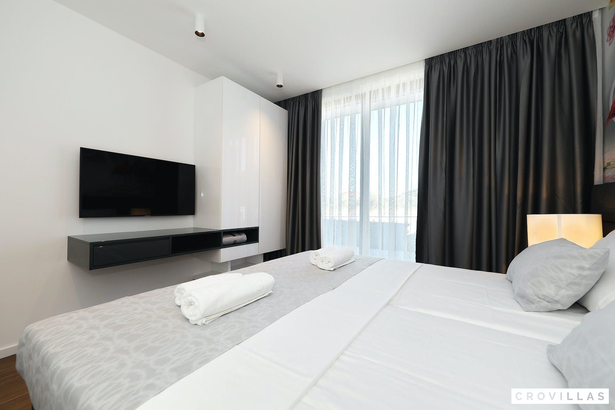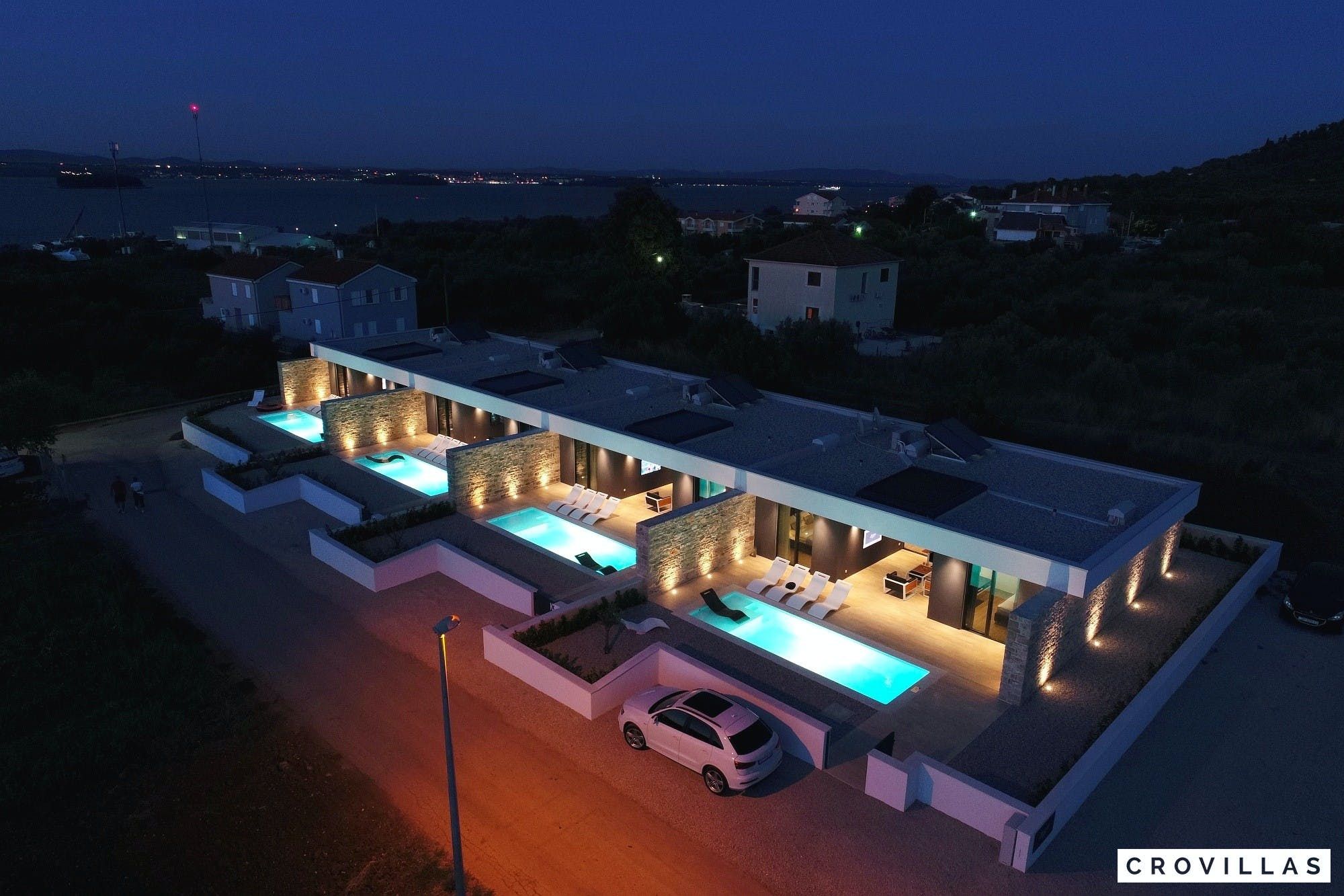 Experience a luxurious holiday in the newly built villa, located on the beautiful island of Pasman. The modern low-rise building is just 200m away from the beach, complete with a bar and bistro. The outdoor area offers a stylish seating area and a 7.60m pool for refreshing swims and lounging on the shallow platform. The roofed terrace features an outdoor living room with comfortable lounge furniture and a TV recessed into the wall for entertainment. The 90 sqm interior boasts a modern design with stylish furnishings, white, grey, and black harmonies, and a glass front exit to the outdoor living room. The kitchen area is fully equipped for self-catering days. Three bedrooms with double box-spring beds offer majestic rest periods, two of which share a bathroom while one has an en suite bathroom. Enjoy indoor temperatures all year round with air conditioning and underfloor heating, wireless internet, and satellite connection.