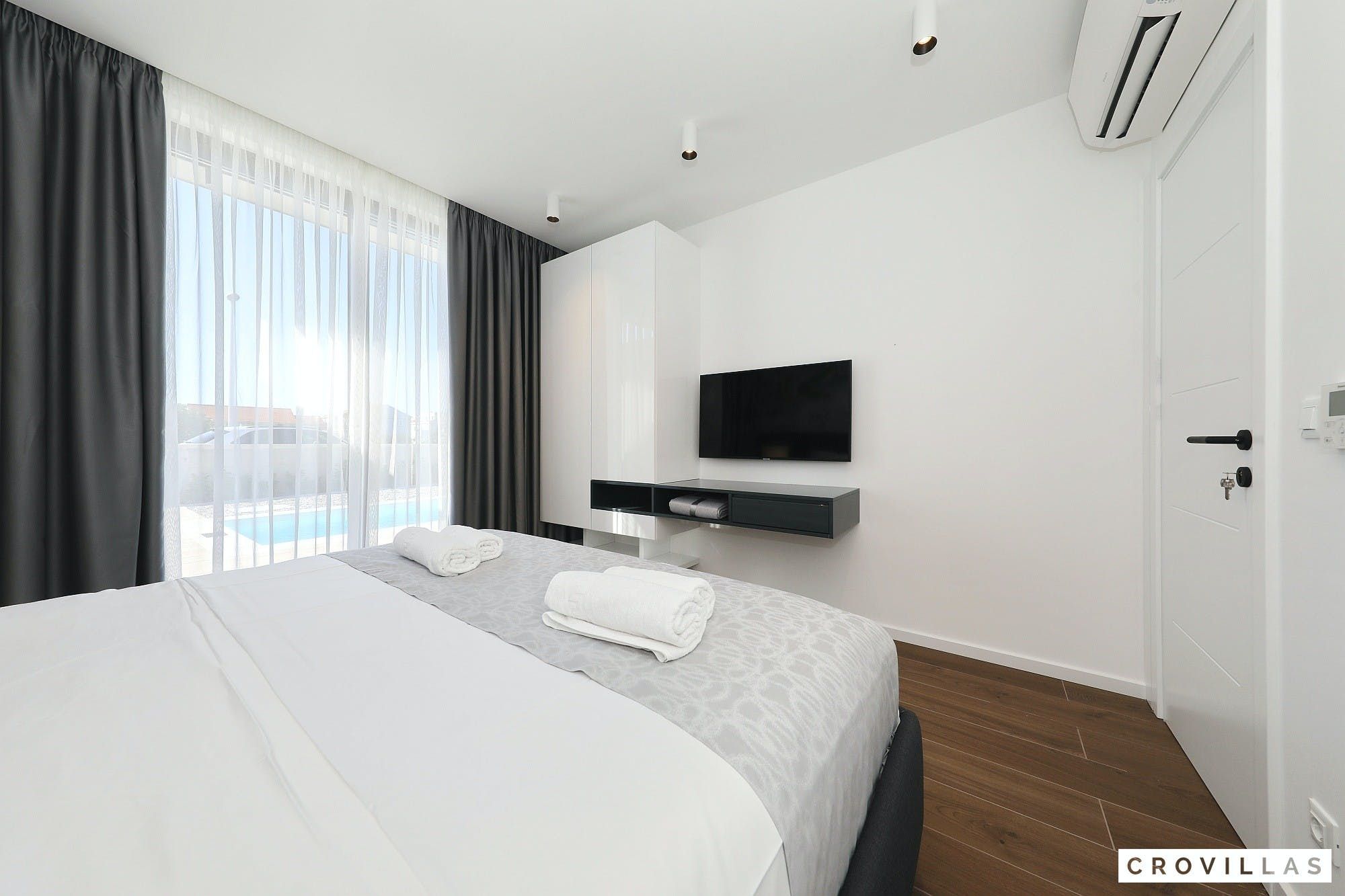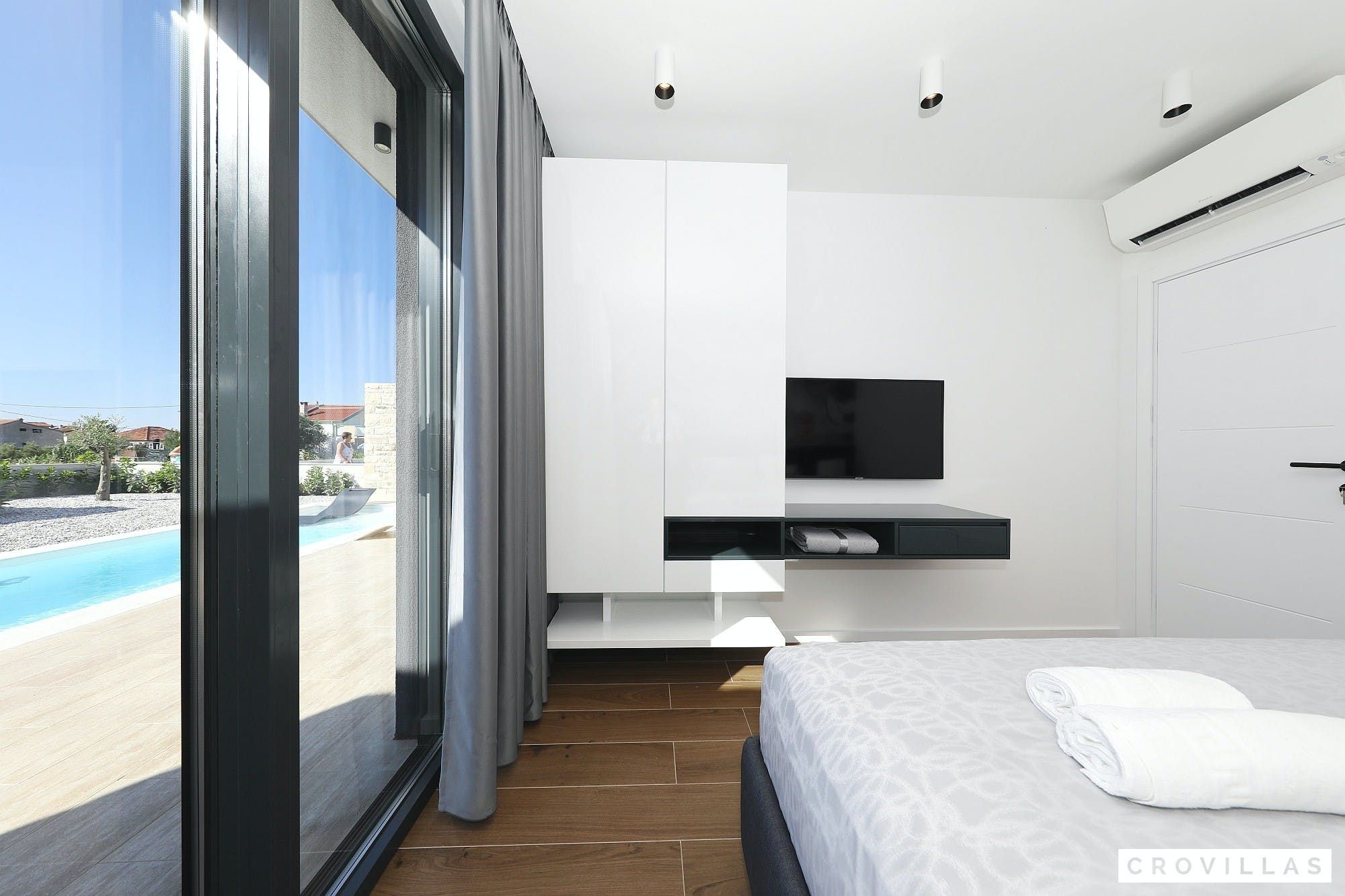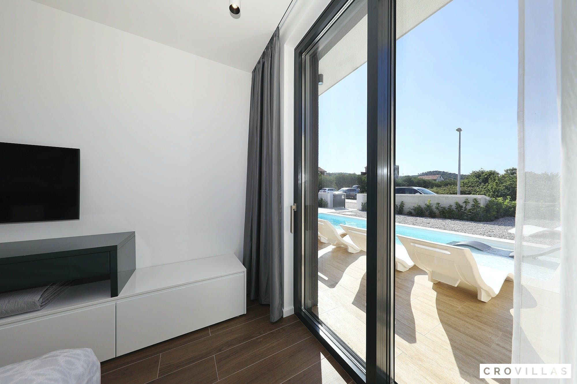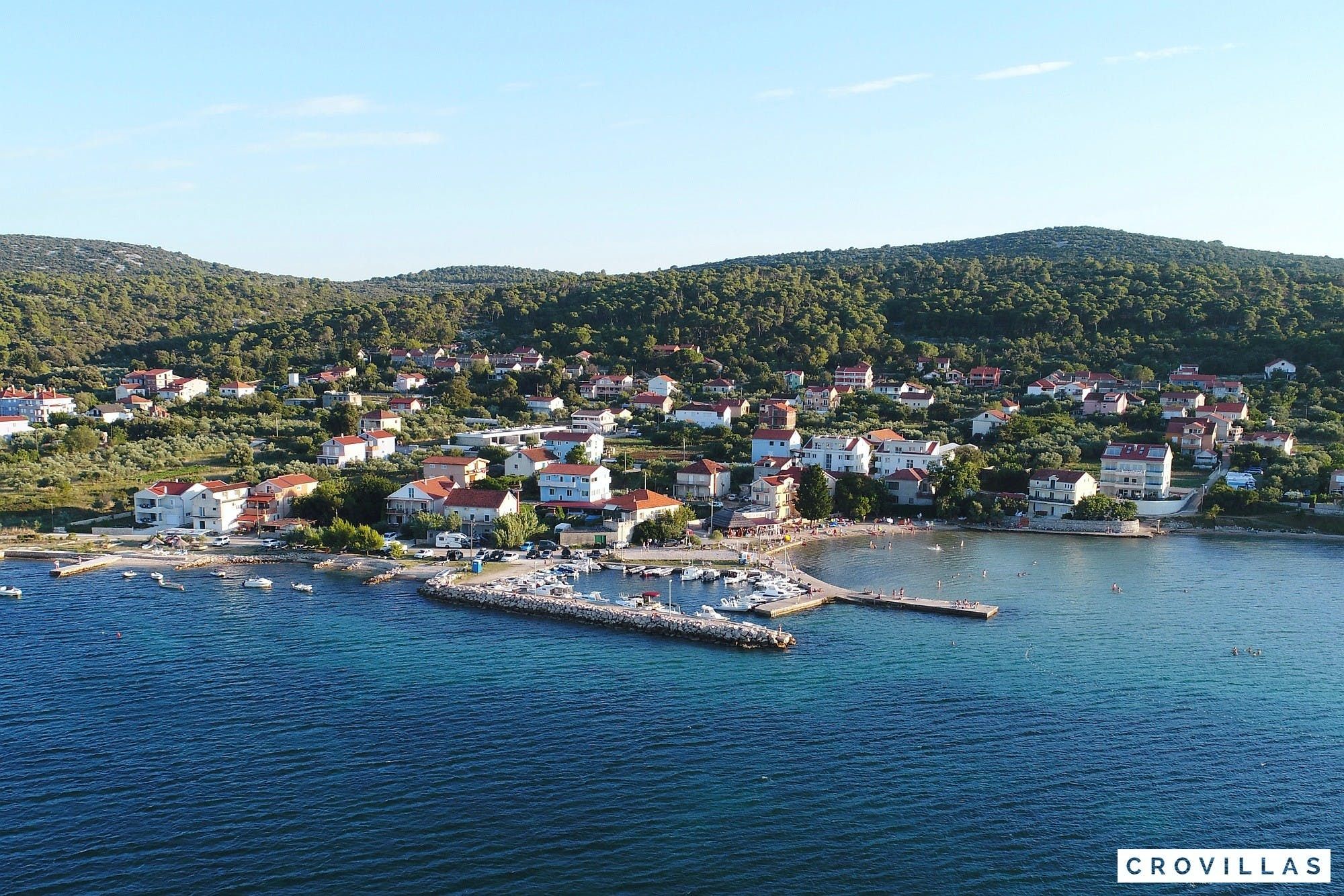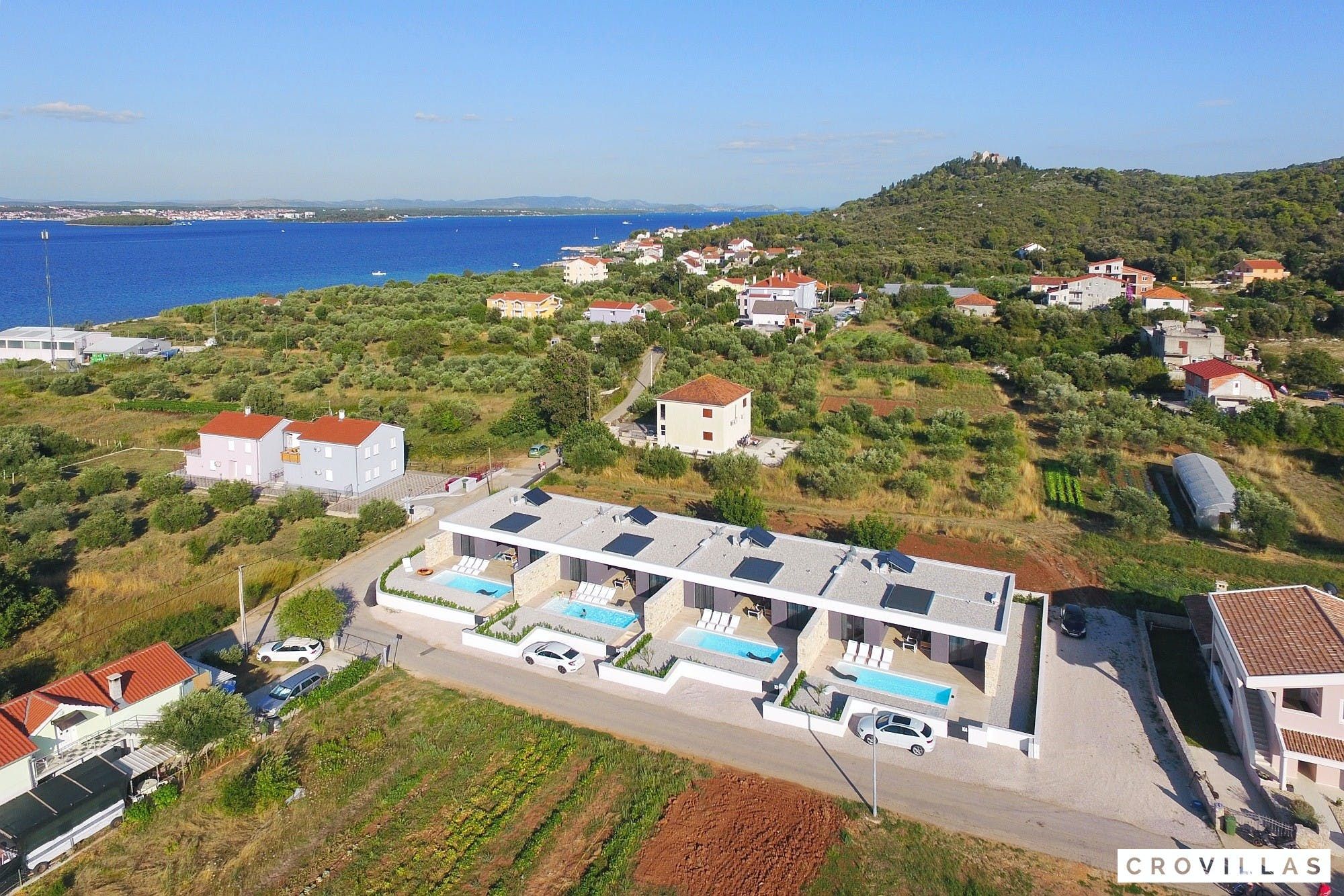 Experience a luxurious holiday in the newly built villa, located on the beautiful island of Pasman. The modern low-rise building is just 200m away from the beach, complete with a bar and bistro. The outdoor area offers a stylish seating area and a 7.60m pool for refreshing swims and lounging on the shallow platform. The roofed terrace features an outdoor living room with comfortable lounge furniture and a TV recessed into the wall for entertainment. The 90 sqm interior boasts a modern design with stylish furnishings, white, grey, and black harmonies, and a glass front exit to the outdoor living room. The kitchen area is fully equipped for self-catering days. Three bedrooms with double box-spring beds offer majestic rest periods, two of which share a bathroom while one has an en suite bathroom. Enjoy indoor temperatures all year round with air conditioning and underfloor heating, wireless internet, and satellite connection.