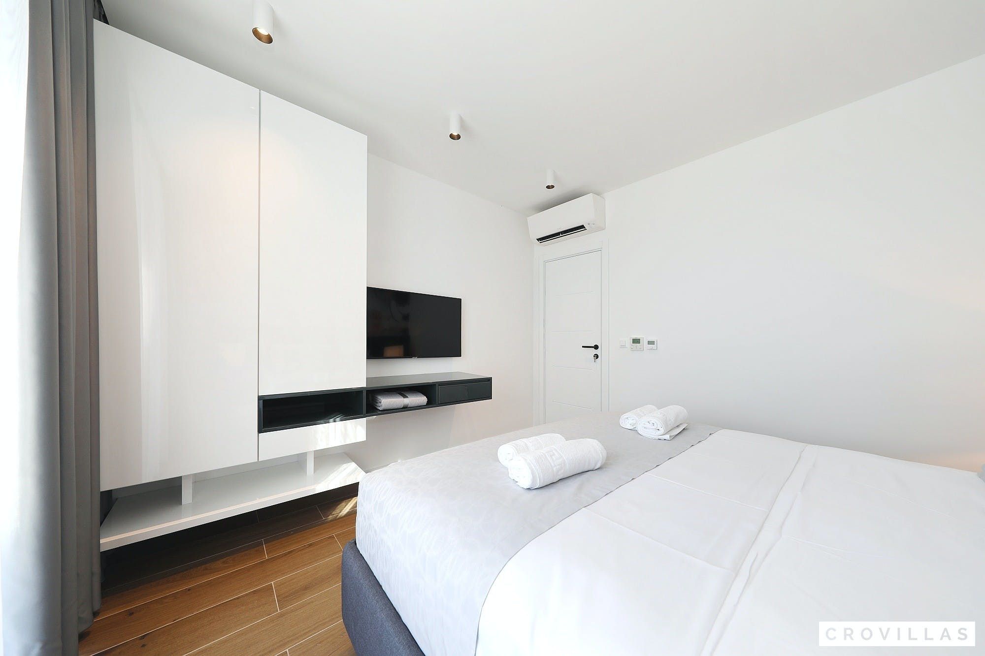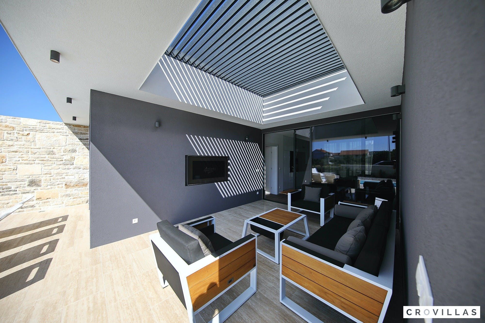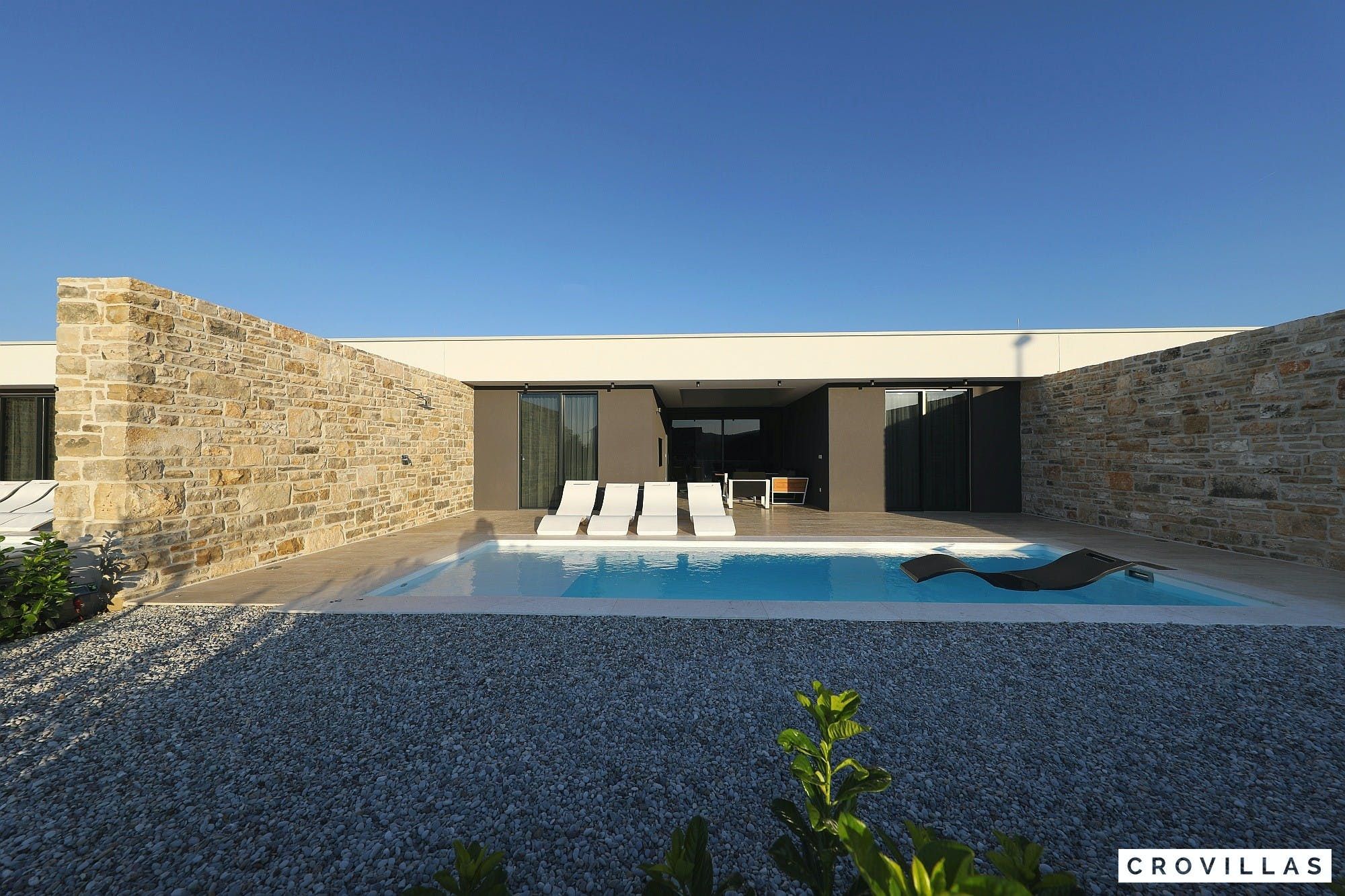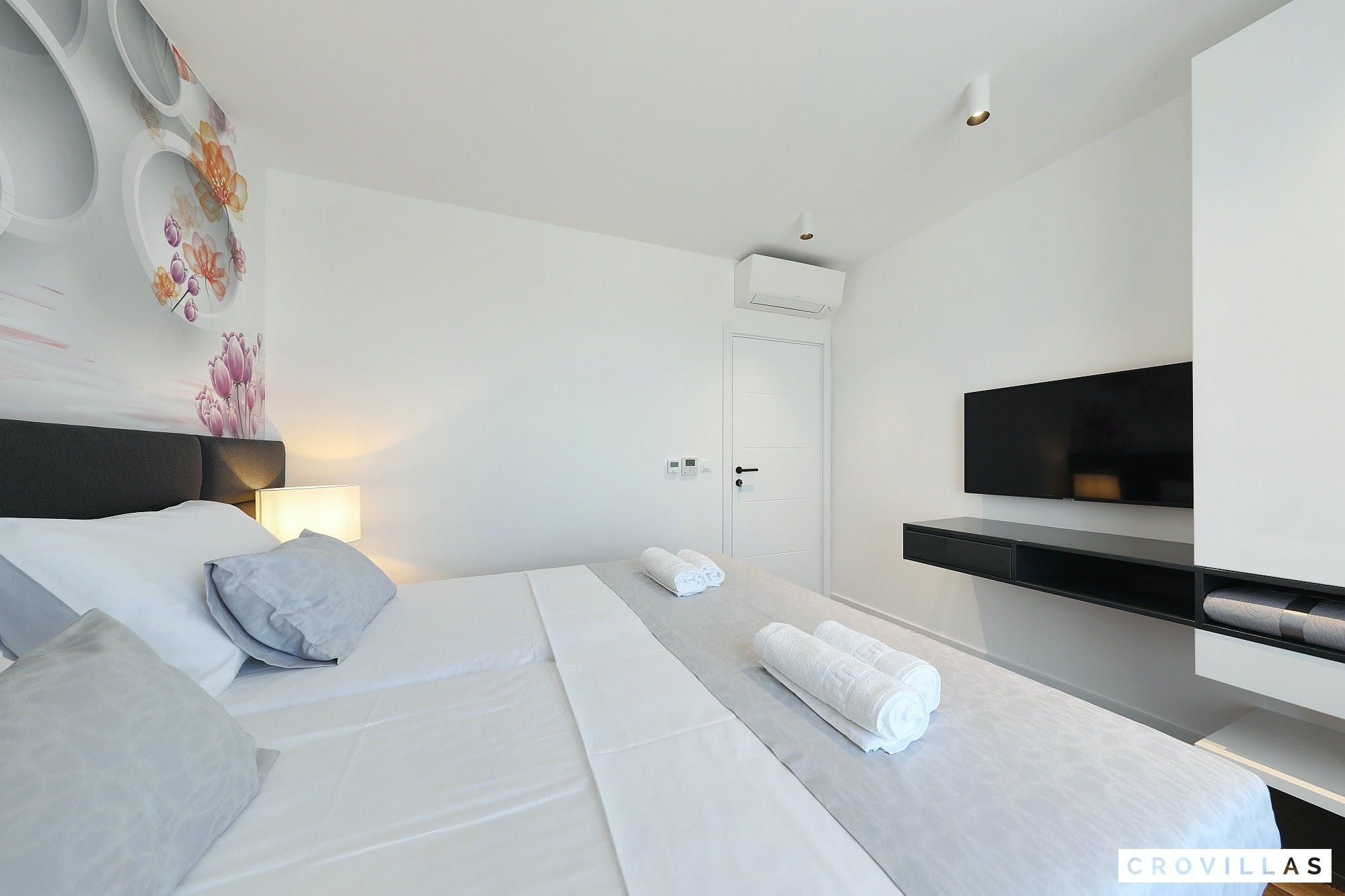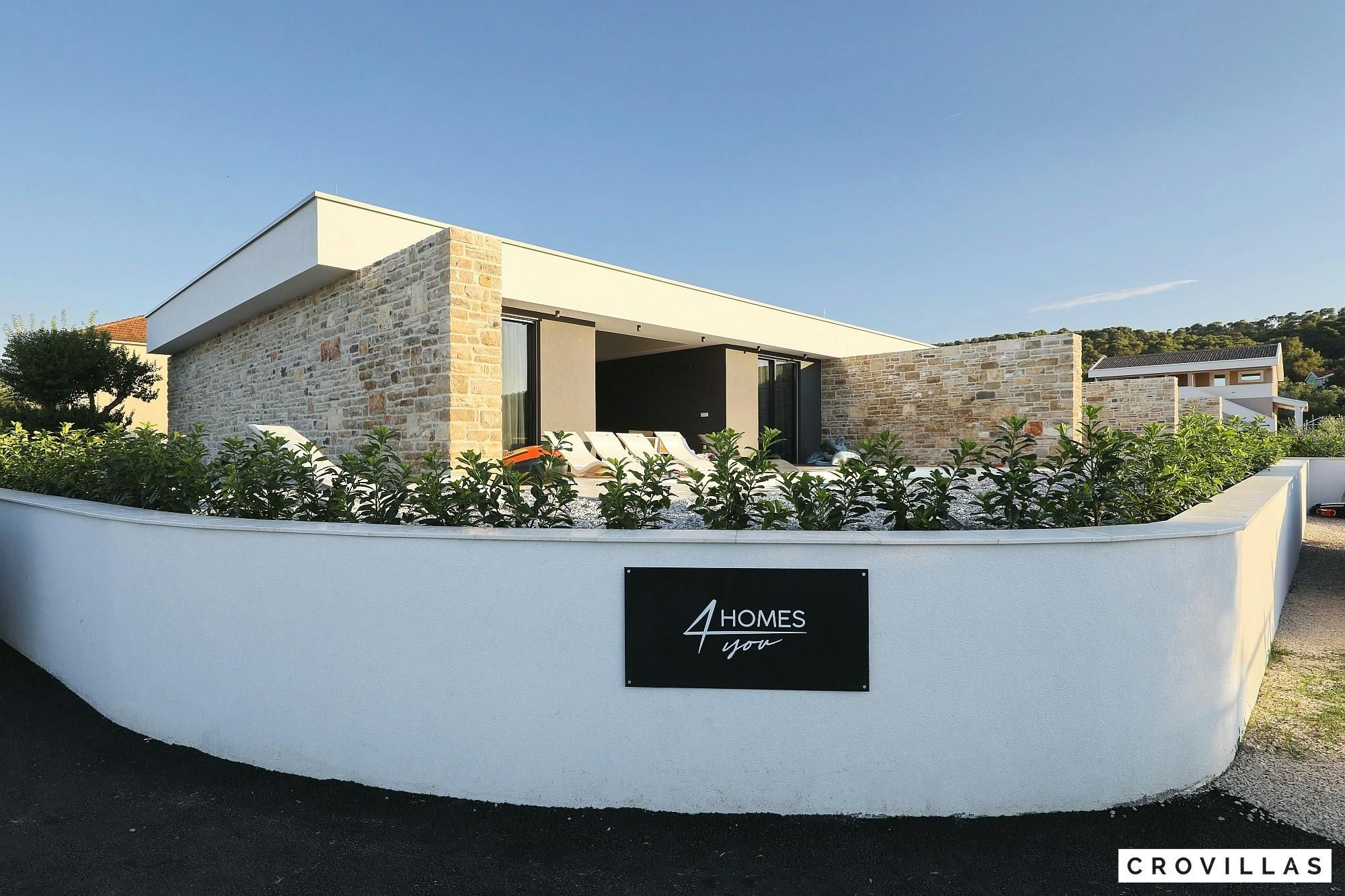 Experience a luxurious holiday in the newly built villa, located on the beautiful island of Pasman. The modern low-rise building is just 200m away from the beach, complete with a bar and bistro. The outdoor area offers a stylish seating area and a 7.60m pool for refreshing swims and lounging on the shallow platform. The roofed terrace features an outdoor living room with comfortable lounge furniture and a TV recessed into the wall for entertainment. The 90 sqm interior boasts a modern design with stylish furnishings, white, grey, and black harmonies, and a glass front exit to the outdoor living room. The kitchen area is fully equipped for self-catering days. Three bedrooms with double box-spring beds offer majestic rest periods, two of which share a bathroom while one has an en suite bathroom. Enjoy indoor temperatures all year round with air conditioning and underfloor heating, wireless internet, and satellite connection.