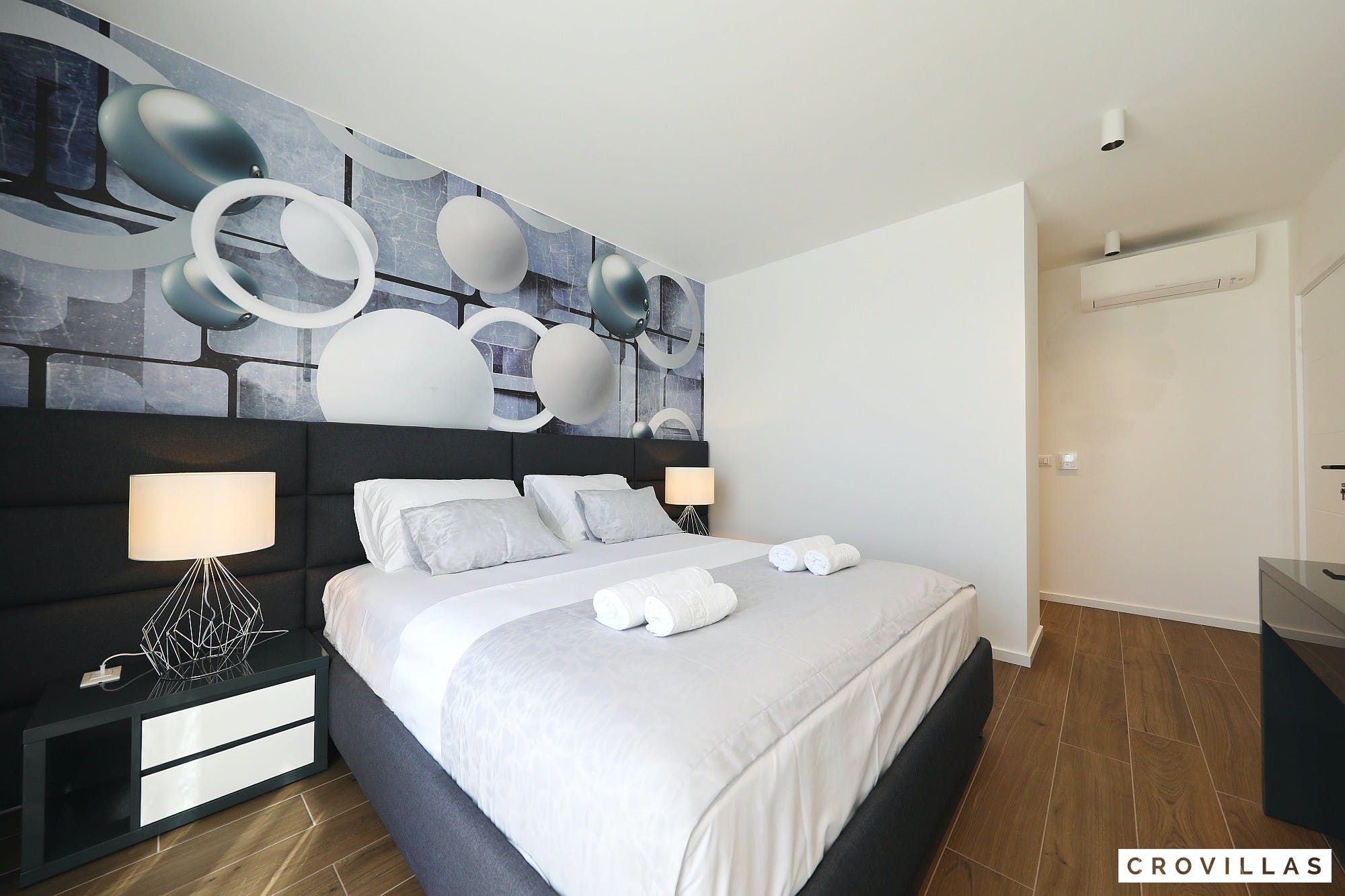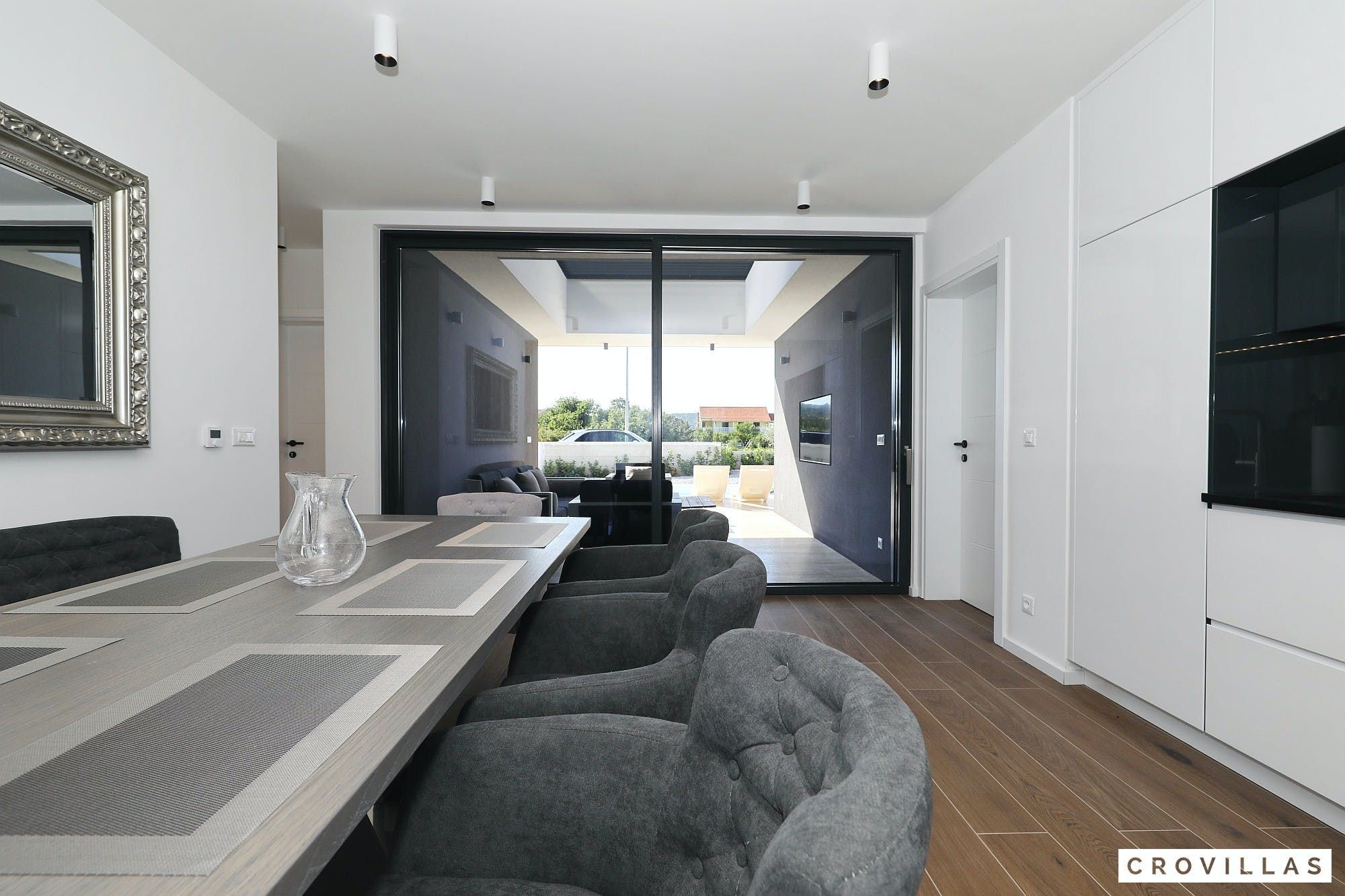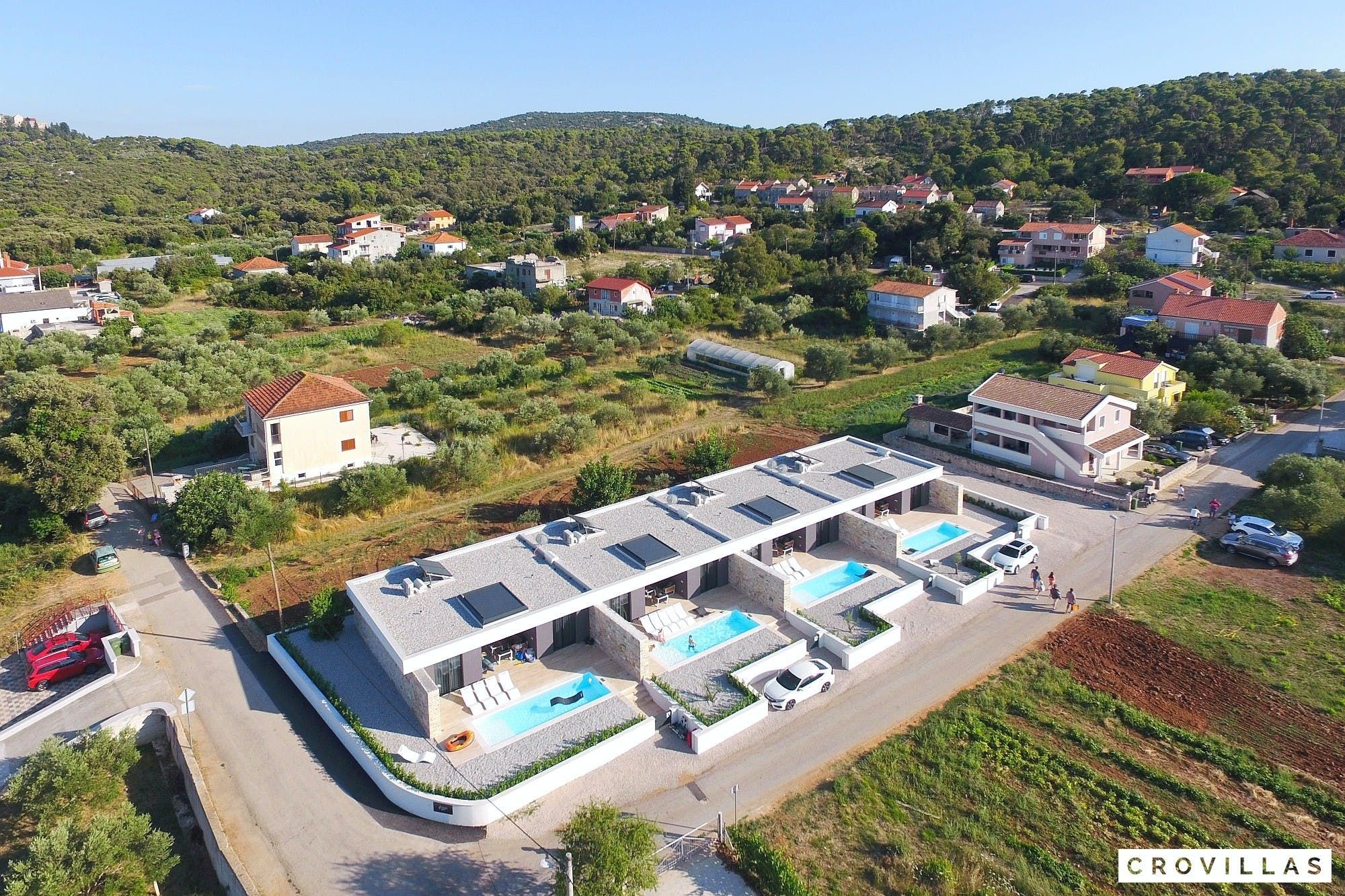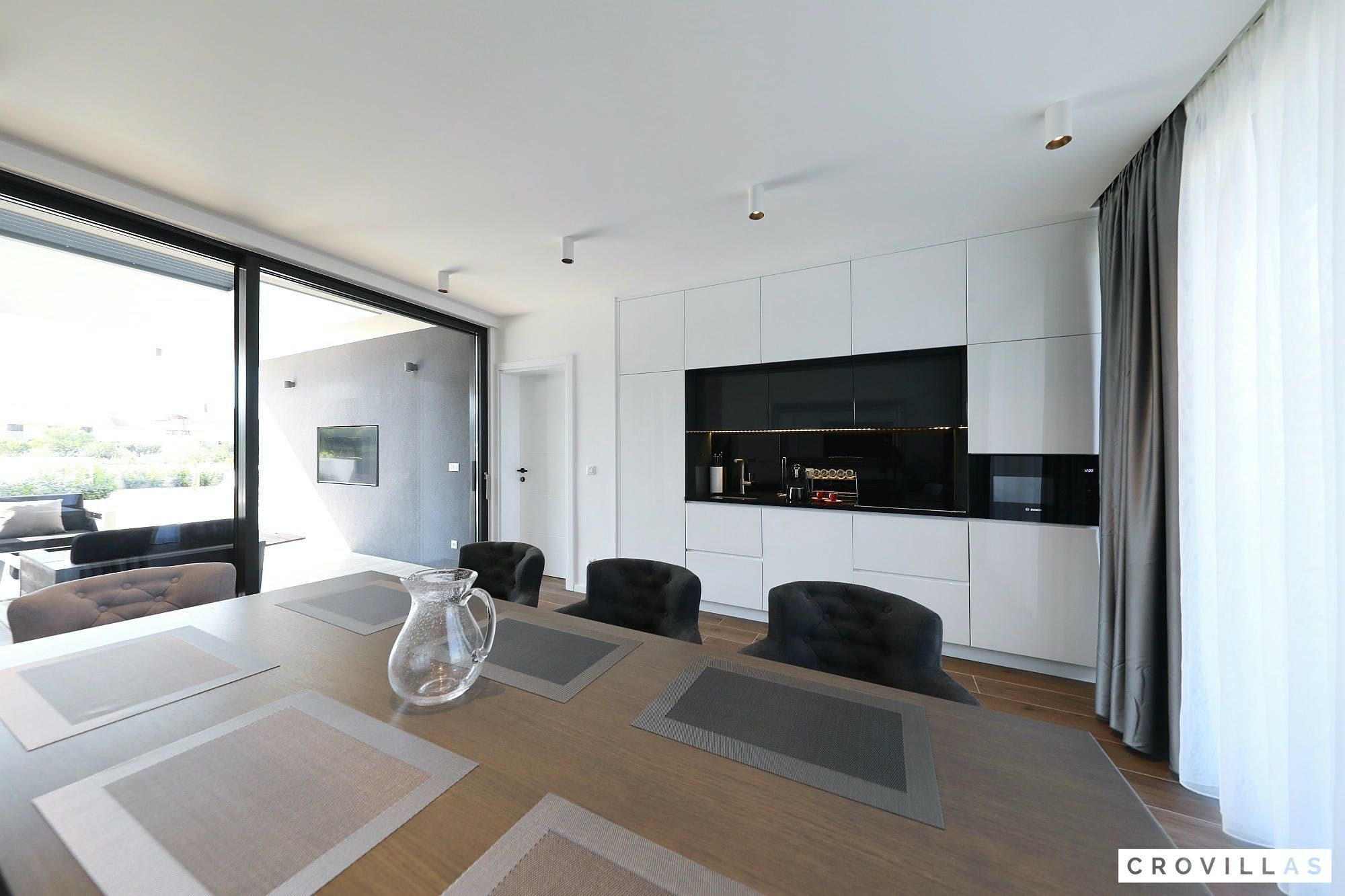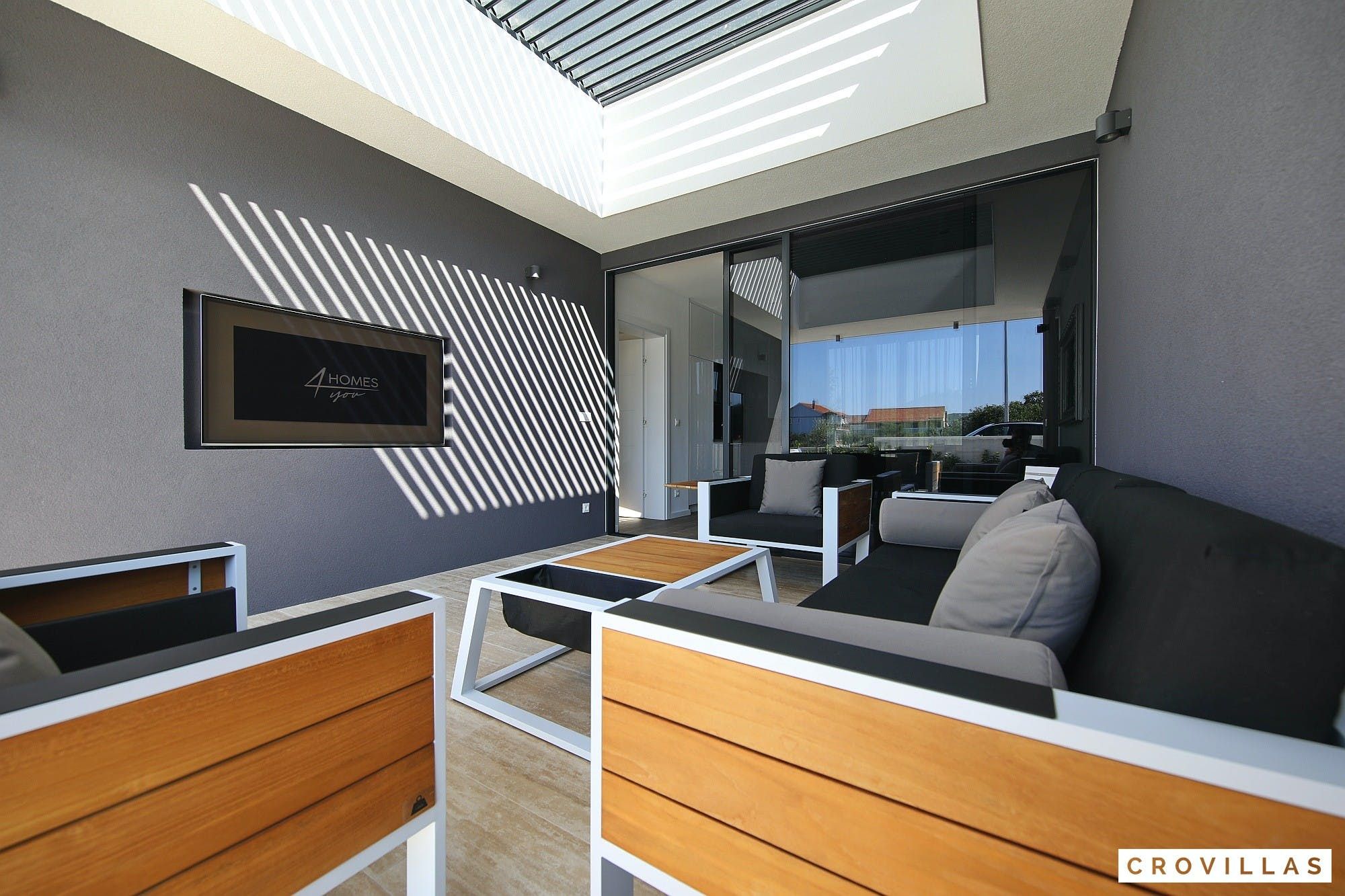 Experience a luxurious holiday in the newly built villa, located on the beautiful island of Pasman. The modern low-rise building is just 200m away from the beach, complete with a bar and bistro. The outdoor area offers a stylish seating area and a 7.60m pool for refreshing swims and lounging on the shallow platform. The roofed terrace features an outdoor living room with comfortable lounge furniture and a TV recessed into the wall for entertainment. The 90 sqm interior boasts a modern design with stylish furnishings, white, grey, and black harmonies, and a glass front exit to the outdoor living room. The kitchen area is fully equipped for self-catering days. Three bedrooms with double box-spring beds offer majestic rest periods, two of which share a bathroom while one has an en suite bathroom. Enjoy indoor temperatures all year round with air conditioning and underfloor heating, wireless internet, and satellite connection.