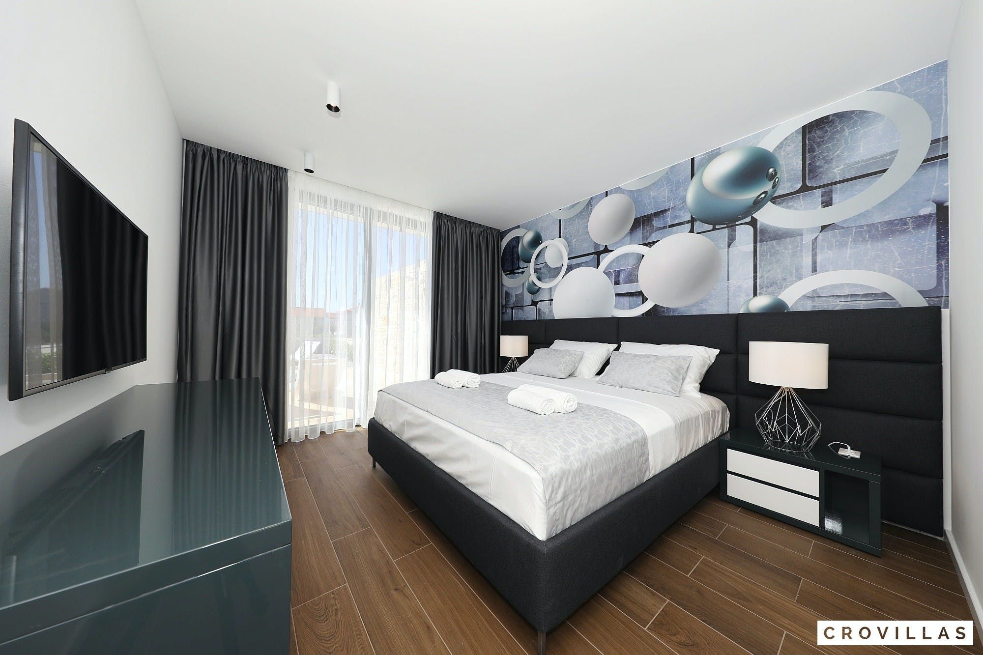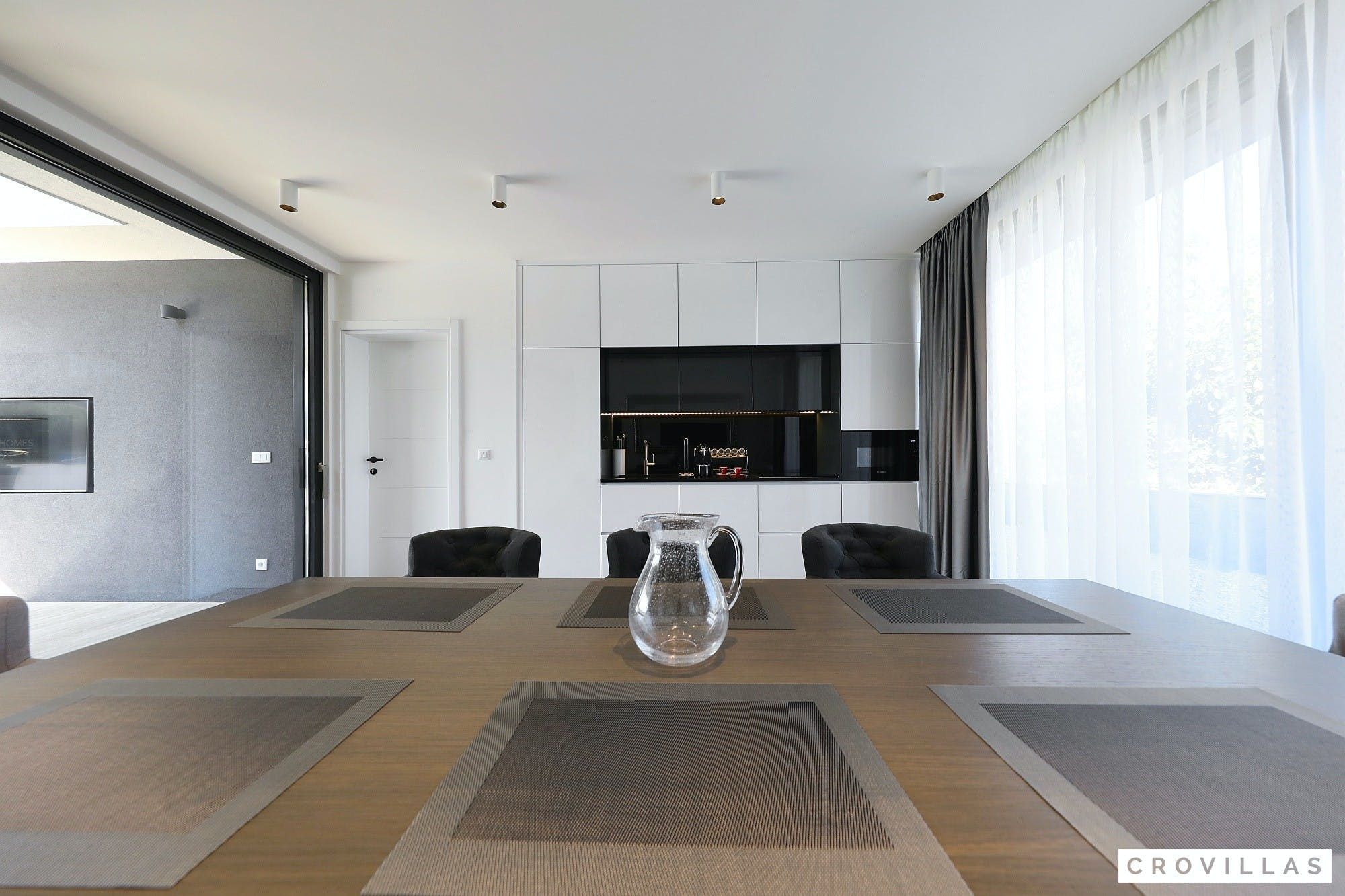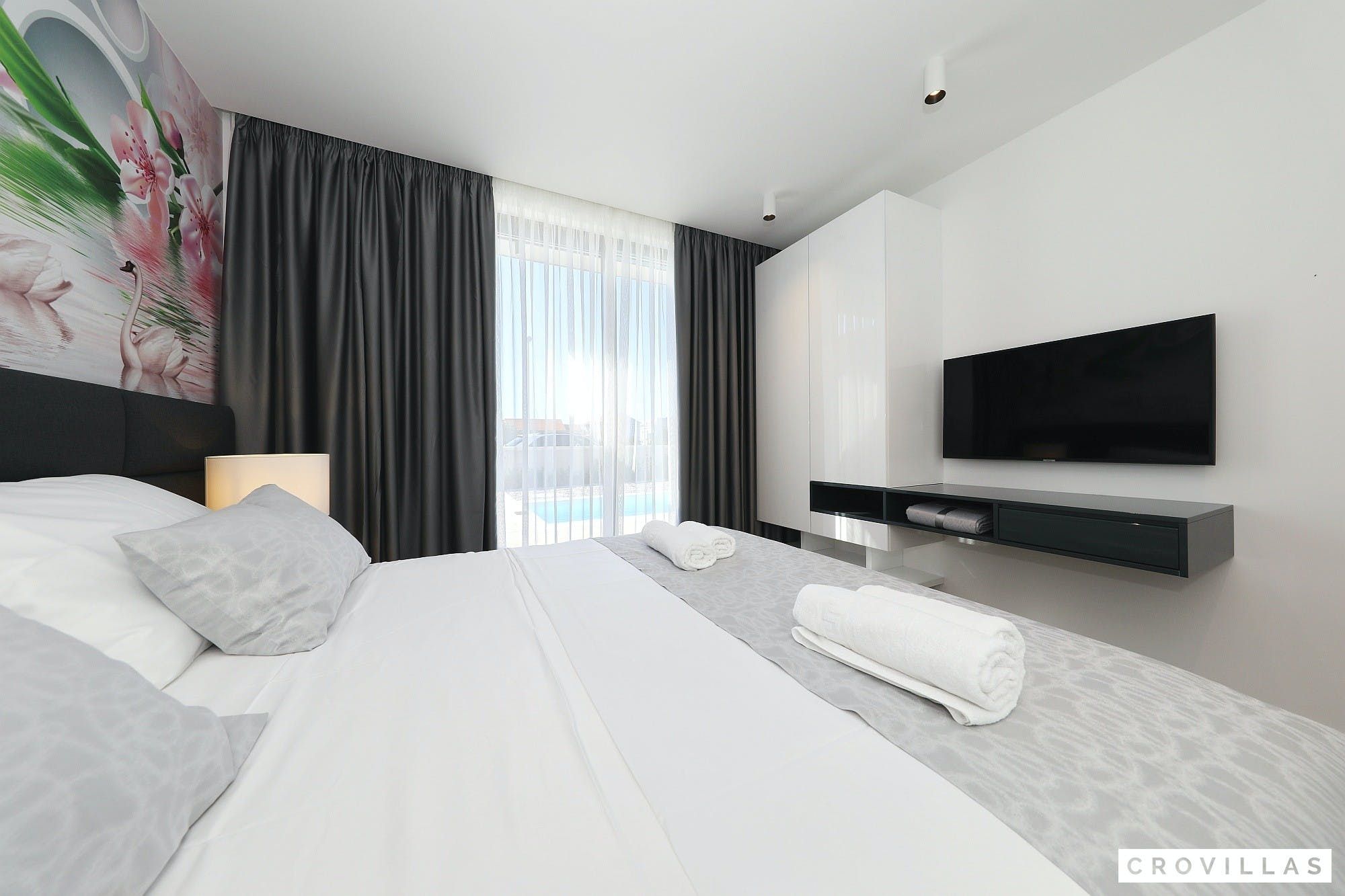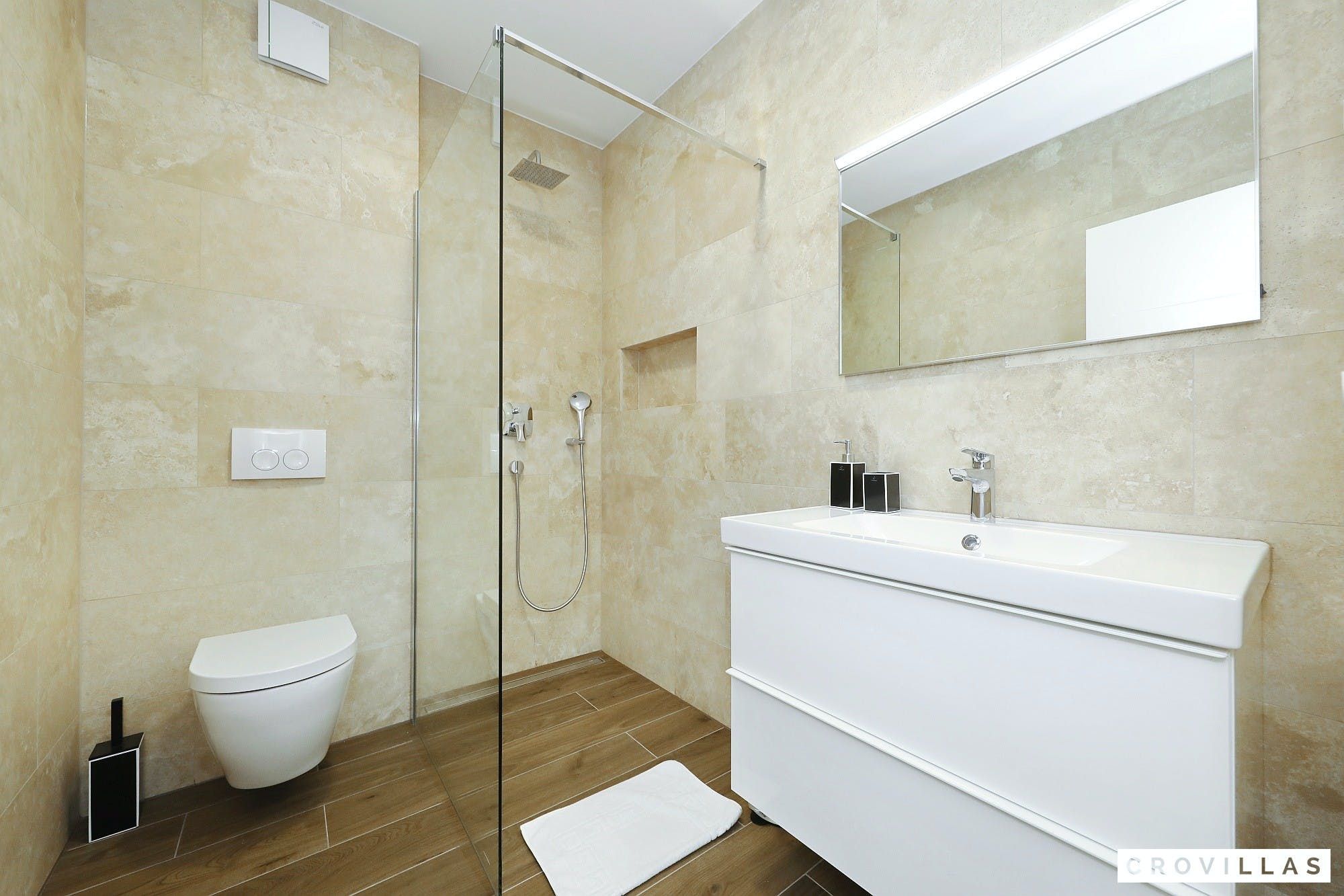 Experience a luxurious holiday in the newly built villa, located on the beautiful island of Pasman. The modern low-rise building is just 200m away from the beach, complete with a bar and bistro. The outdoor area offers a stylish seating area and a 7.60m pool for refreshing swims and lounging on the shallow platform. The roofed terrace features an outdoor living room with comfortable lounge furniture and a TV recessed into the wall for entertainment. The 90 sqm interior boasts a modern design with stylish furnishings, white, grey, and black harmonies, and a glass front exit to the outdoor living room. The kitchen area is fully equipped for self-catering days. Three bedrooms with double box-spring beds offer majestic rest periods, two of which share a bathroom while one has an en suite bathroom. Enjoy indoor temperatures all year round with air conditioning and underfloor heating, wireless internet, and satellite connection.