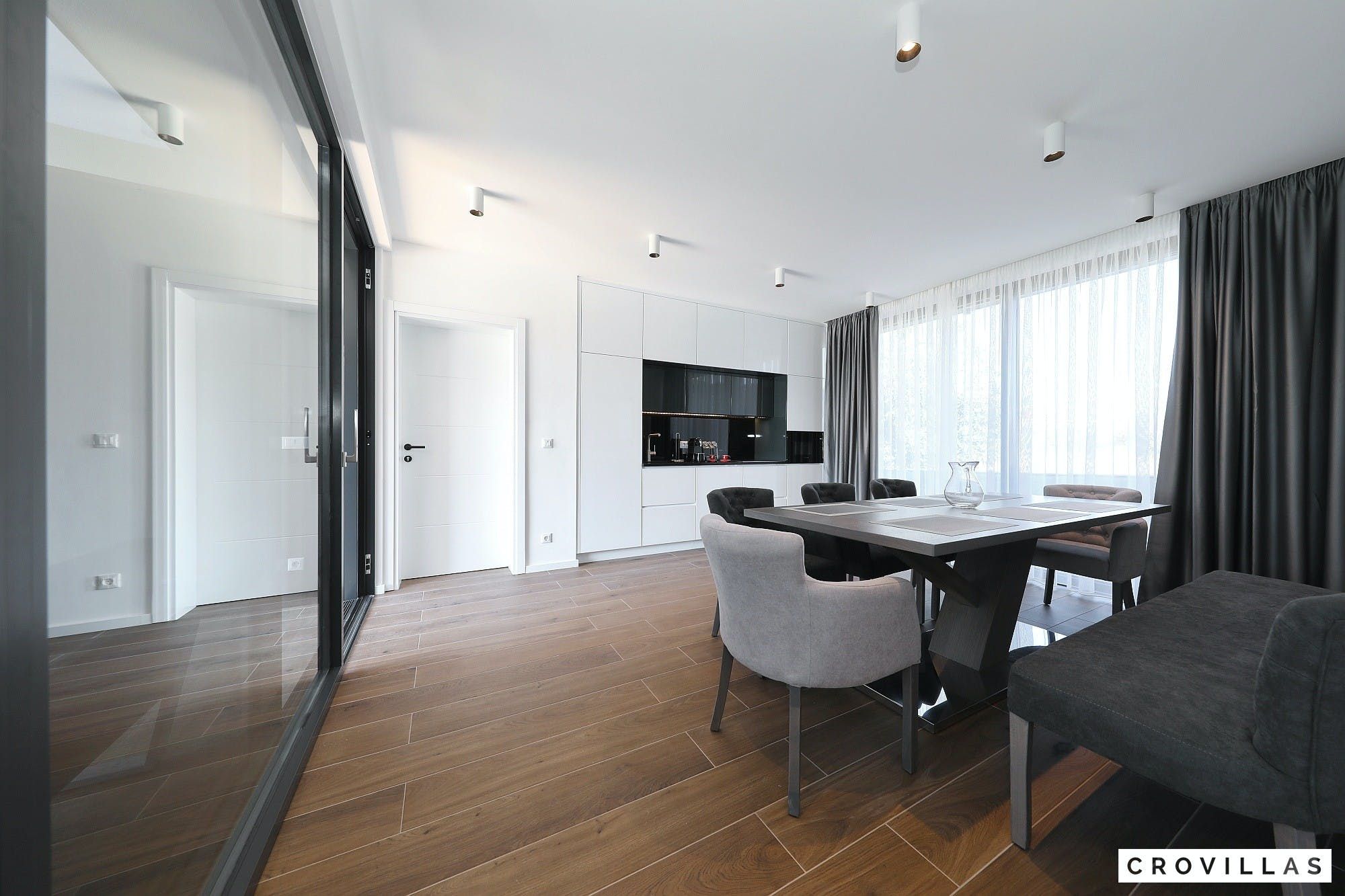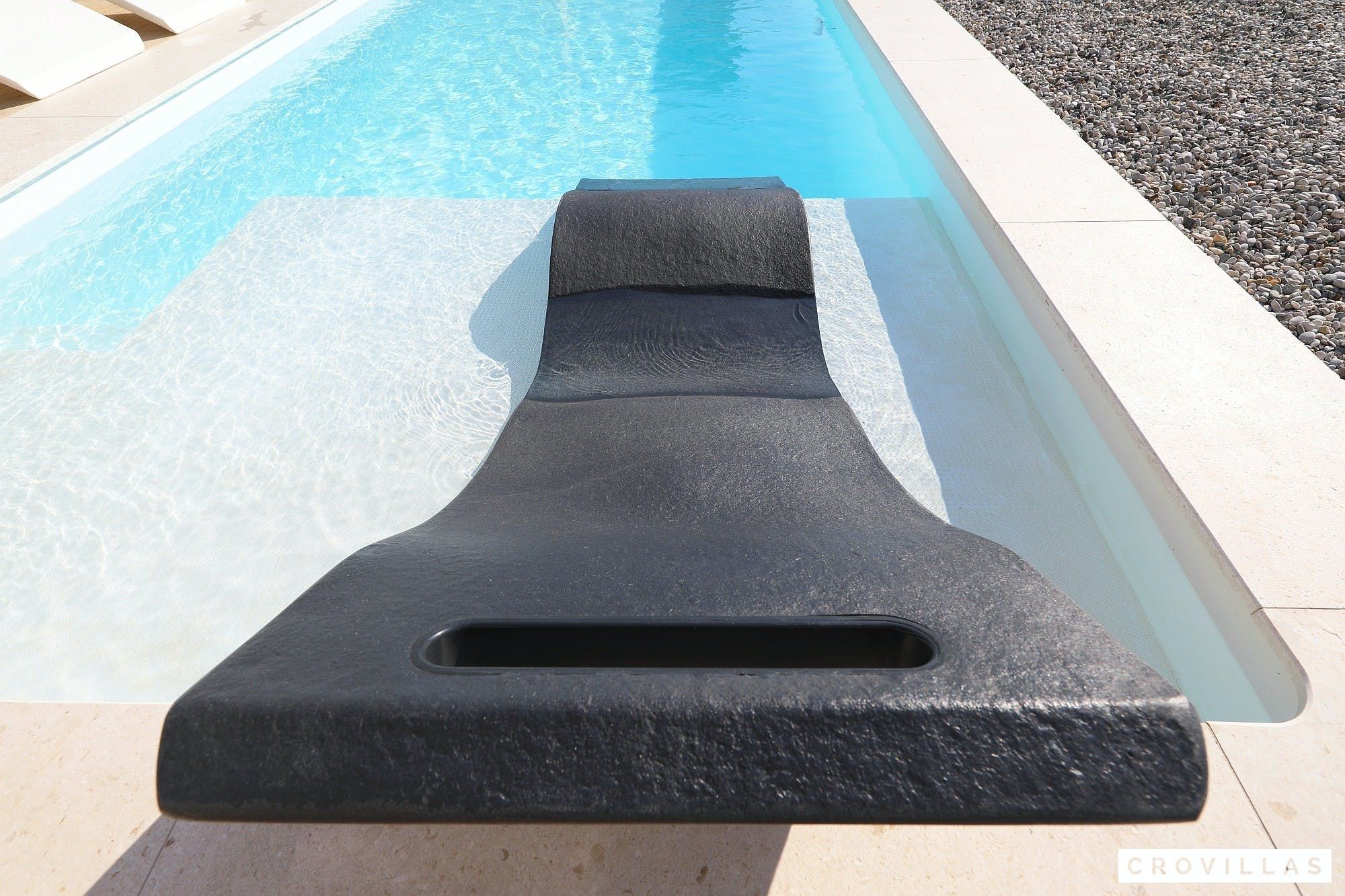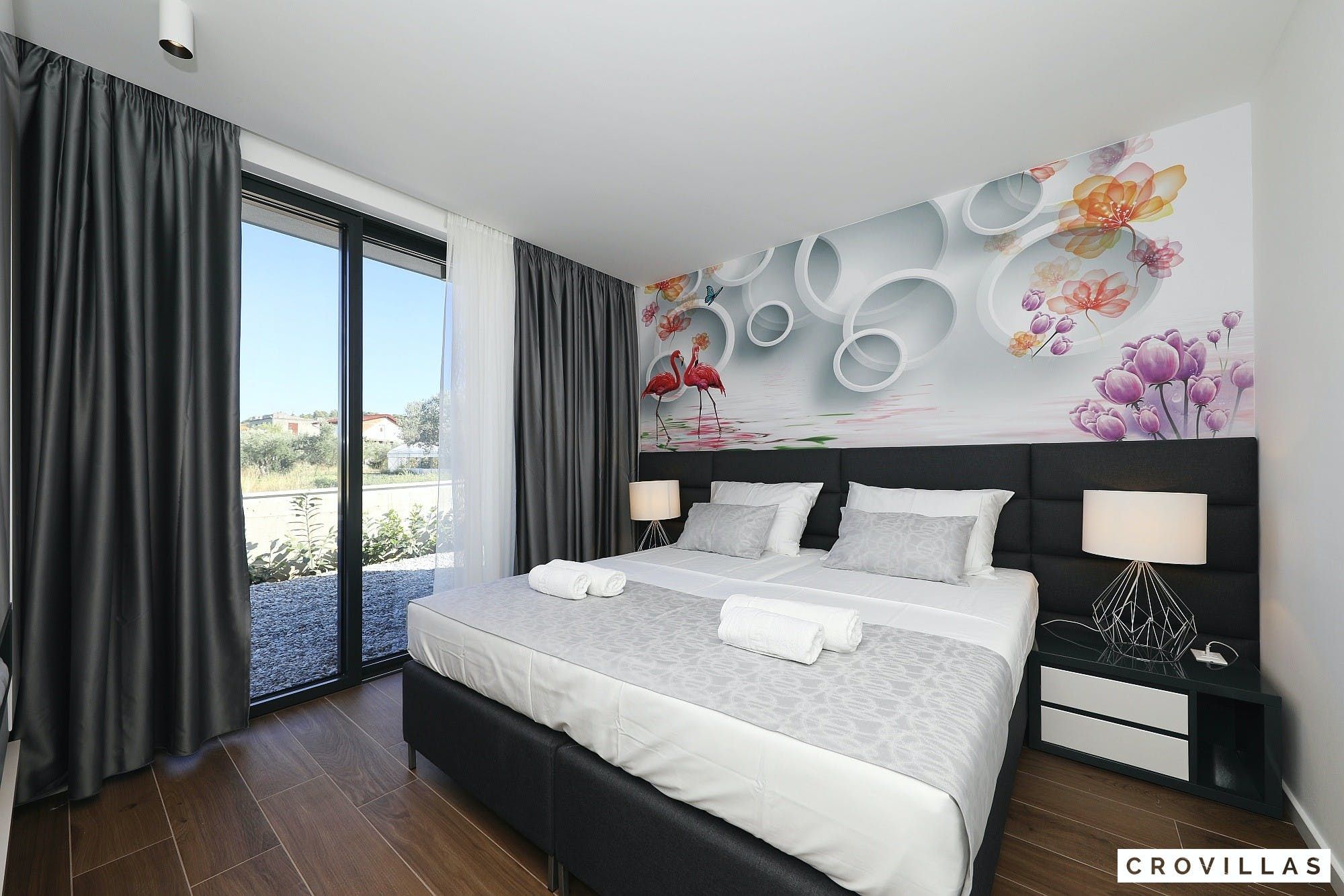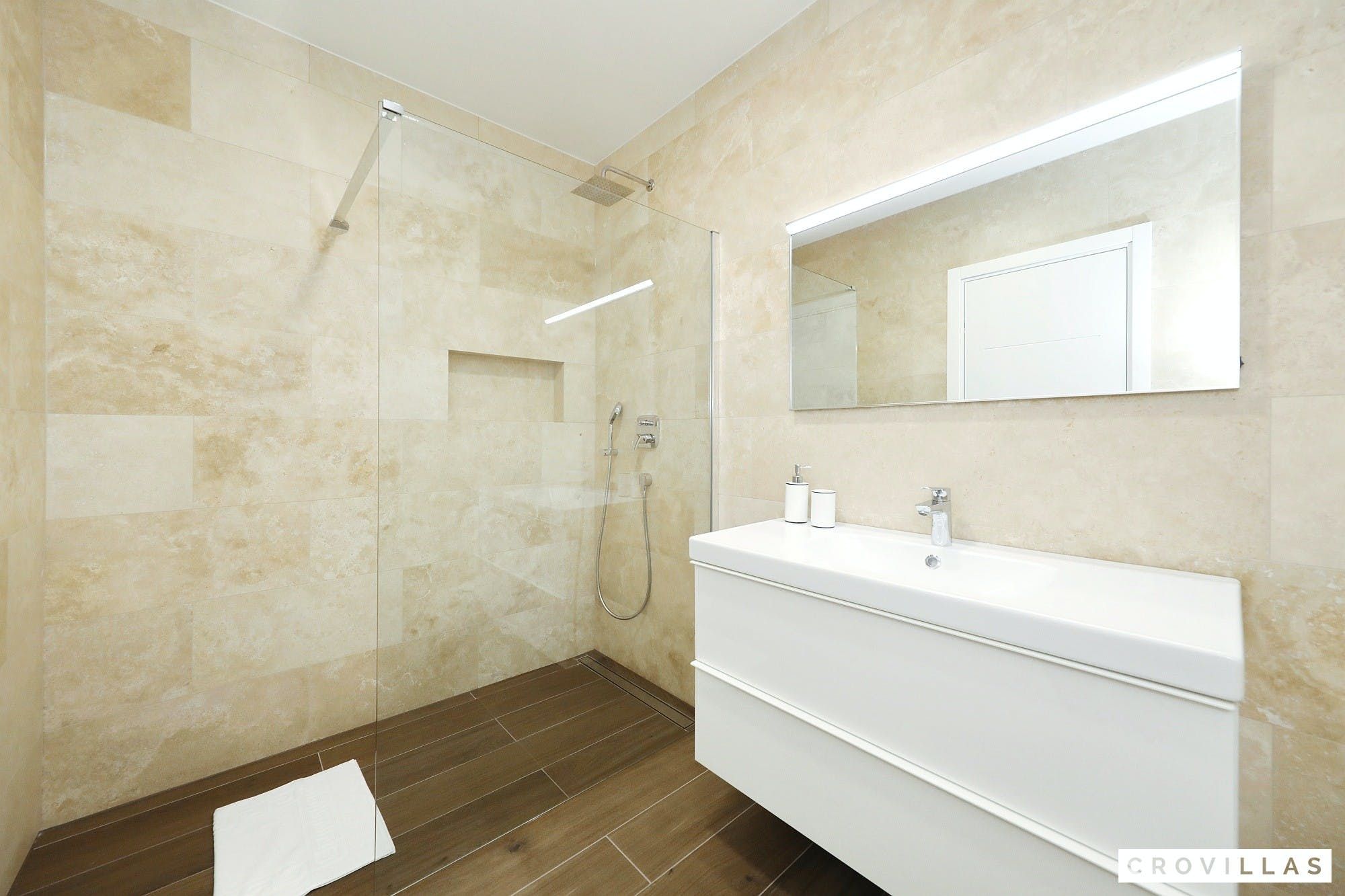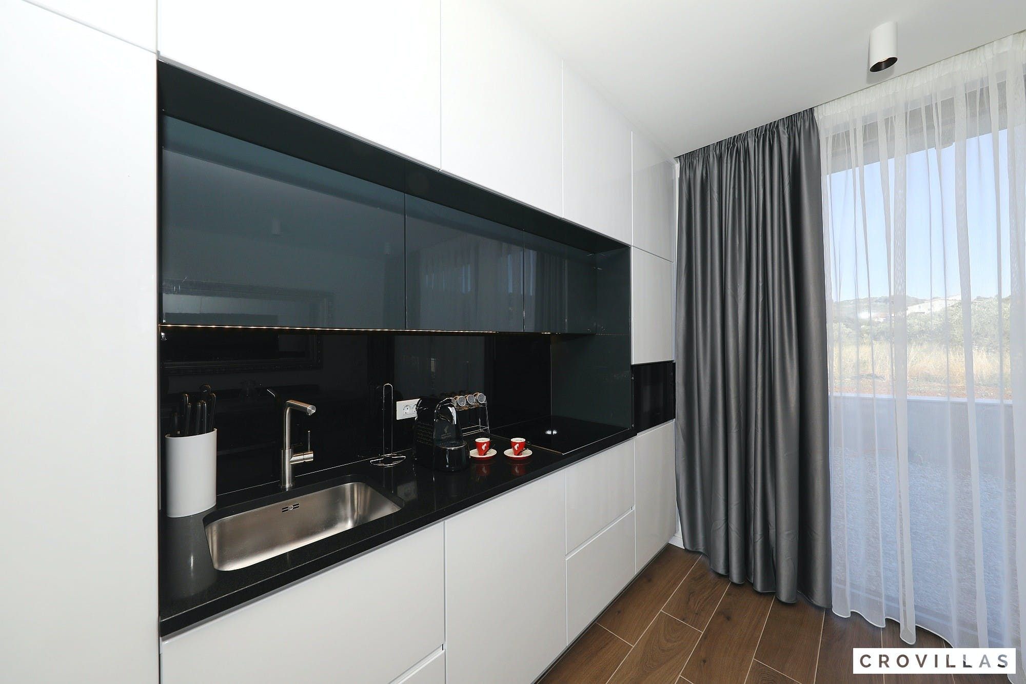 Experience a luxurious holiday in the newly built villa, located on the beautiful island of Pasman. The modern low-rise building is just 200m away from the beach, complete with a bar and bistro. The outdoor area offers a stylish seating area and a 7.60m pool for refreshing swims and lounging on the shallow platform. The roofed terrace features an outdoor living room with comfortable lounge furniture and a TV recessed into the wall for entertainment. The 90 sqm interior boasts a modern design with stylish furnishings, white, grey, and black harmonies, and a glass front exit to the outdoor living room. The kitchen area is fully equipped for self-catering days. Three bedrooms with double box-spring beds offer majestic rest periods, two of which share a bathroom while one has an en suite bathroom. Enjoy indoor temperatures all year round with air conditioning and underfloor heating, wireless internet, and satellite connection.