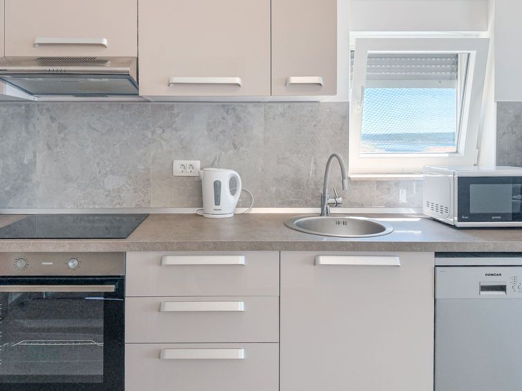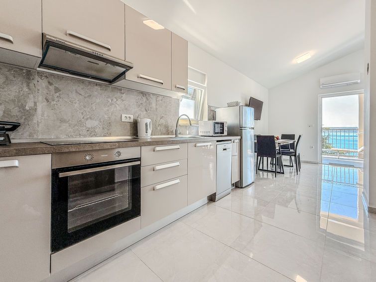 3-room apartment 55 m2, on the top floor, south-west facing position. Living/dining room 16 m2 with satellite TV (flat screen), air conditioning. 1 room with 2 beds (90 cm, length 200 cm), air conditioning. 1 room with 1 french bed (160 cm, length 200 cm), air conditioning. Open kitchen (oven, dishwasher, 4 ceramic glass hob hotplates, toaster, kettle, microwave, electric coffee machine) with air conditioning.