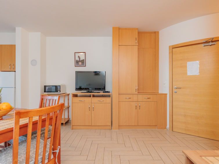 2-room apartment 54 m2, on the ground floor. Living/dining room with 1 double sofabed and satellite TV (flat screen), air conditioning. Exit to the terrace. 1 room with 1 double bed. Open kitchen (oven, 4 ceramic glass hob hotplates, microwave, freezer, electric coffee machine). Shower/WC.