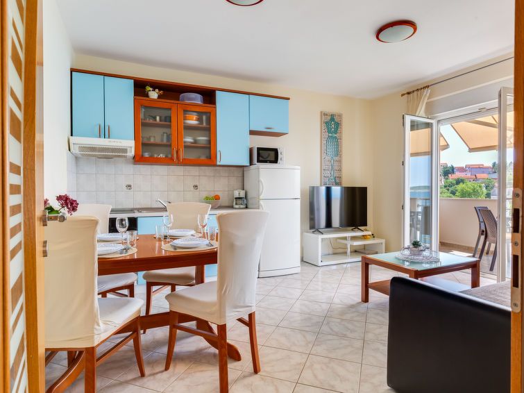 "Daria 2", 2-room apartment 45 m2 on 2nd floor. Living/dining room 18 m2 with 1 sofabed, satellite TV and air conditioning. Exit to the balcony. 1 room with 1 double bed. Exit to the balcony. Open kitchen (4 hot plates, oven, dishwasher, freezer). Shower/bidet/WC. No heating option.