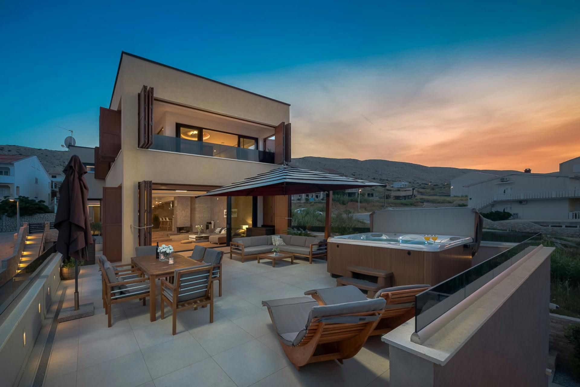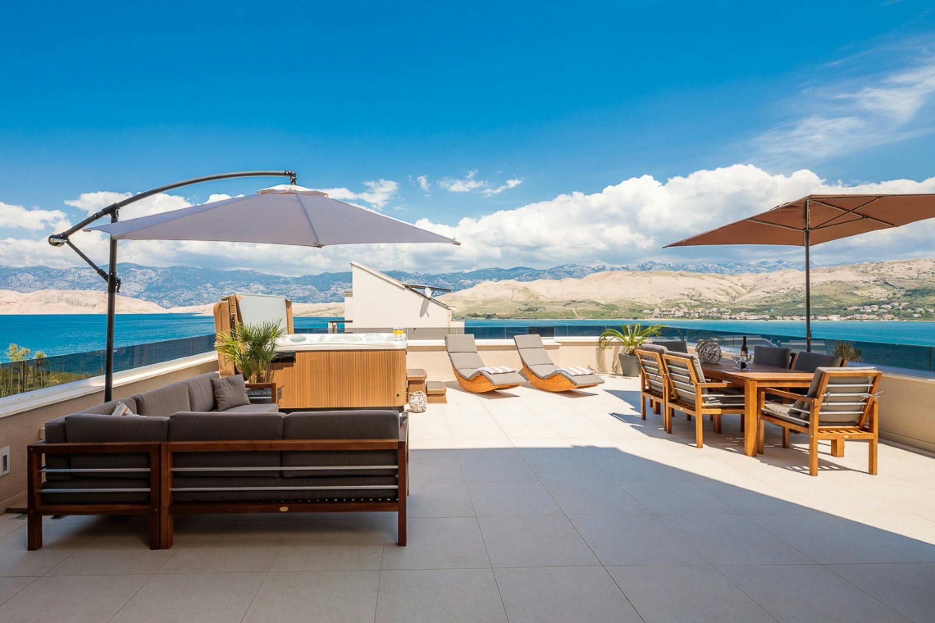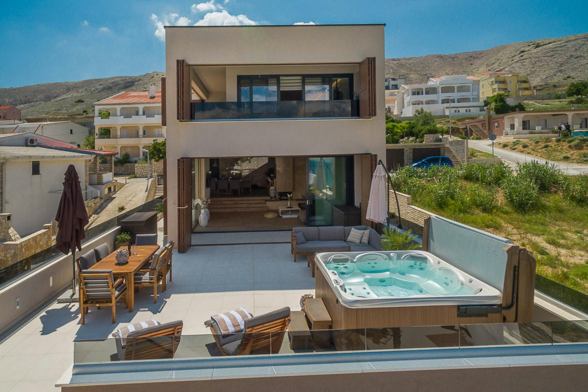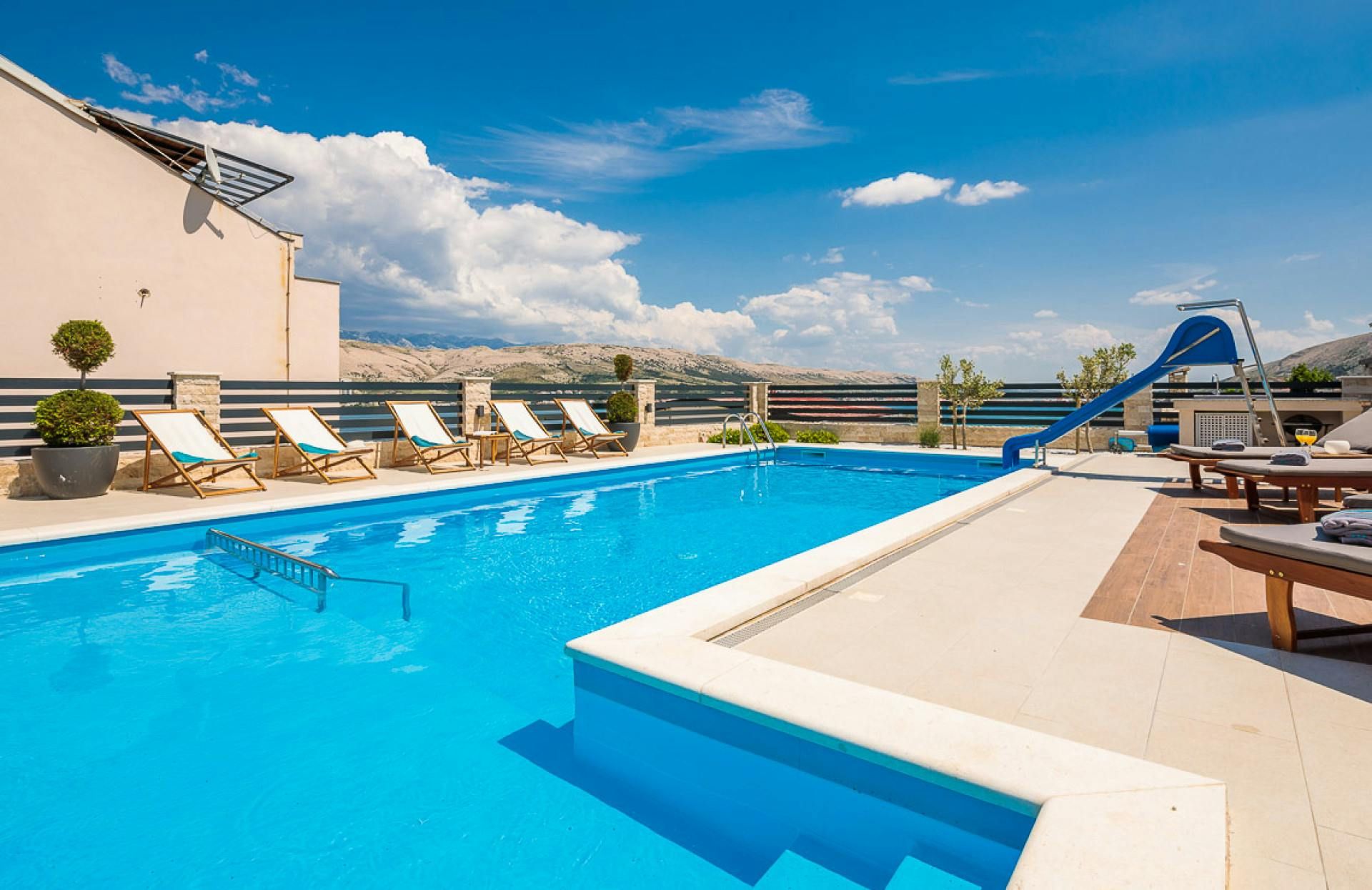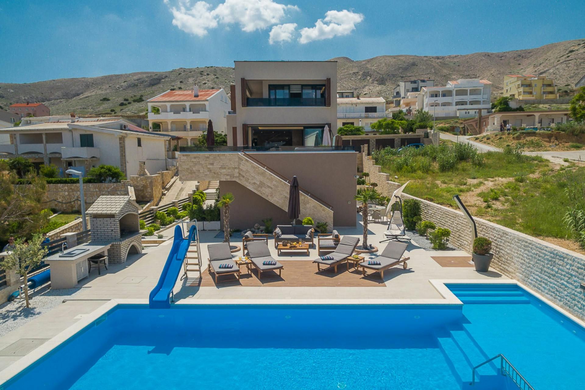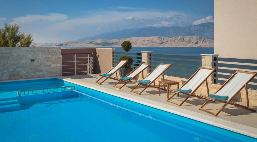 Just moments from the beach in Pag, this villa will wow you with its views. Whether you're swimming in the private pool, soaking in the hot tub or relaxing on the terrace or balcony, the island's blue waters and famous moonlike landscape stretch out in front of you. Spread across three floors, including three separate apartments, it’s well-suited for group stays. A pool slide and playground make it family-friendly, while an indoor sauna adds extra relaxation. You're only a one-minute stroll to the beach, while Pag's local restaurants, bars and shops are less than ten minutes away in the car.