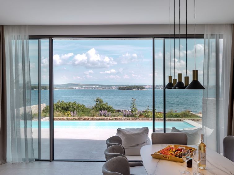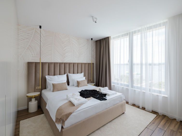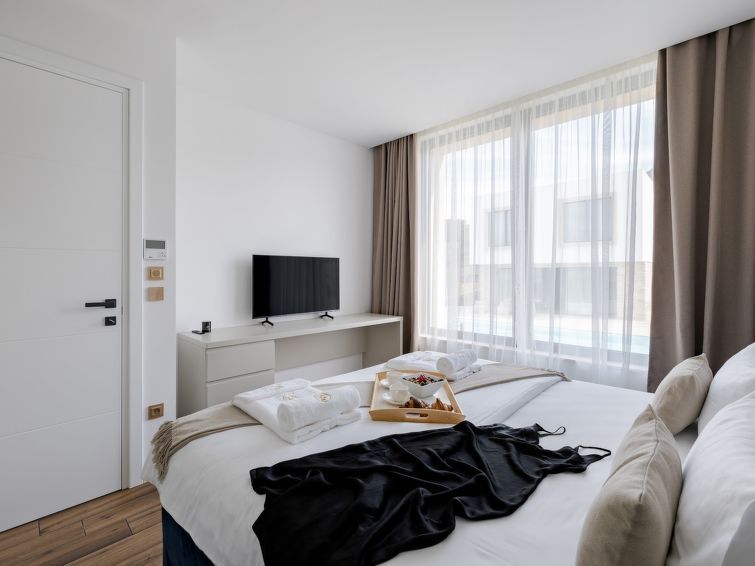 4-room villa 185 m2 on 2 levels. Living/dining room with satellite TV (flat screen), air conditioning. Exit to the swimming pool. Open kitchen (dishwasher, 4 ceramic glass hob hotplates, toaster, kettle, microwave, freezer, electric coffee machine). Sep. WC. Upper floor: 1 room with Dressing room with 1 double bed (2 x 100 cm, length 200 cm), shower/WC and satellite TV (flat screen), air conditioning.