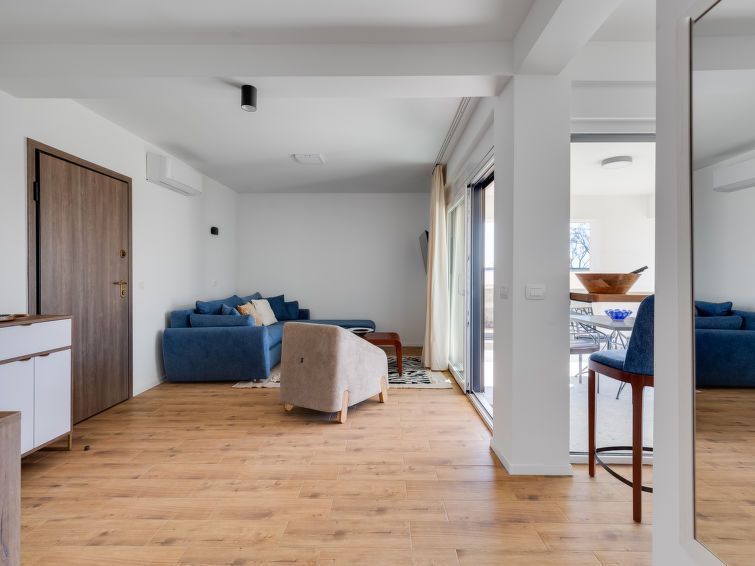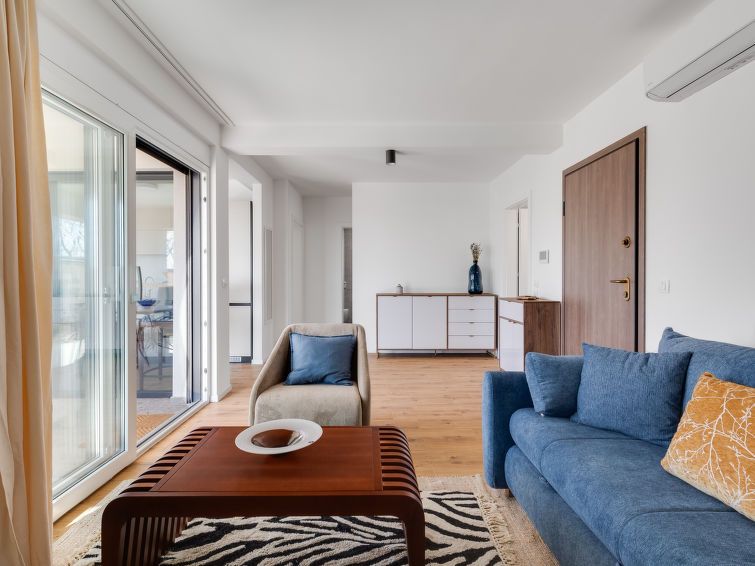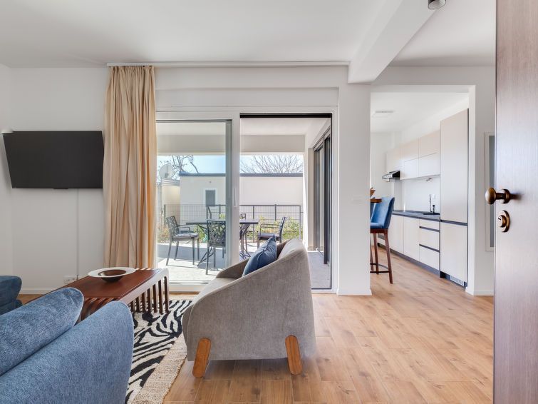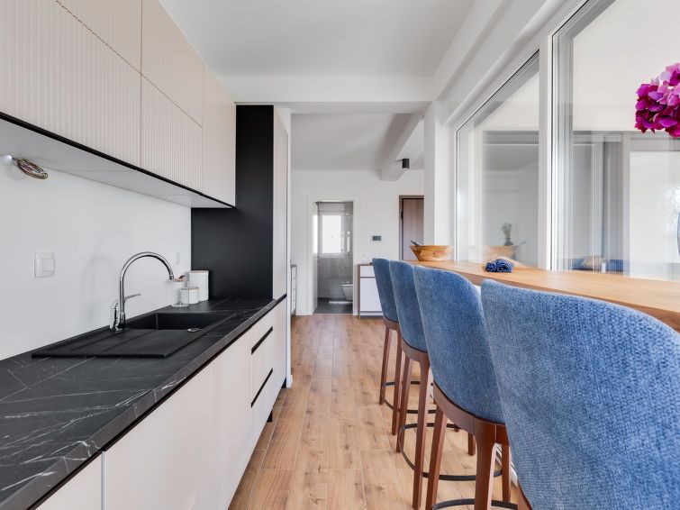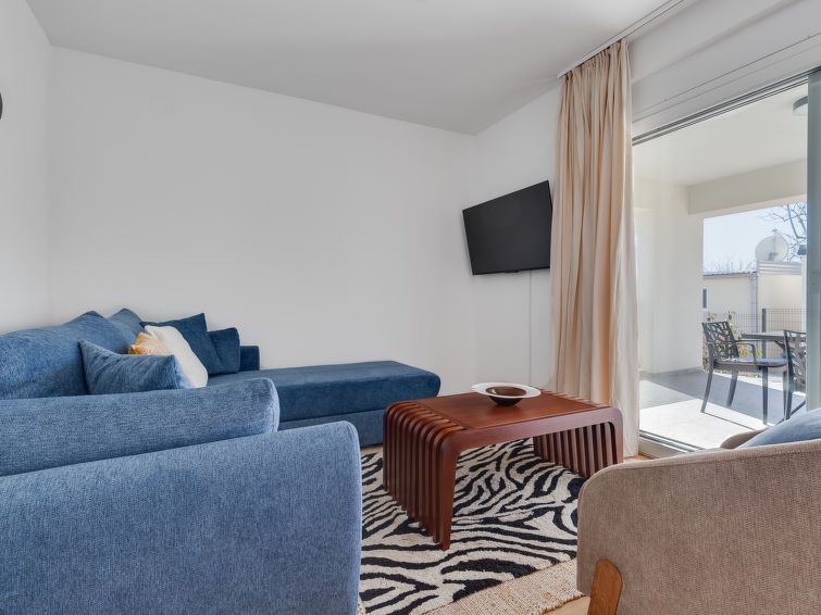 "Rue", 3-room apartment 72 m2, on the ground floor. Tasteful and cosy furnishings: living/dining room with satellite TV and cable TV (flat screen), air conditioning. Exit to the balcony. 1 room with 1 french bed (160 cm, length 200 cm). 1 room with 2 beds (90 cm, length 120 cm). Open kitchen (oven, dishwasher, 4 induction hot plates, electric coffee machine).