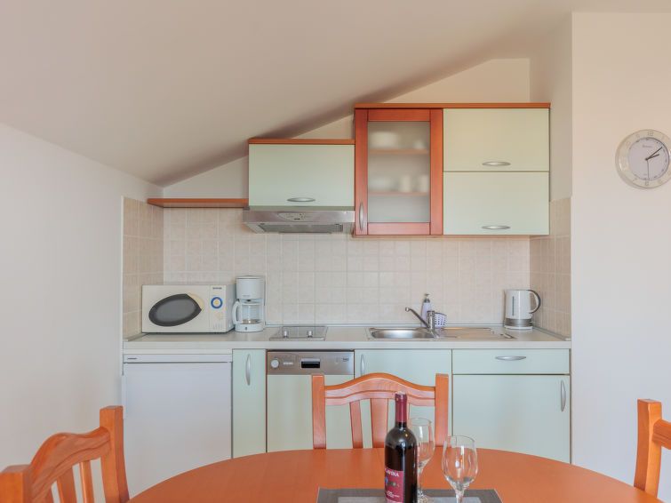 2-room apartment 40 m2 on 2nd floor. Living/dining room with sloping ceilings with 1 sofabed, satellite TV and air conditioning. Exit to the balcony. 1 room with 1 french bed (160 cm, length 200 cm). With sloping ceilings, open kitchen (2 hot plates, dishwasher, toaster, kettle, microwave, electric coffee machine).