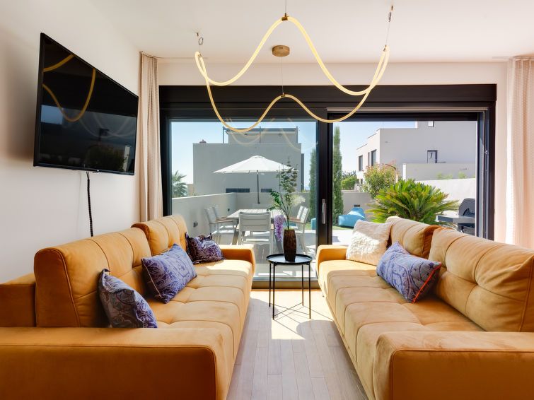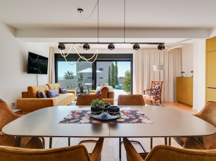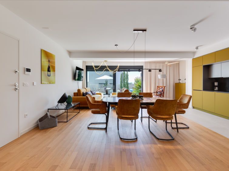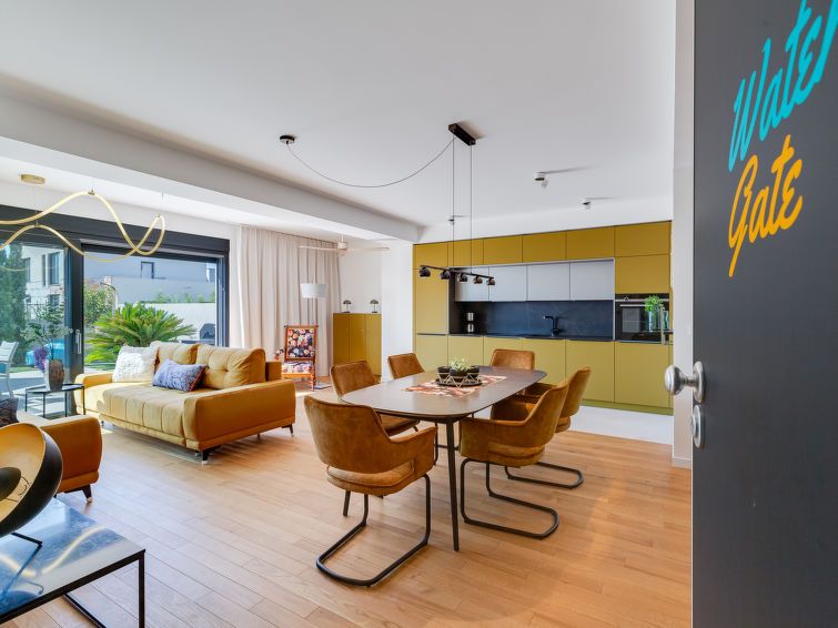 "Watergate", 3-room apartment 73 m2, on the ground floor. Very tasteful and stylish furnishings: living/dining room with 2 sofabeds (80 cm, length 190 cm), cable TV (flat screen), air conditioning, fan and electric shutters. Exit to the garden, to the terrace. 1 room with 1 french bed (160 cm, length 200 cm), cable TV (flat screen), air conditioning and electric shutters.